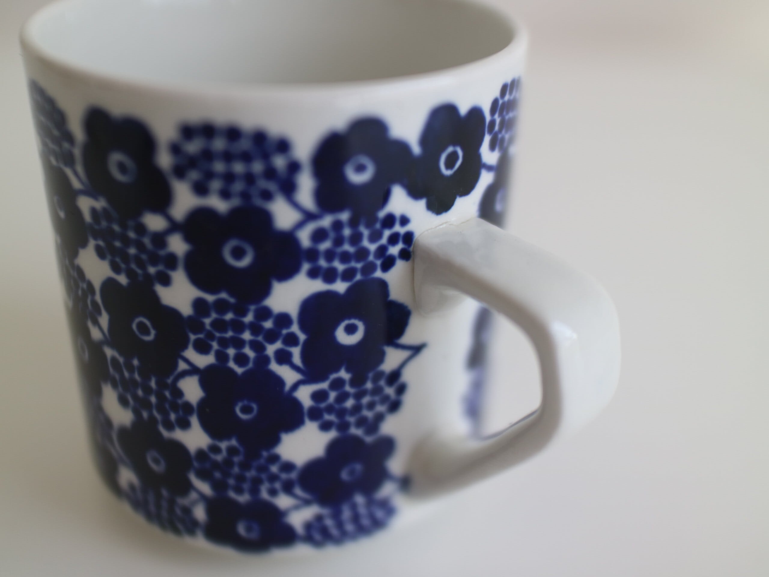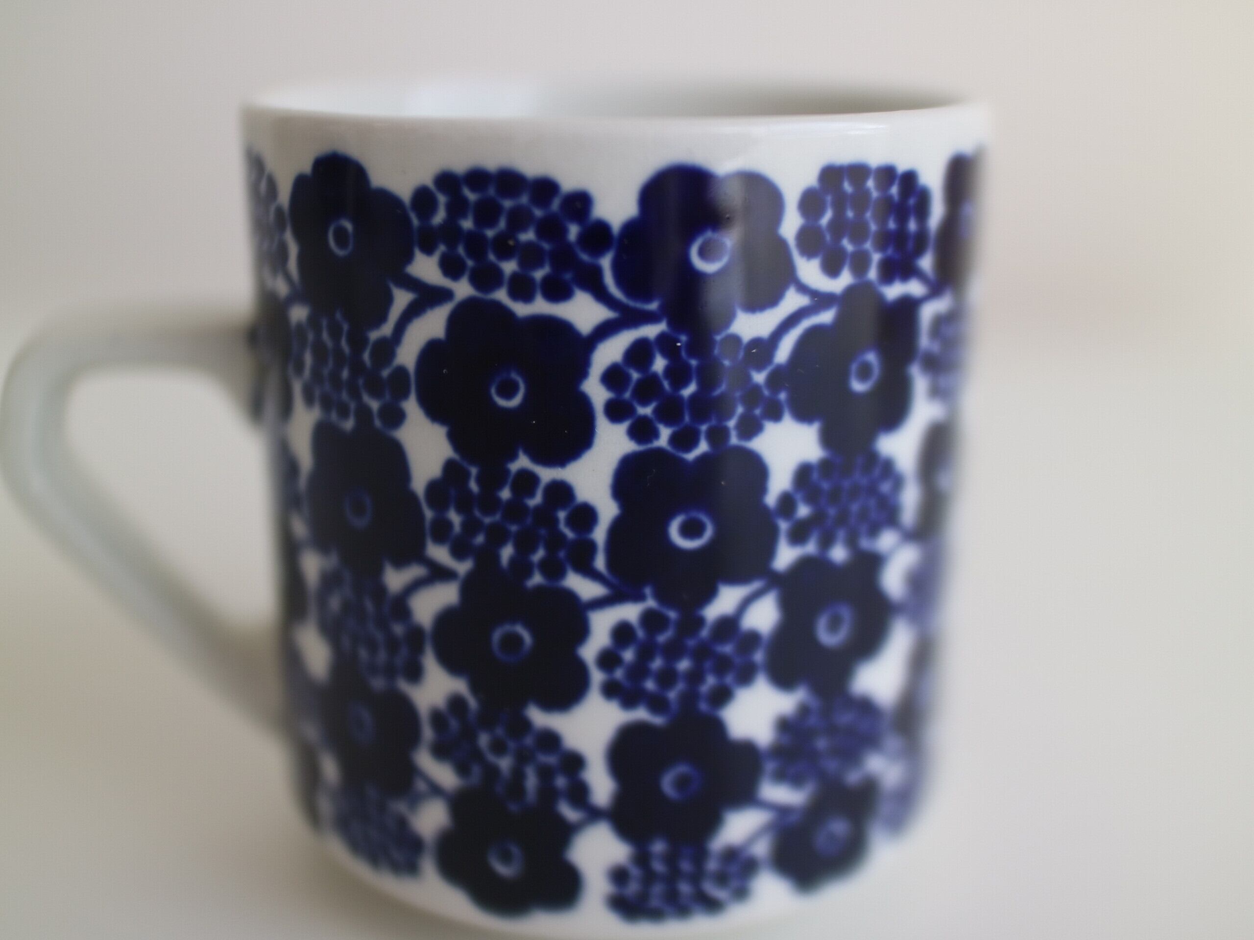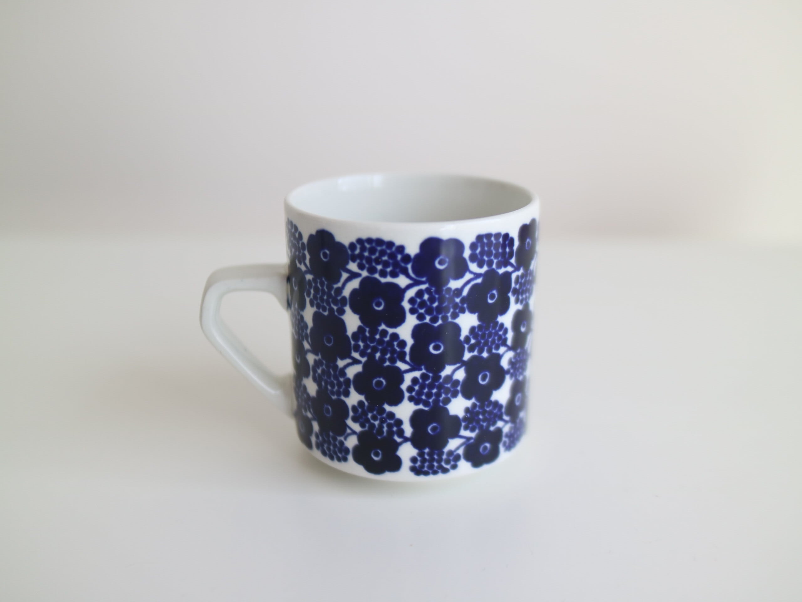 ARABIA社、Rypaleシリーズのコーヒーカップ&ソーサーです。フィンランド語のRypaleは『ぶどう』を意味します。デコレーションはRaija Uosikkinen(ライヤ・ウオシッキネン)。カップにはブルーの小花とベリーが描かれており、小ぶりでとても可愛いらしい作品です。