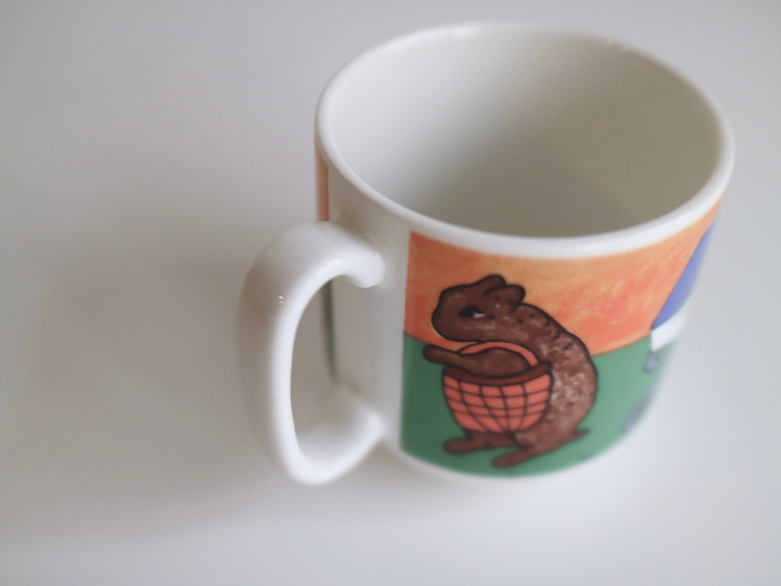 「Päiväkävelyllä お散歩」というタイトルの作品で、マグカップにはベビーカーでお散歩に出かけるウサギの親子や母親クマのお買い物、3匹のクマがボールで遊んでいる様子が描かれています。