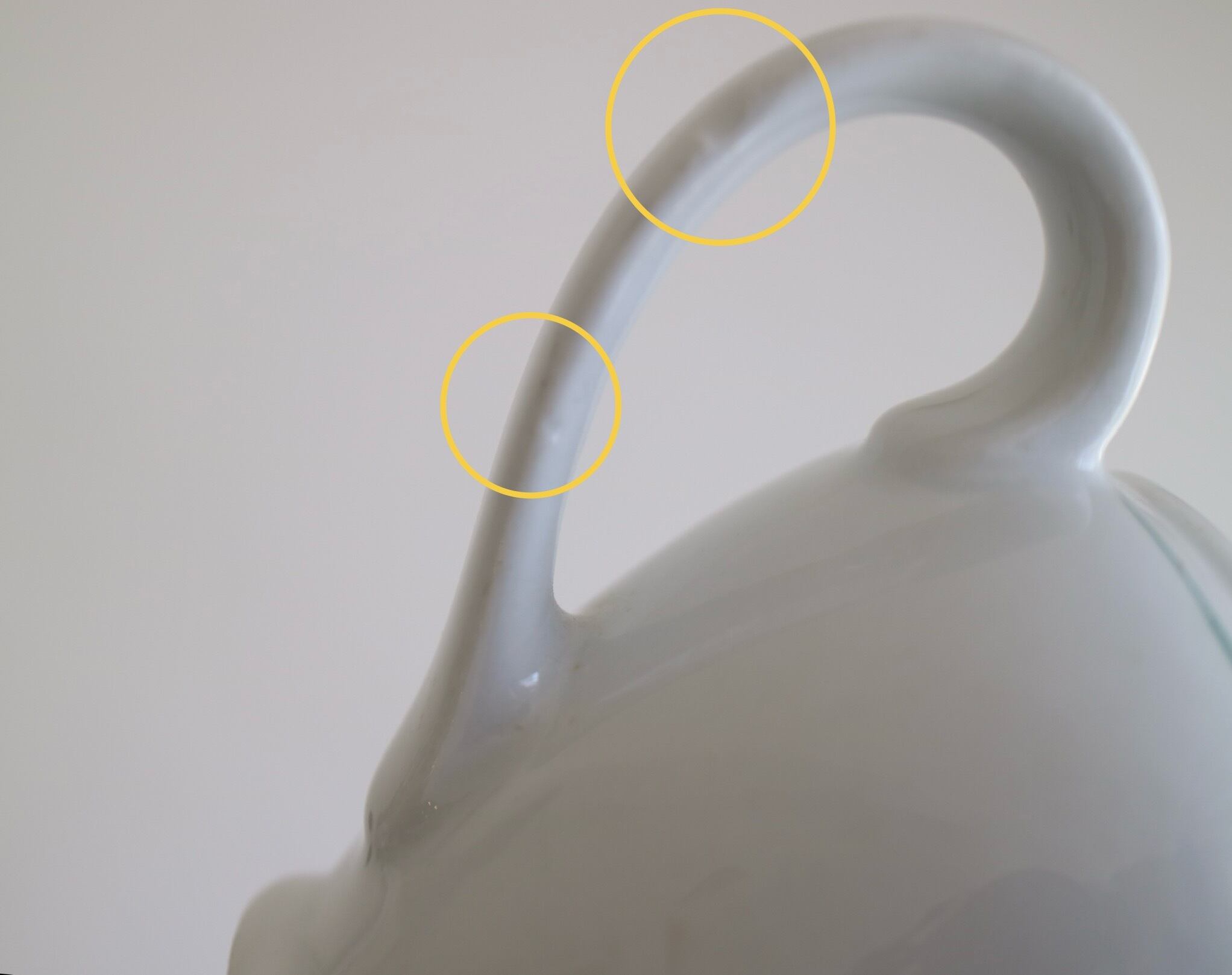 写真13-14枚目 持ち手に凹みが2ヶ所見受けられますが、上から釉薬がかかっておりツルツルした手触りです。欠けではなく製造時の凹みだと思われます。