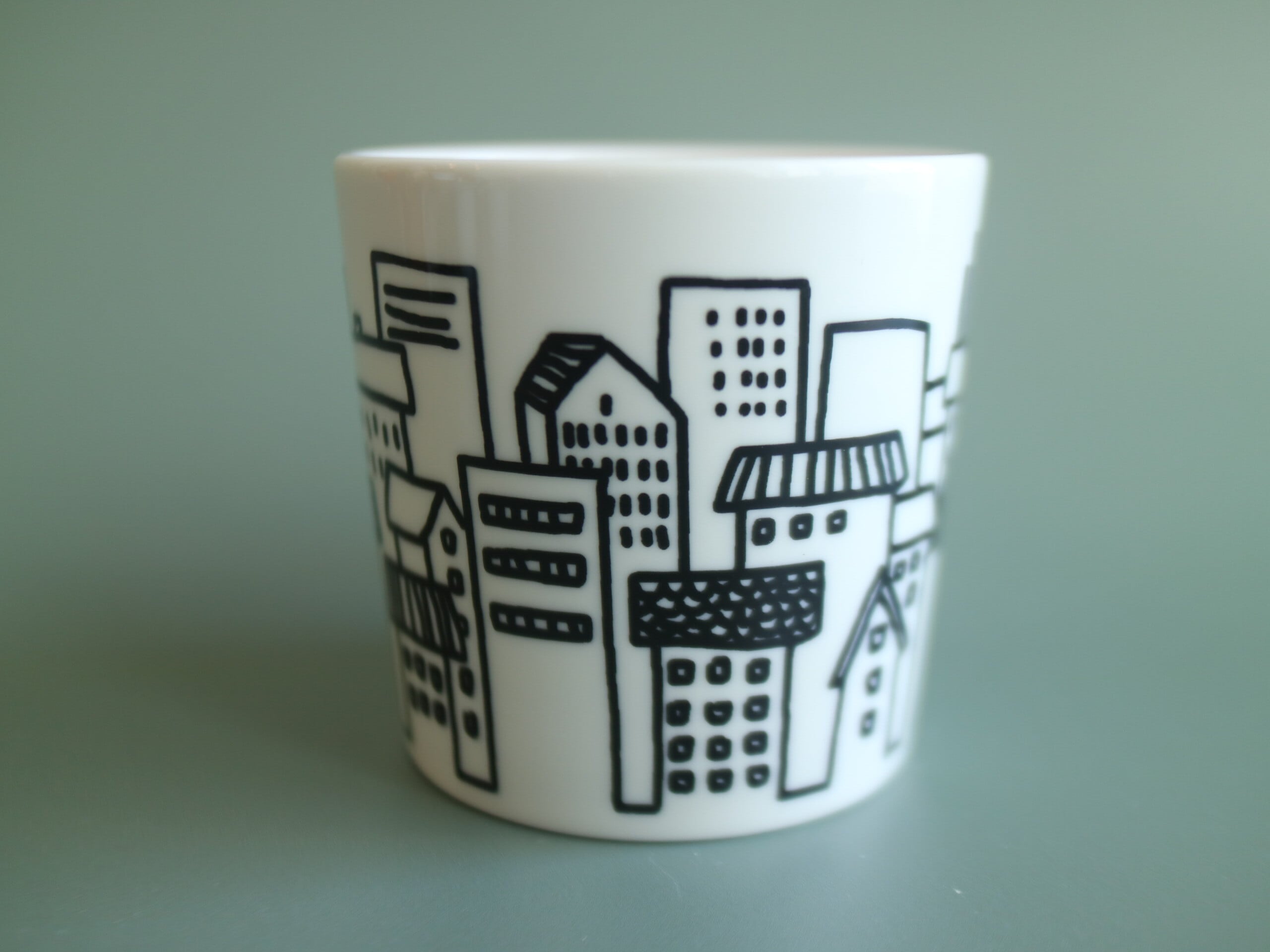 カップ表面には様々な家やビルが描かれ、ブラックとホワイトのみの落ち着いたらデザインです。