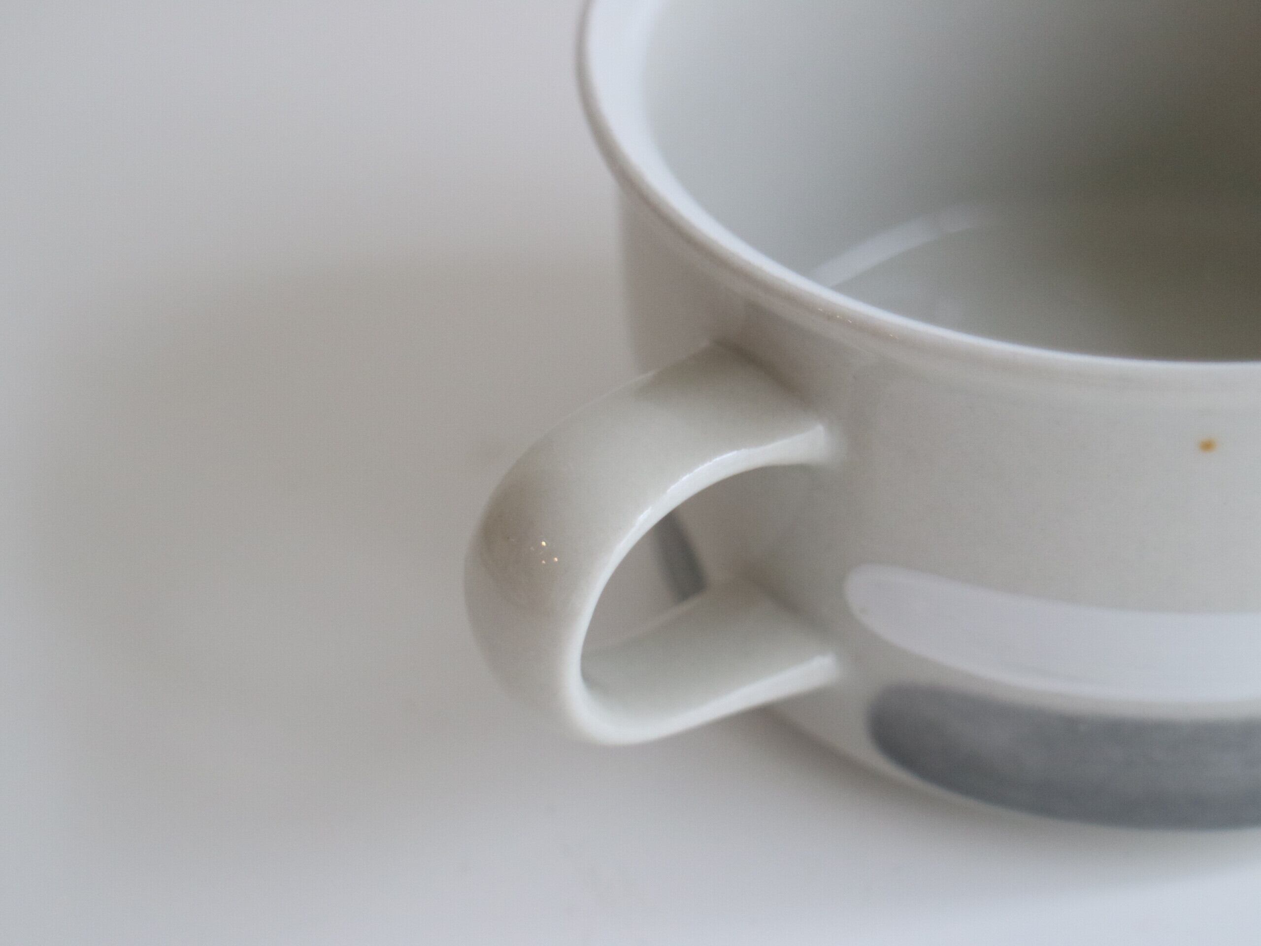 カップにはホワイト と 少しグリーンがかったグレーのラインがハンドペイントで描かれており、シンプルなデザインですが温もりも感じる作品です。