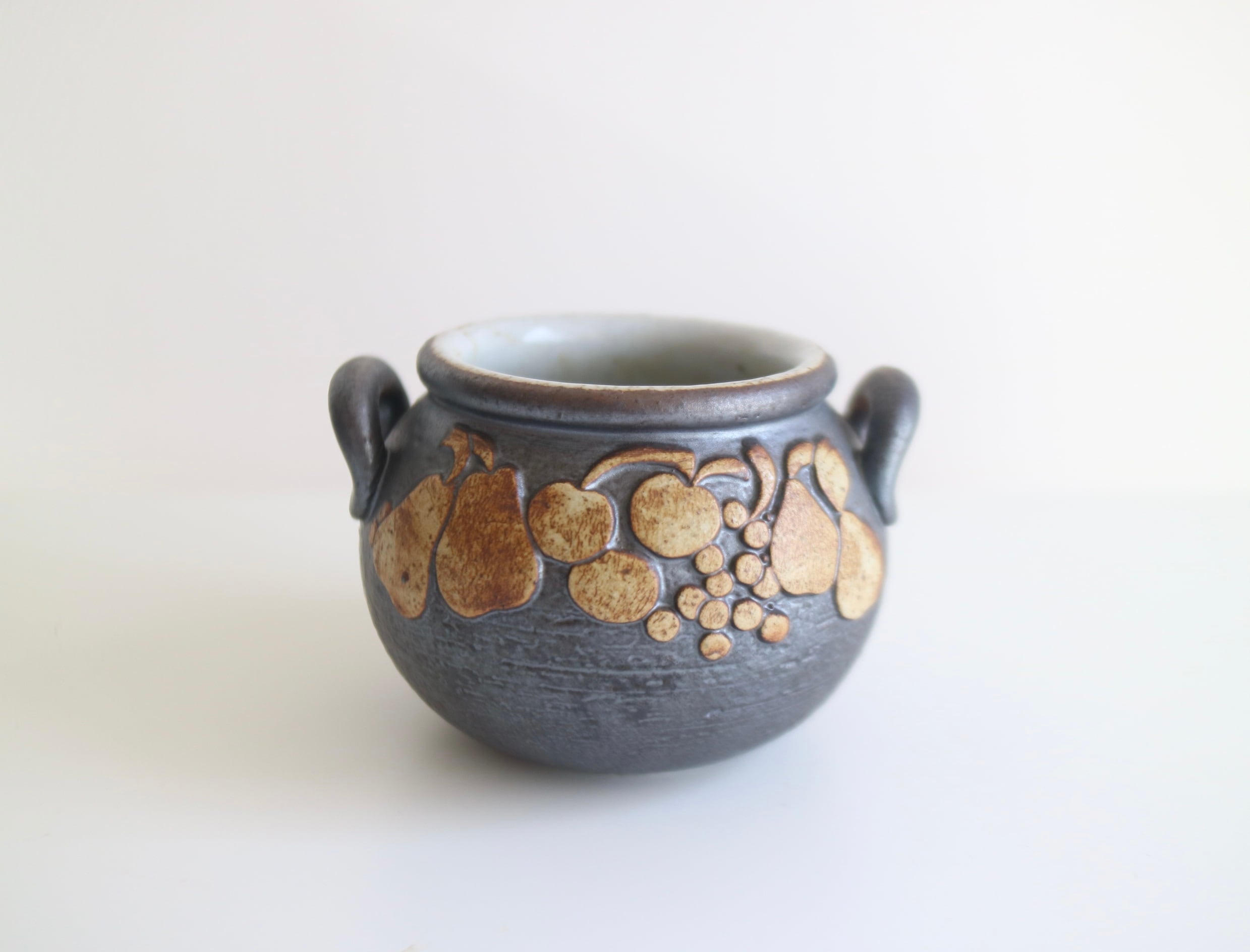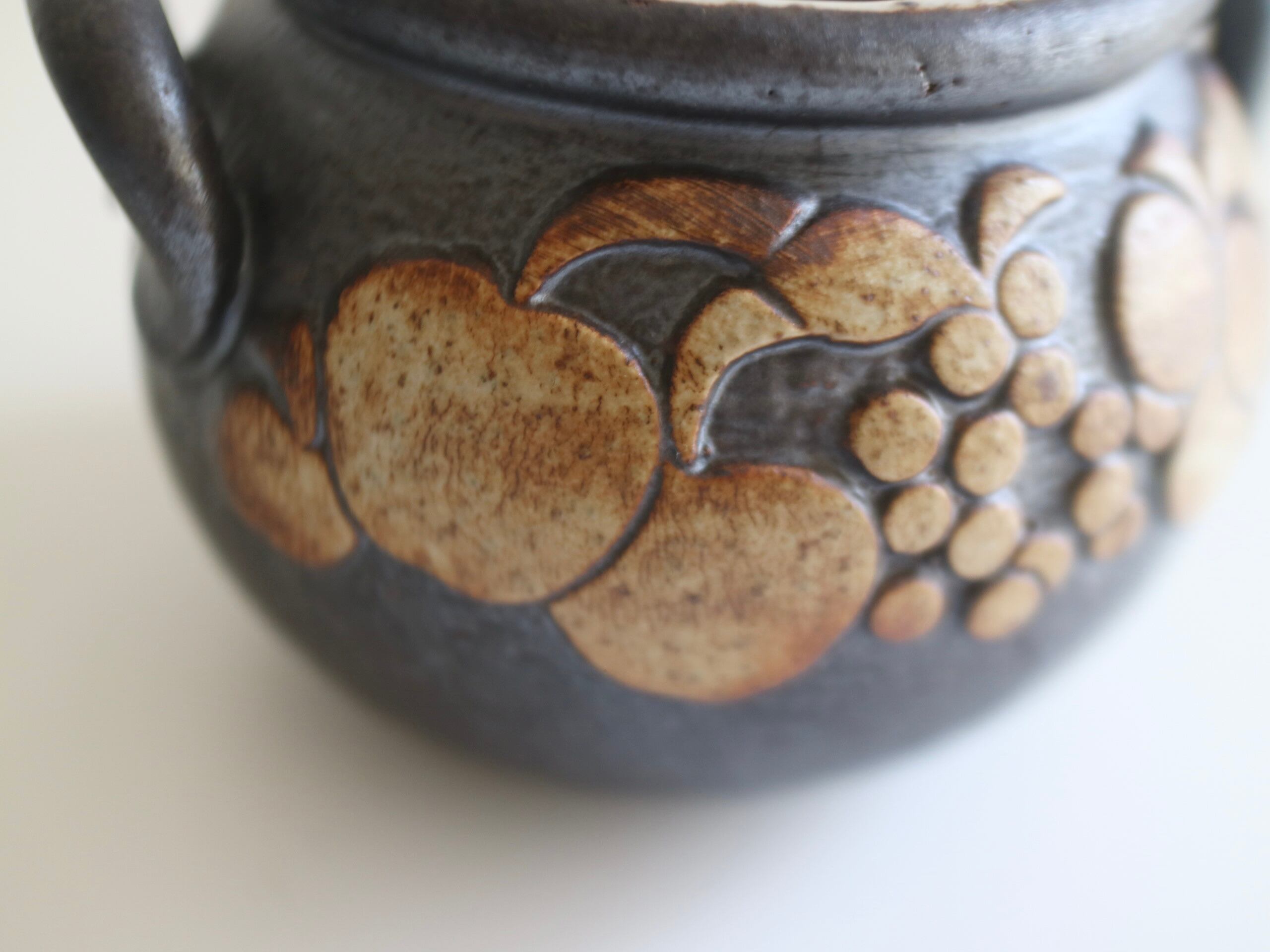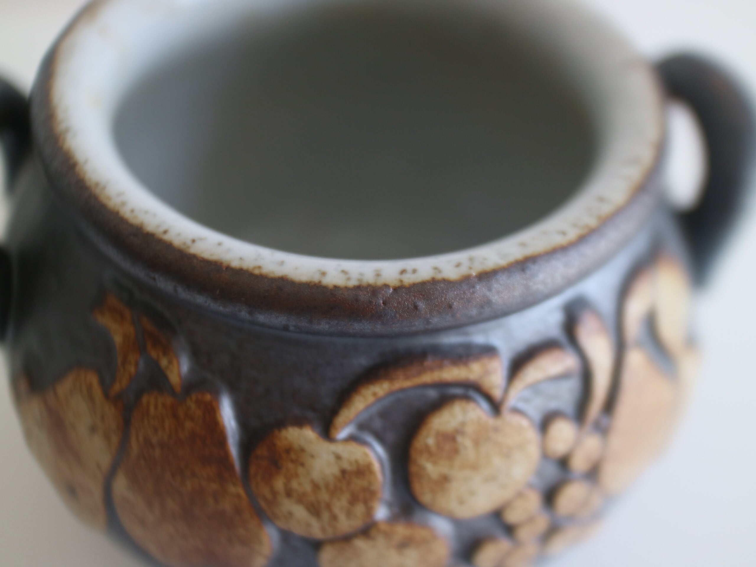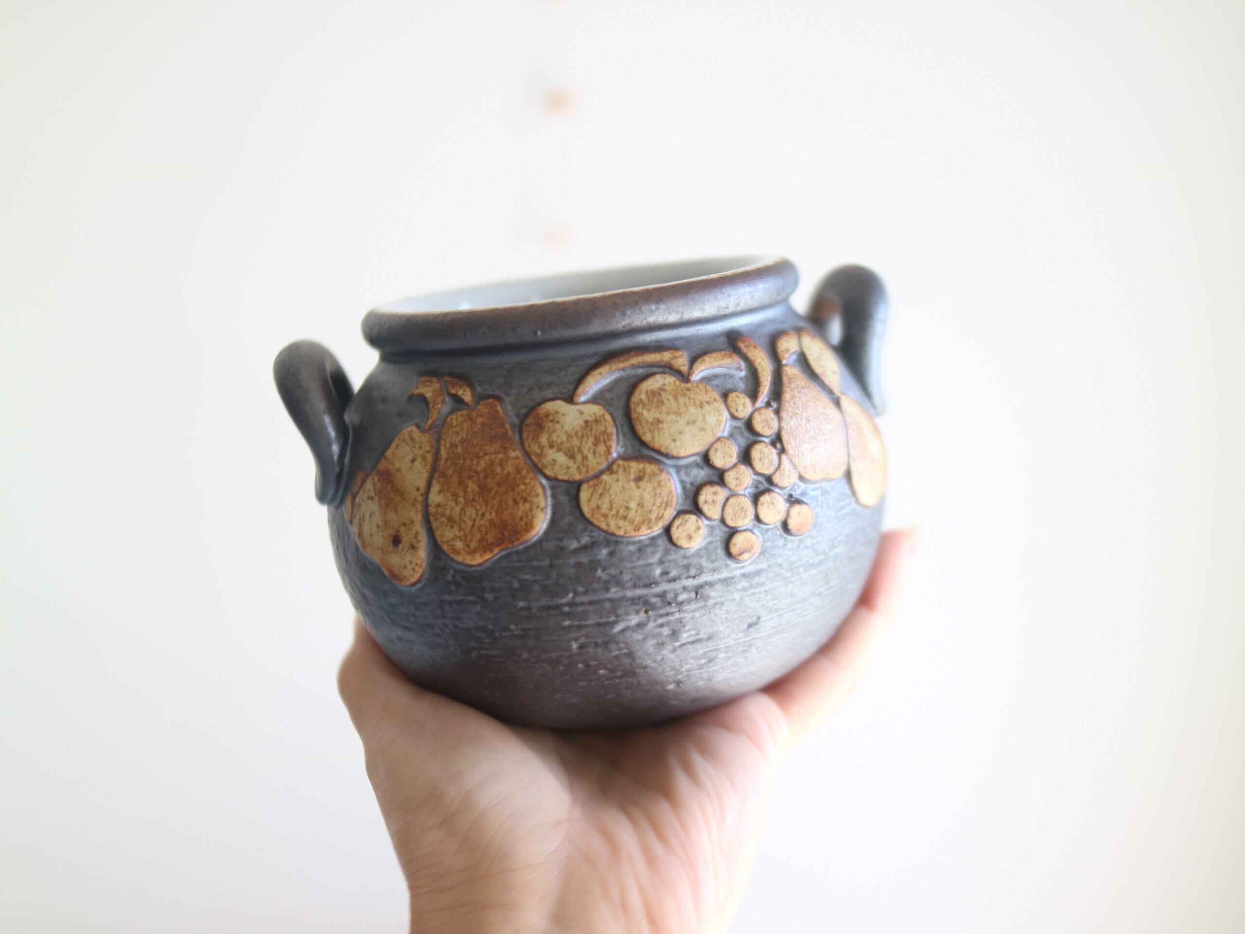ポットの縁に製造時に出来たピンホールがございます。これは素焼きの段階で器に含まれた空気が焼成時に釉薬の表面で気泡となって現れるもので欠陥ではございません。その他、ヒビや欠けのような大きなダメージはなく、とても良いヴィンテージコンディションを保っています。