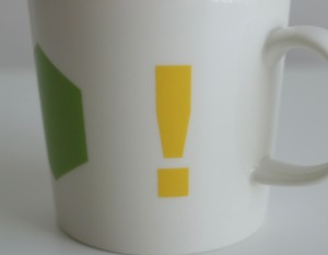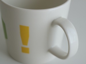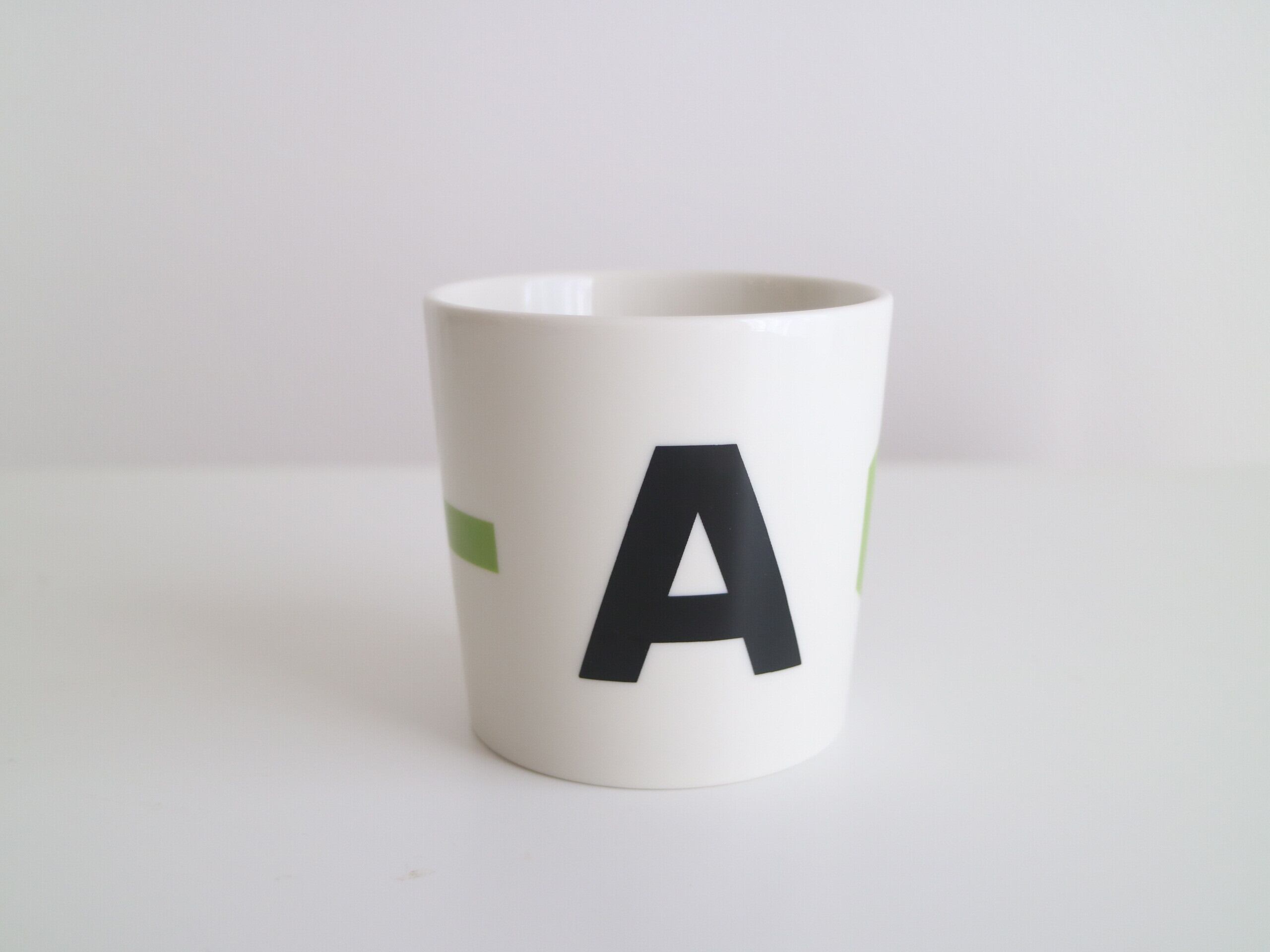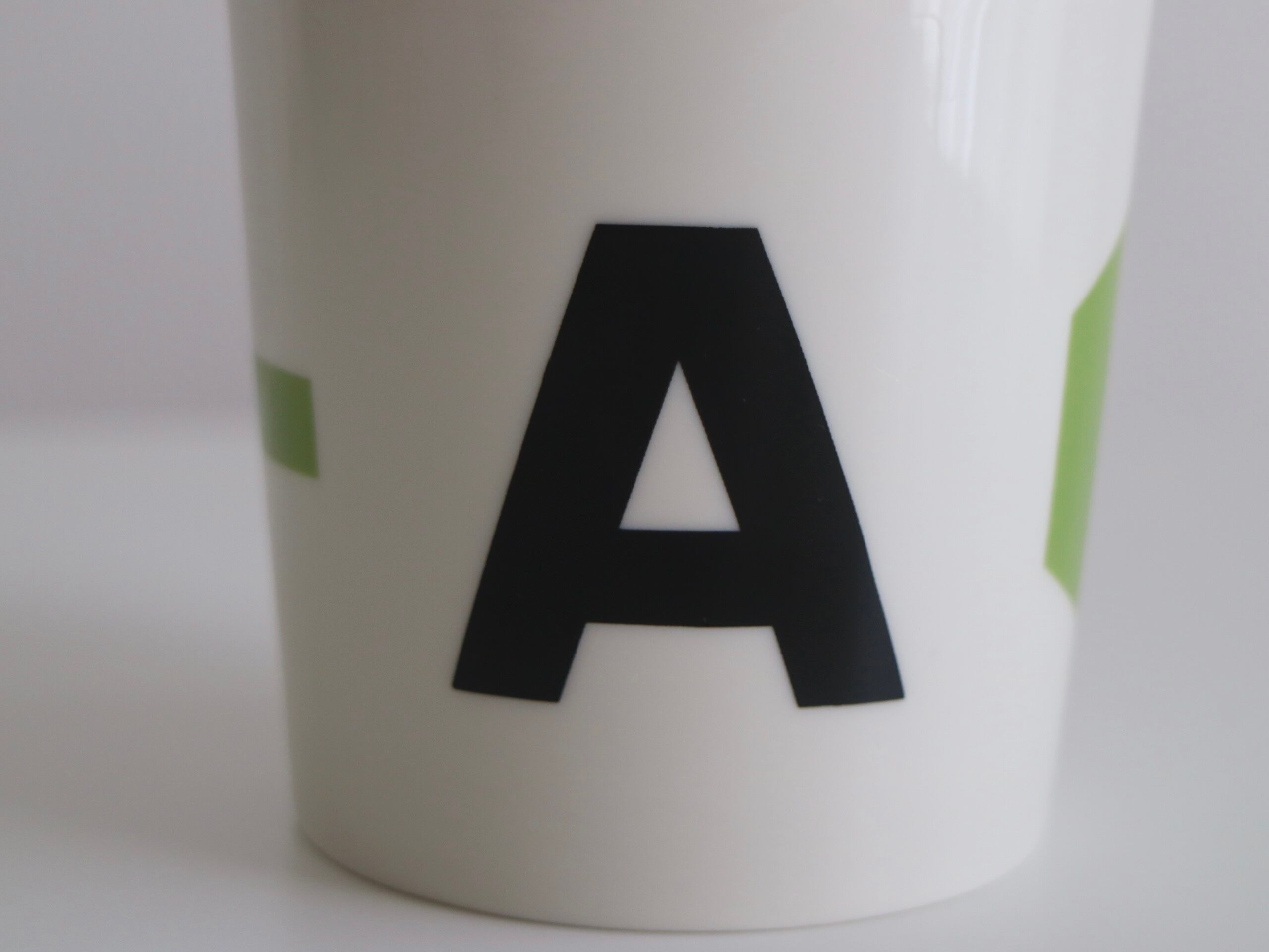 マグカップのフォルムは定番のTEEMAをベースに、表面にはポップな図形やアルファベットのAが描かれています。