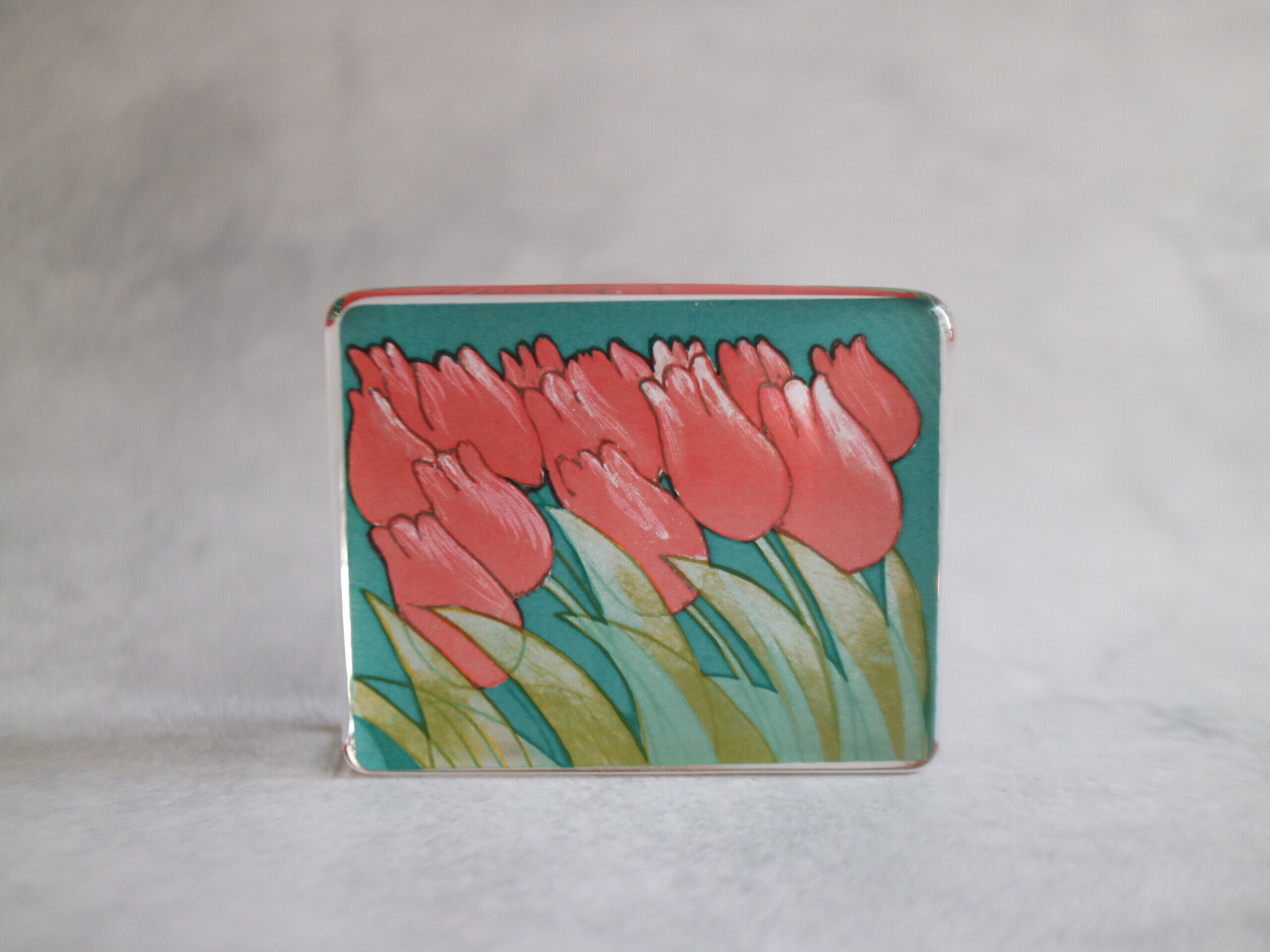 ガラスには生き生きと赤いチューリップが咲いており見ているだけで元気をもらえる作品です。ガラスの背面に絵の加工がされており透けるので、光がたくさん集まる窓辺のインテリアにおすすめのお品です。