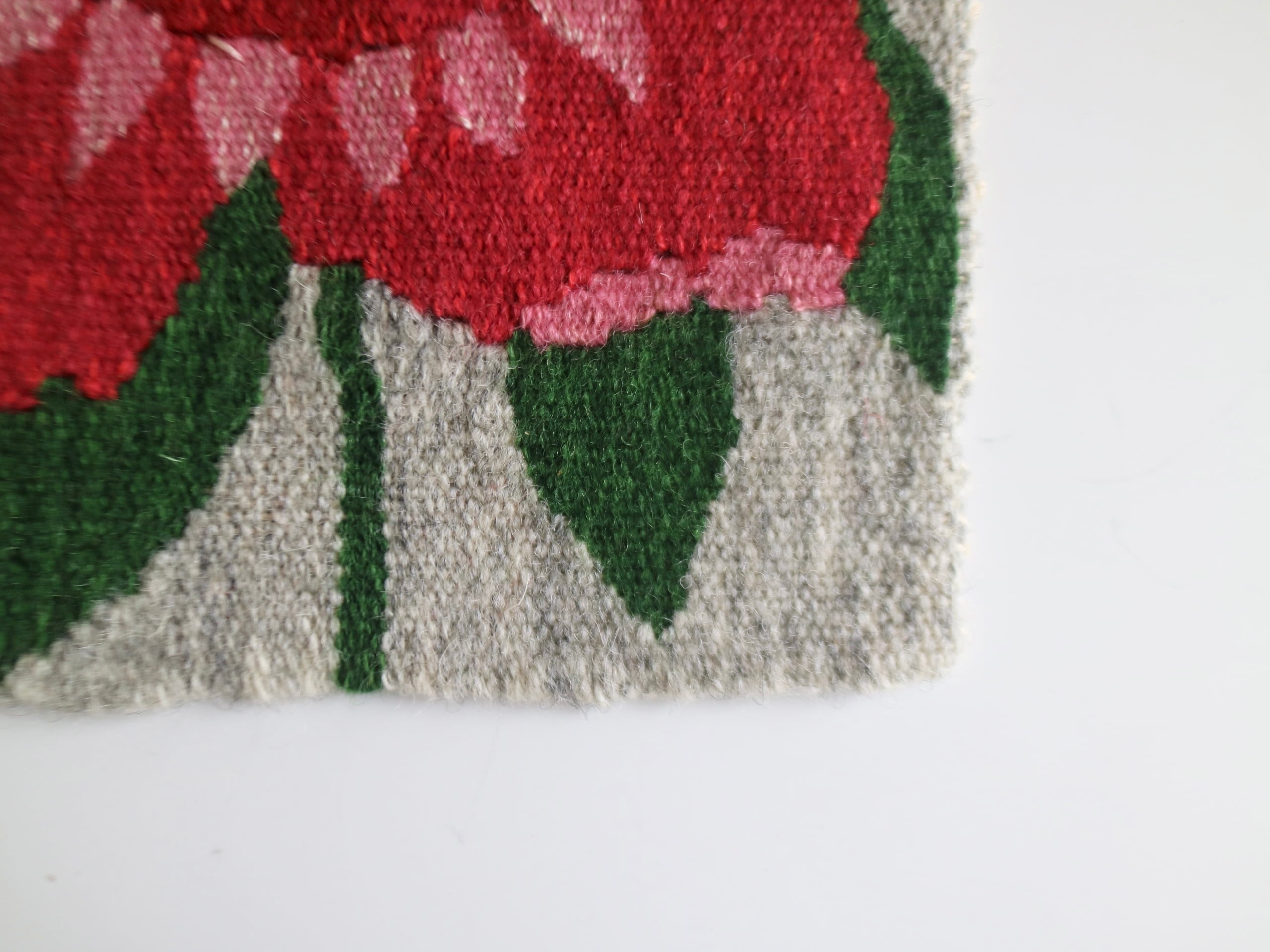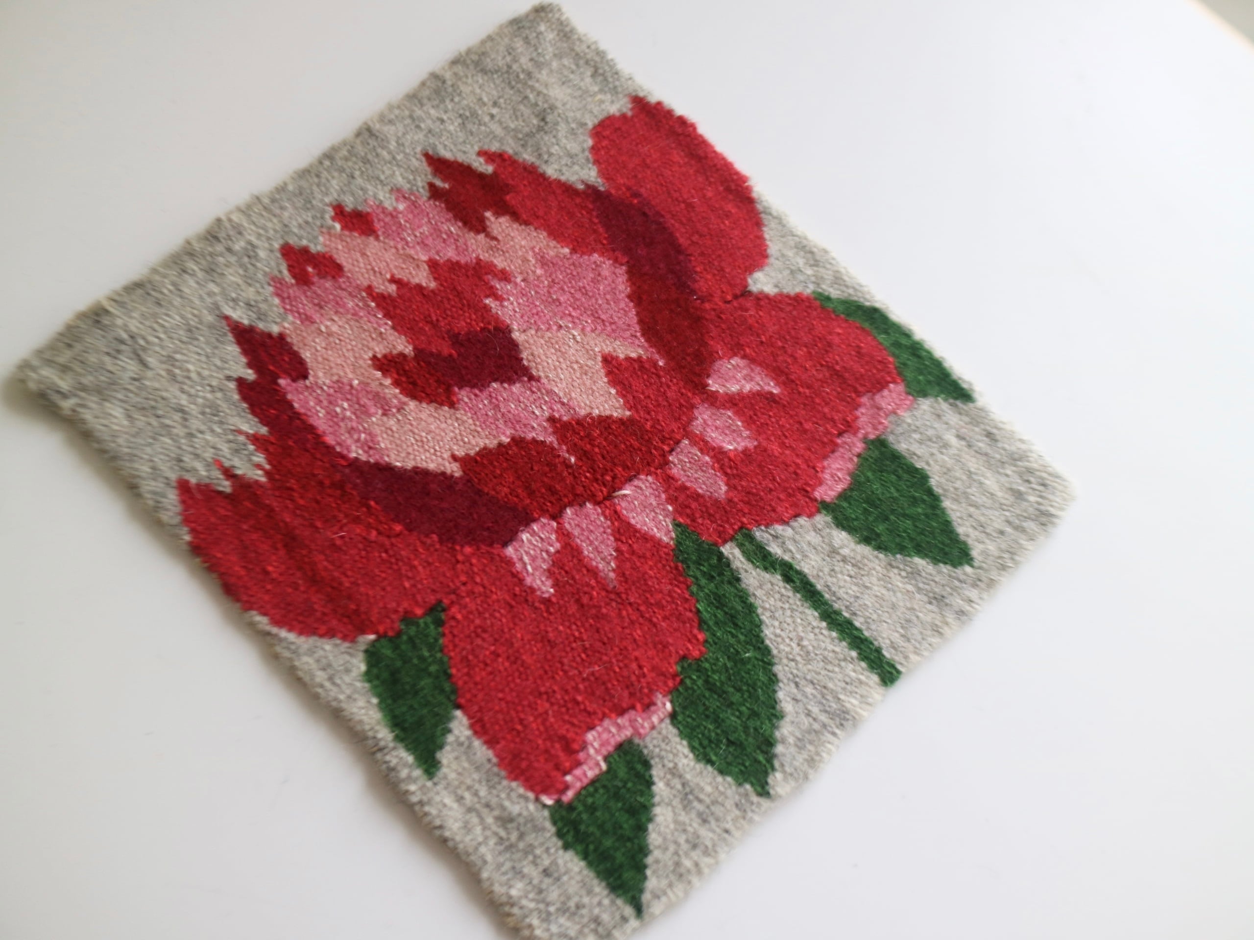 ウール糸を丁寧に織り込むことで、花びらの重なりや柔らかな立体感が生まれ、小ぶりながらも存在感のある作品です。