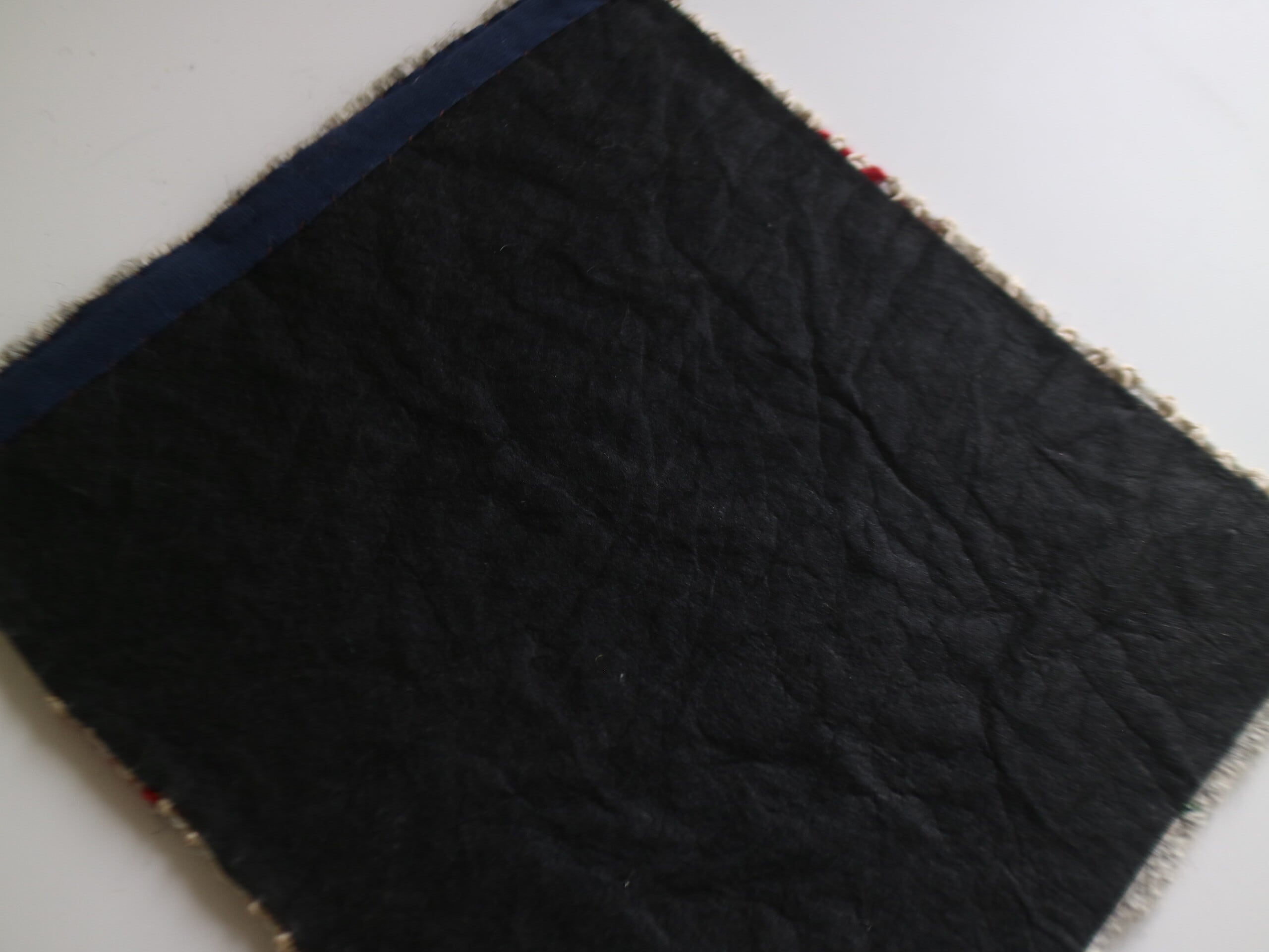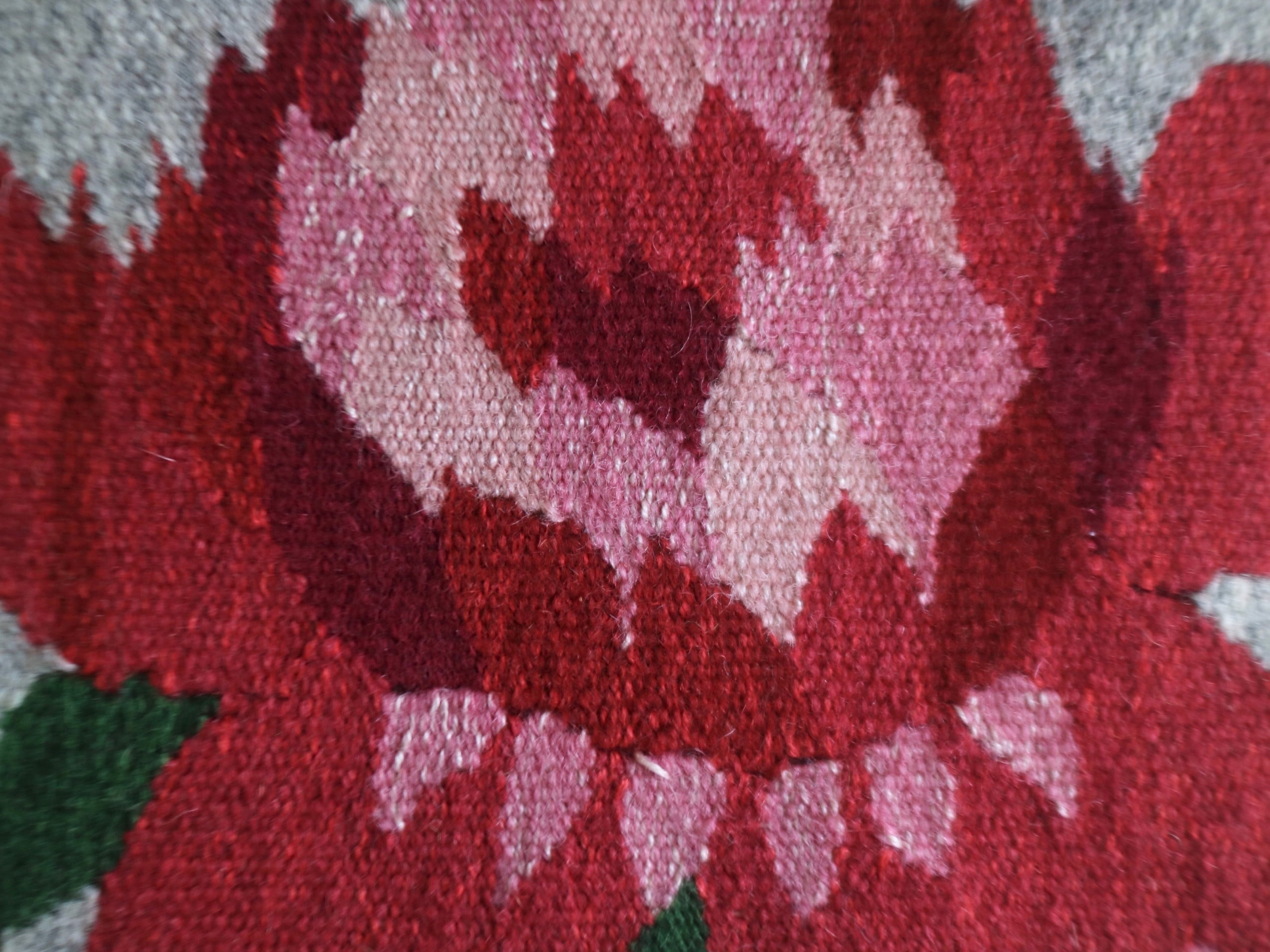 落ち着いたグレーの地に、大輪の芍薬を思わせる赤い花がふっくらと咲き誇り、濃い赤から淡いピンクまでの美しいグラデーションが手仕事ならではの表情を見せてくれます。