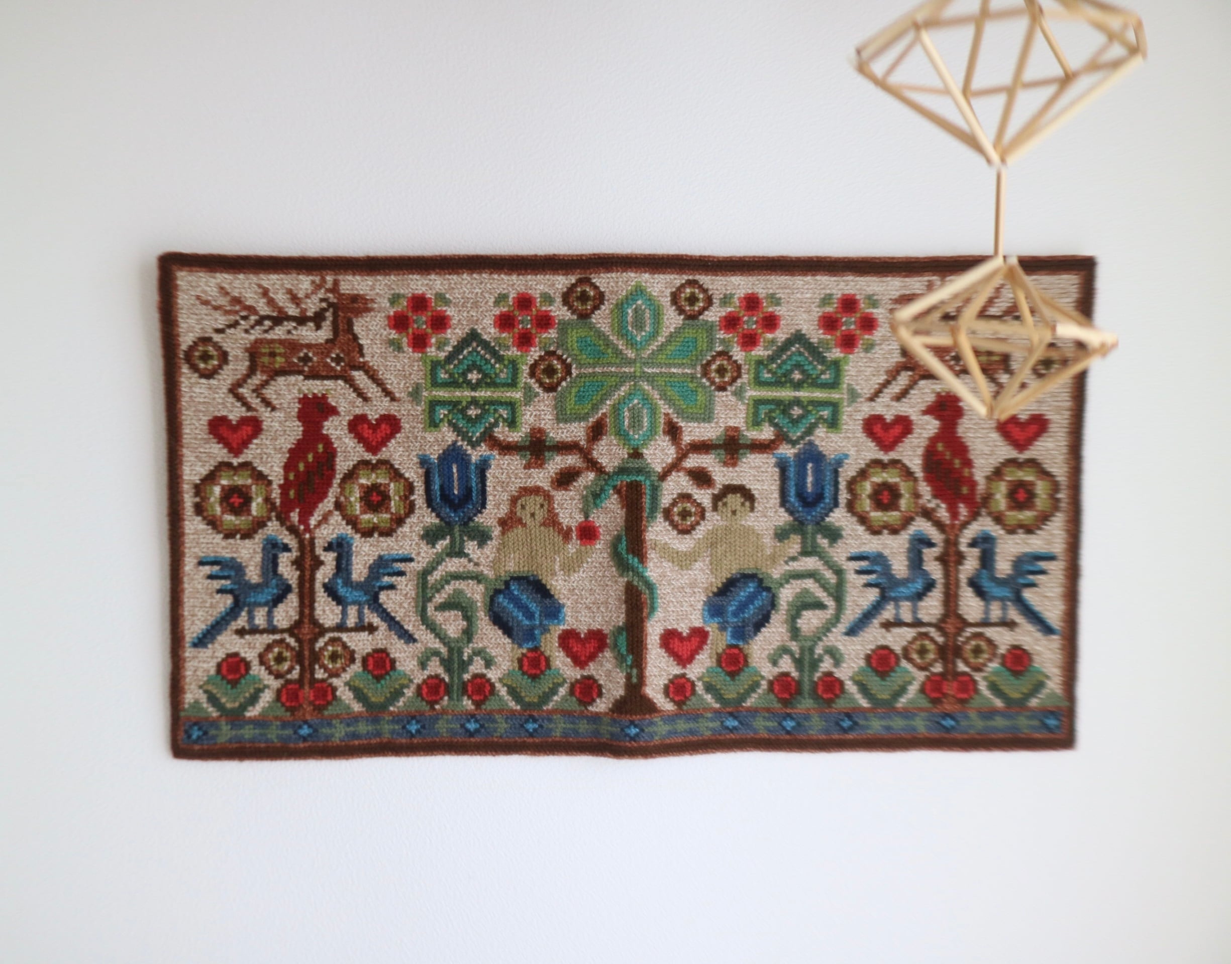 植物や鳥、鹿、そして中央にはどこか“アダムとイブ”を思わせる男女のモチーフが描かれた、物語性あふれるヴィンテージタペストリー。