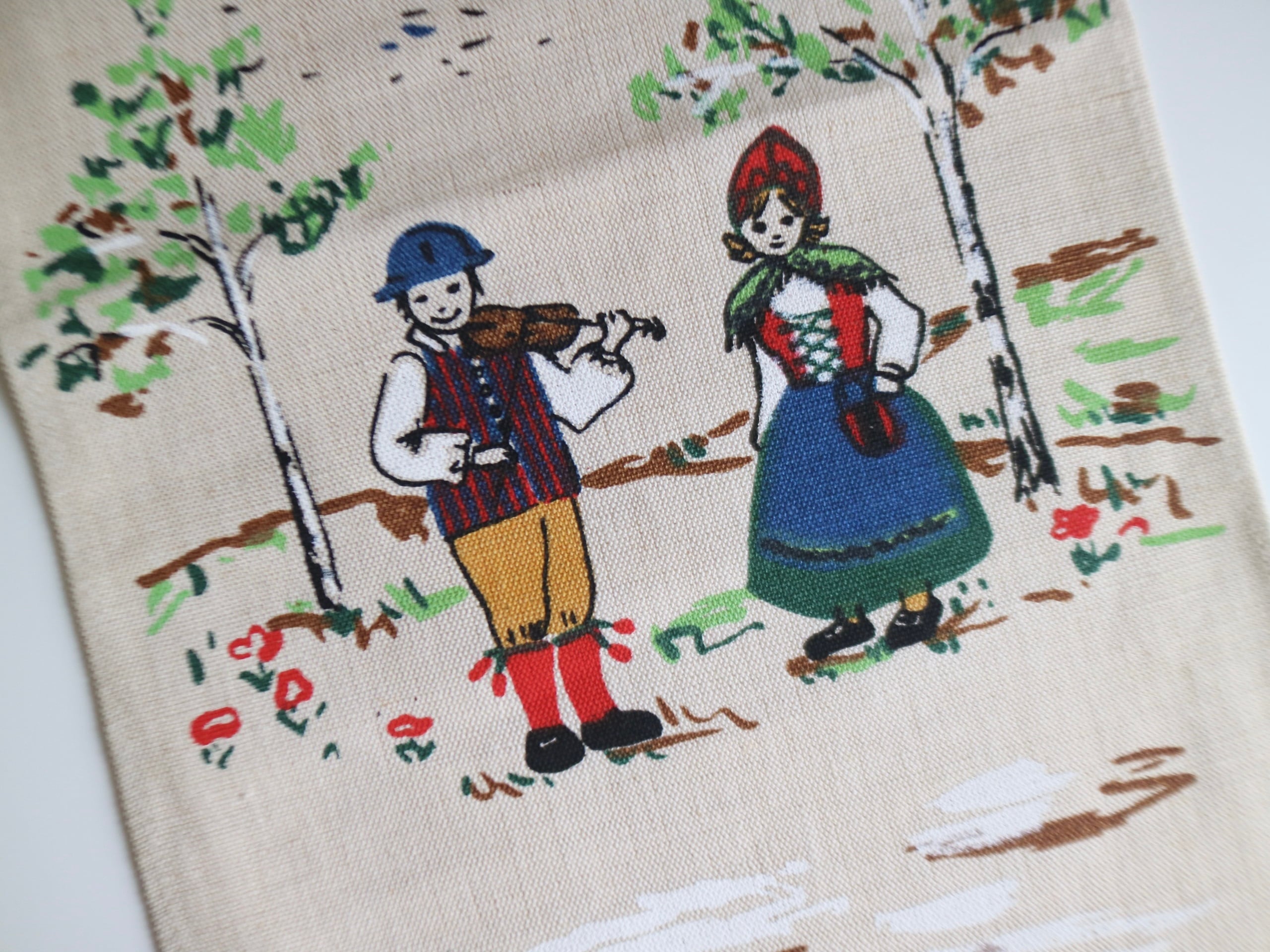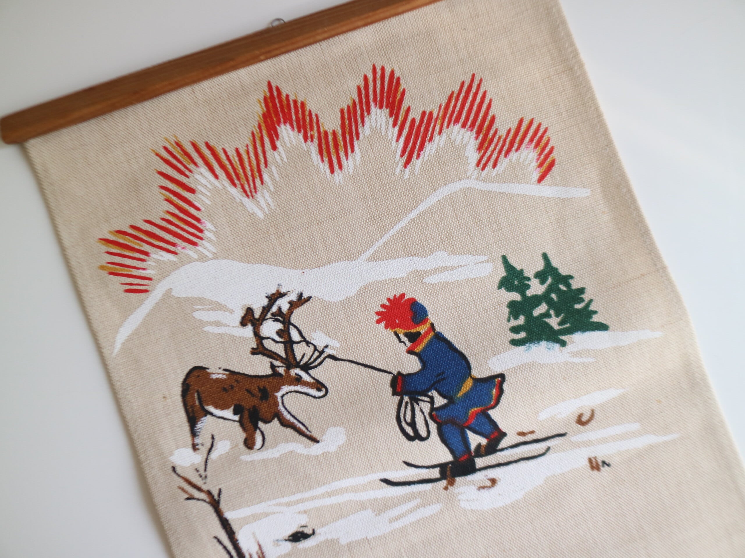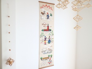 スウェーデンの民族衣装を着た人々や、雪原を駆けるエゾシカ、のどかな田舎の暮らしが描かれた縦長タペストリー。