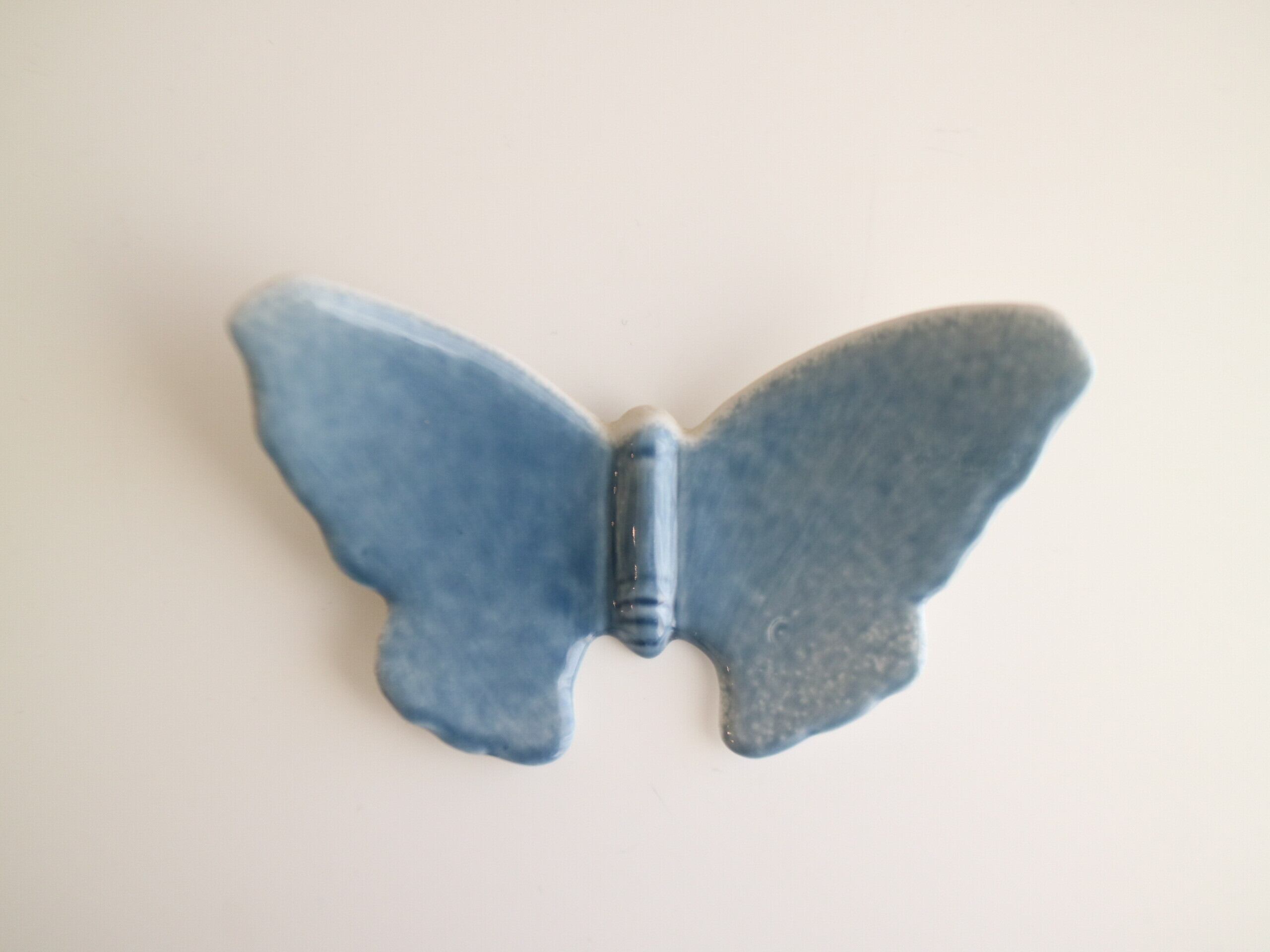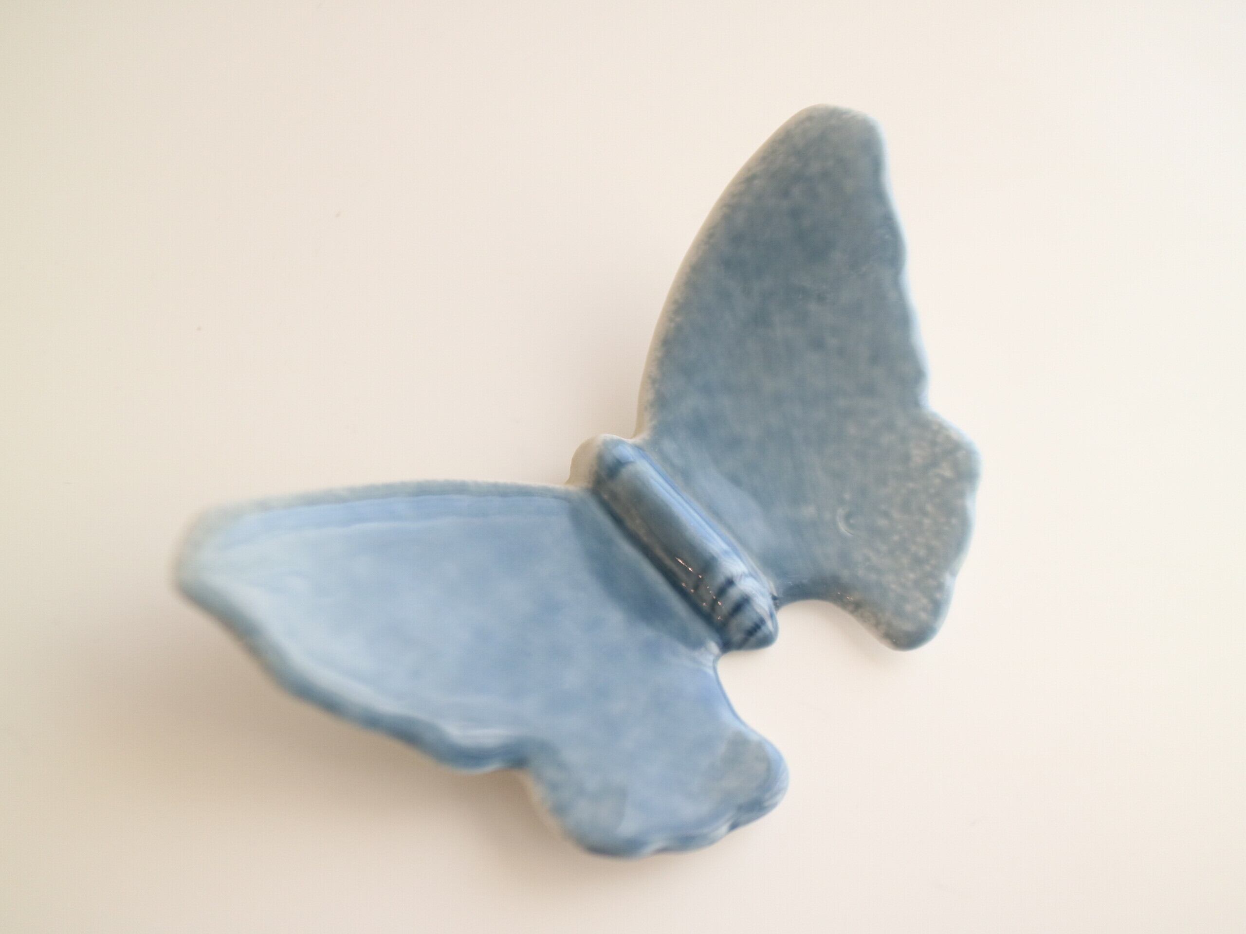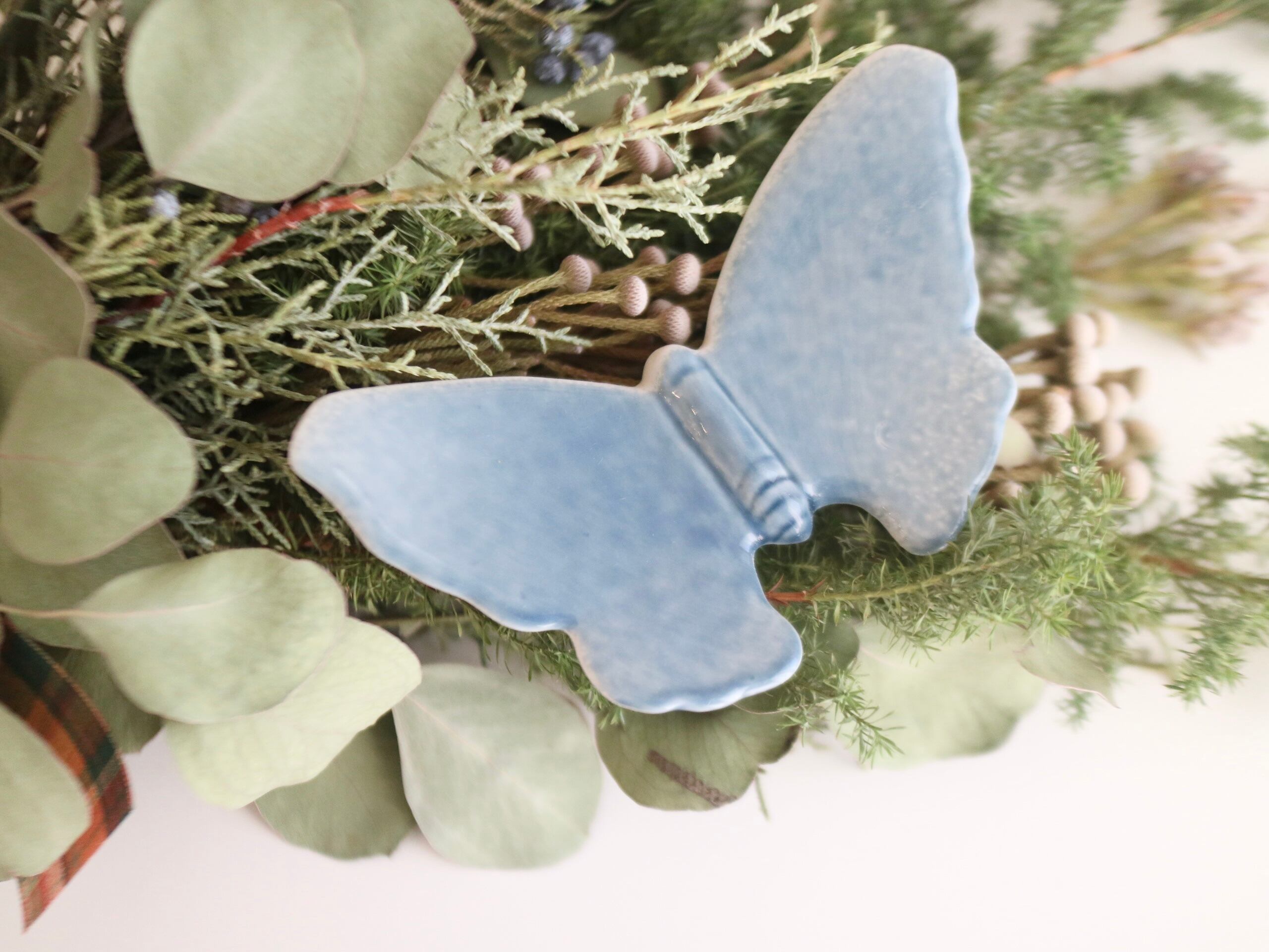 やわらかなブルーの釉薬でかたどられた、静かに羽を広げる蝶の姿。