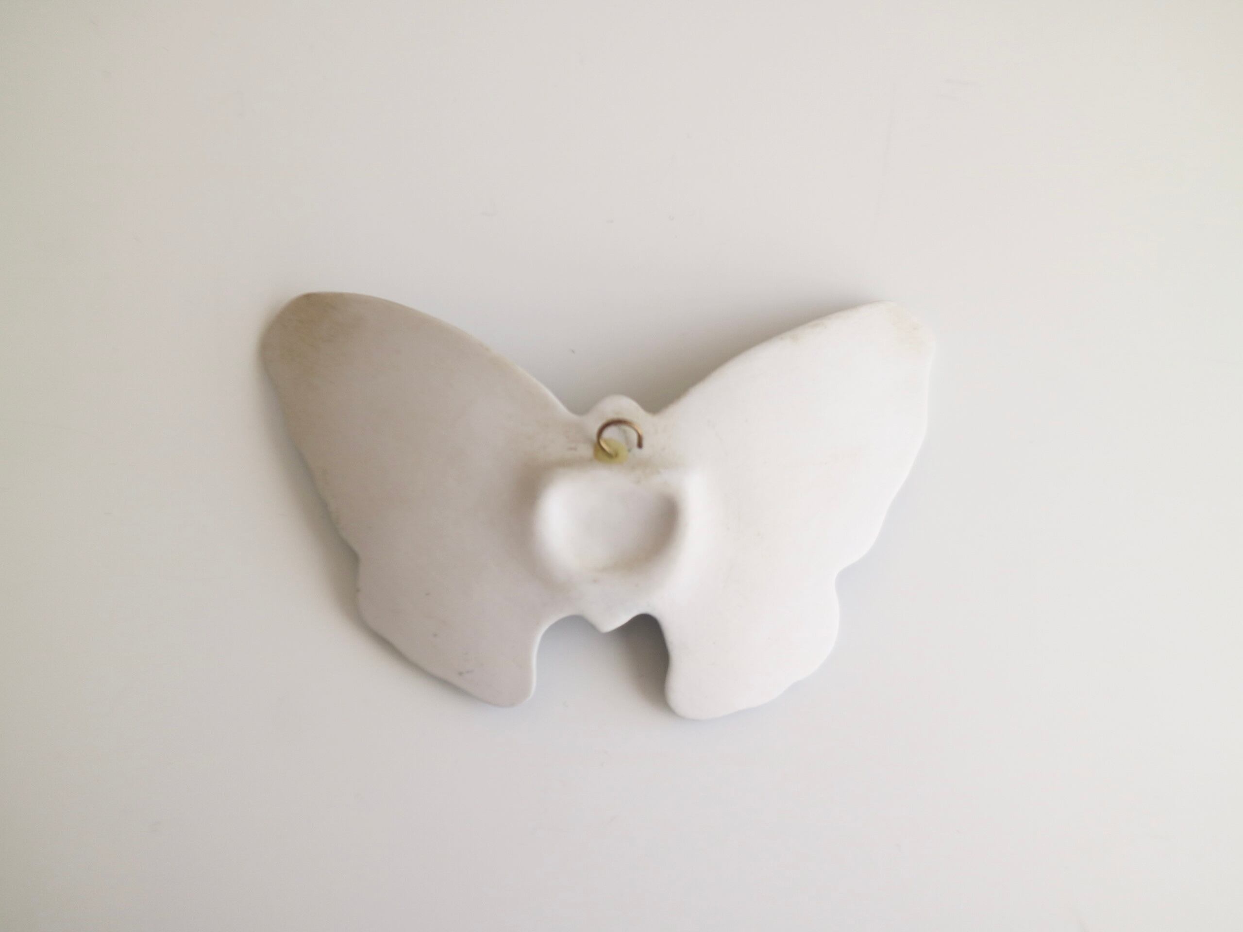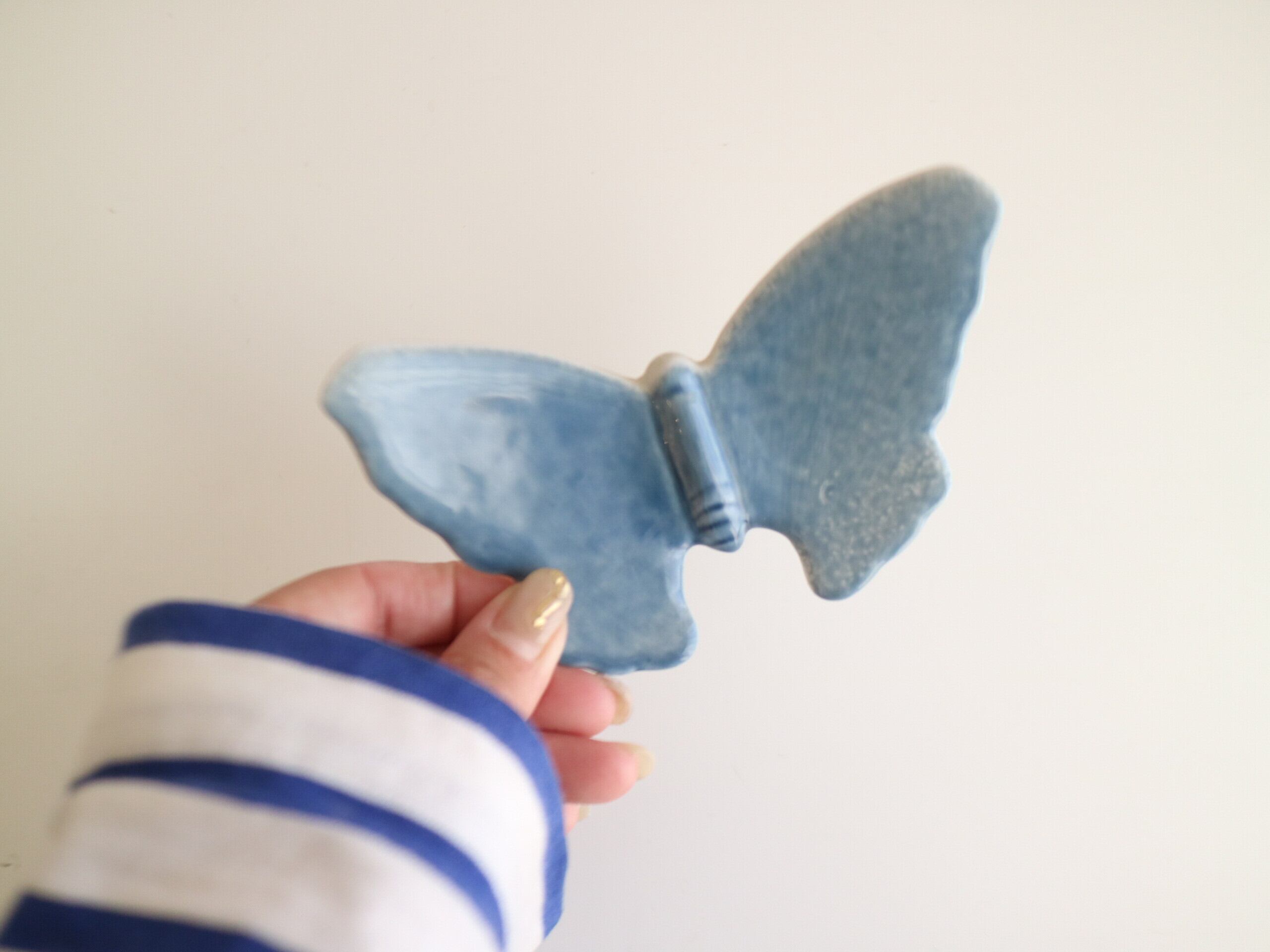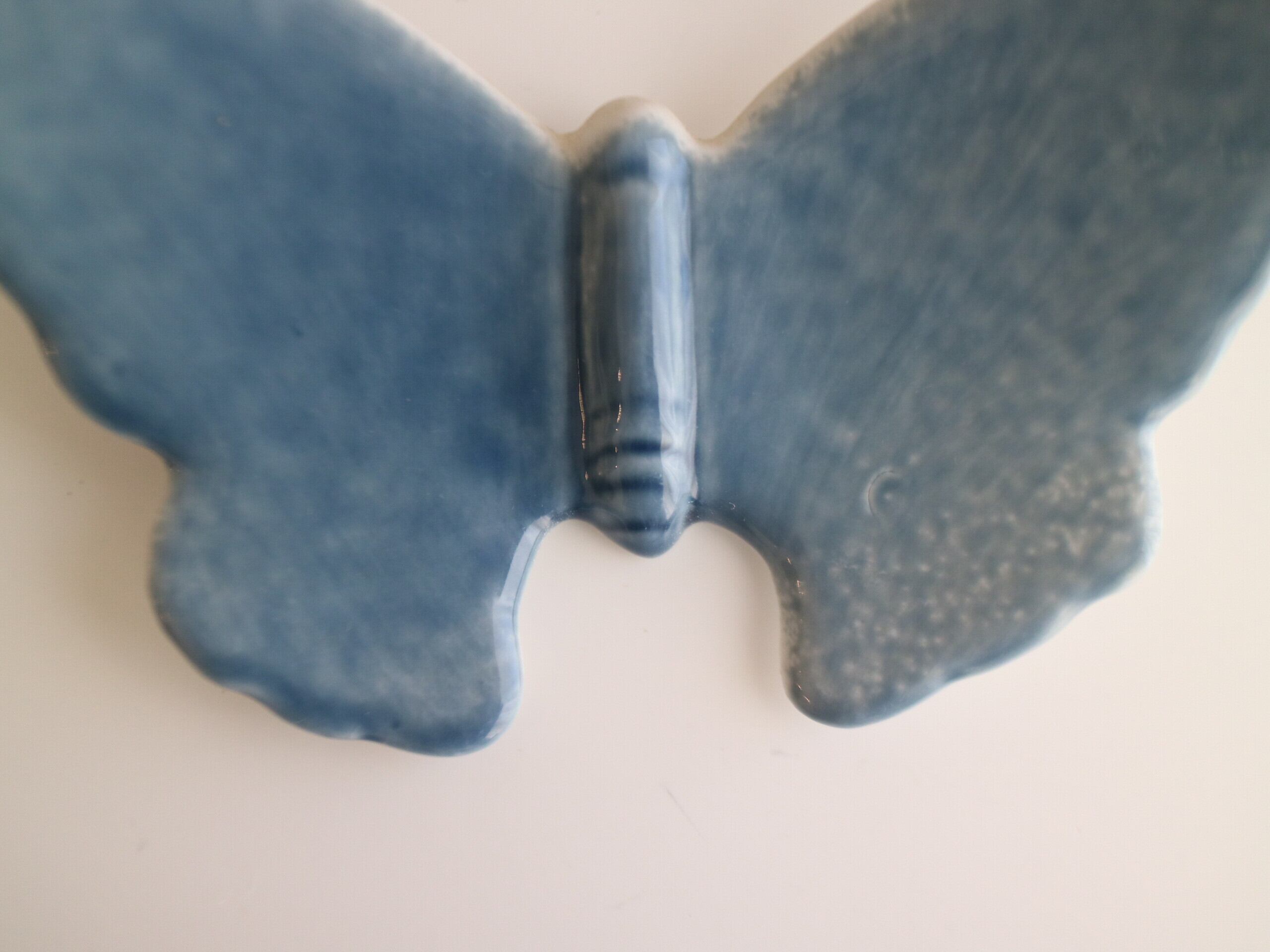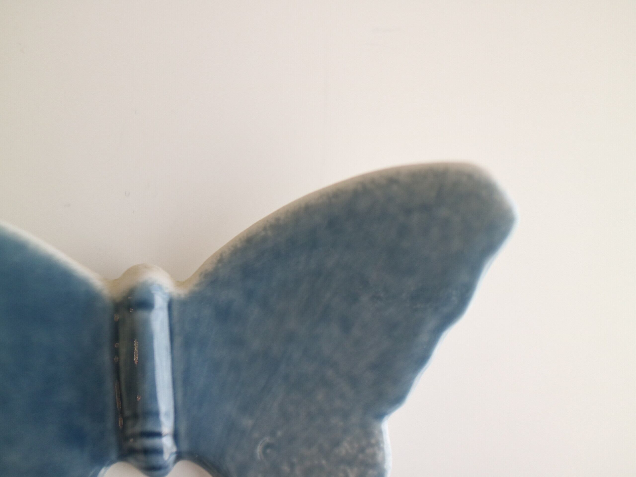 やわらかなブルーの釉薬でかたどられた、静かに羽を広げる蝶の姿。