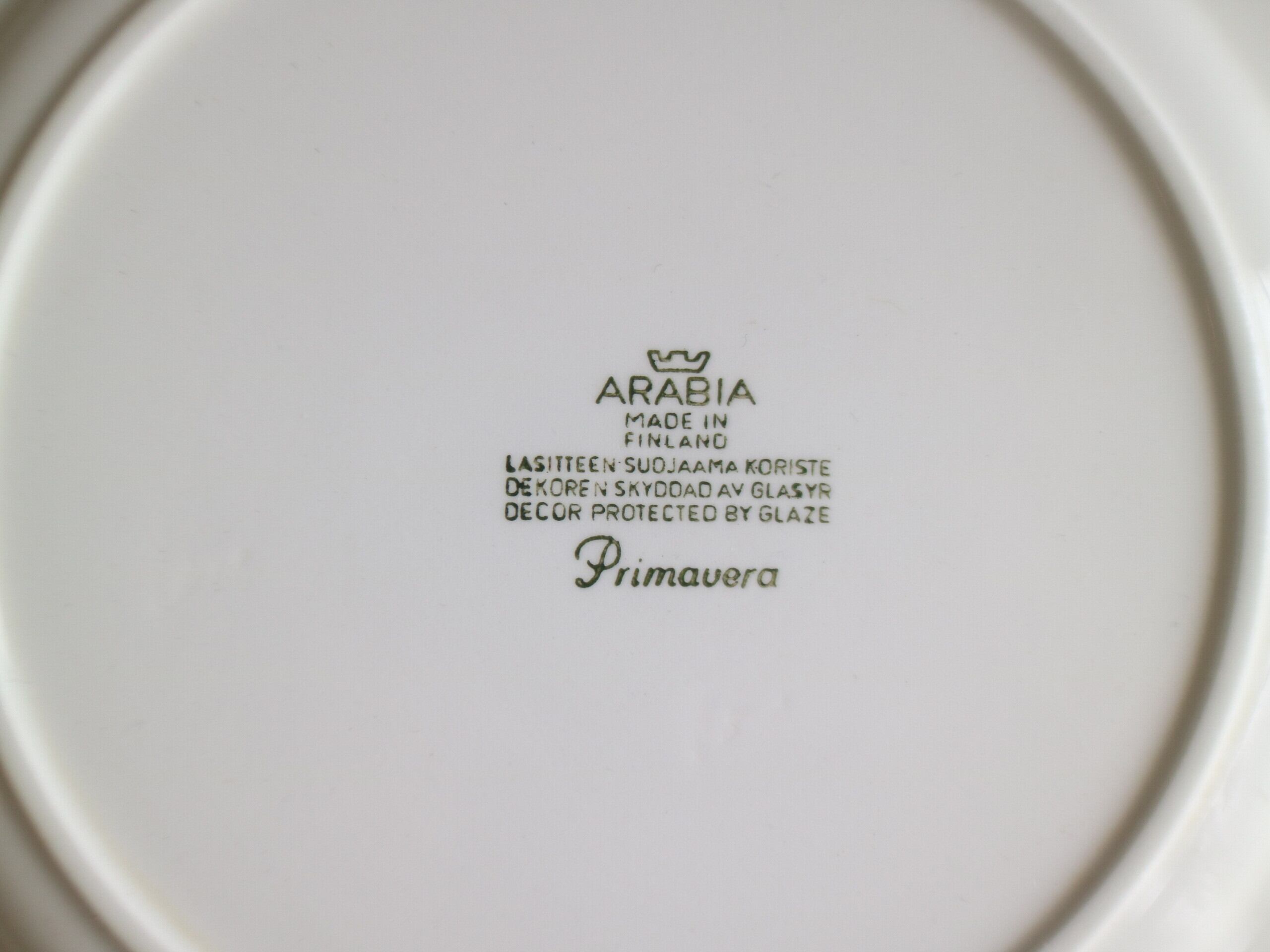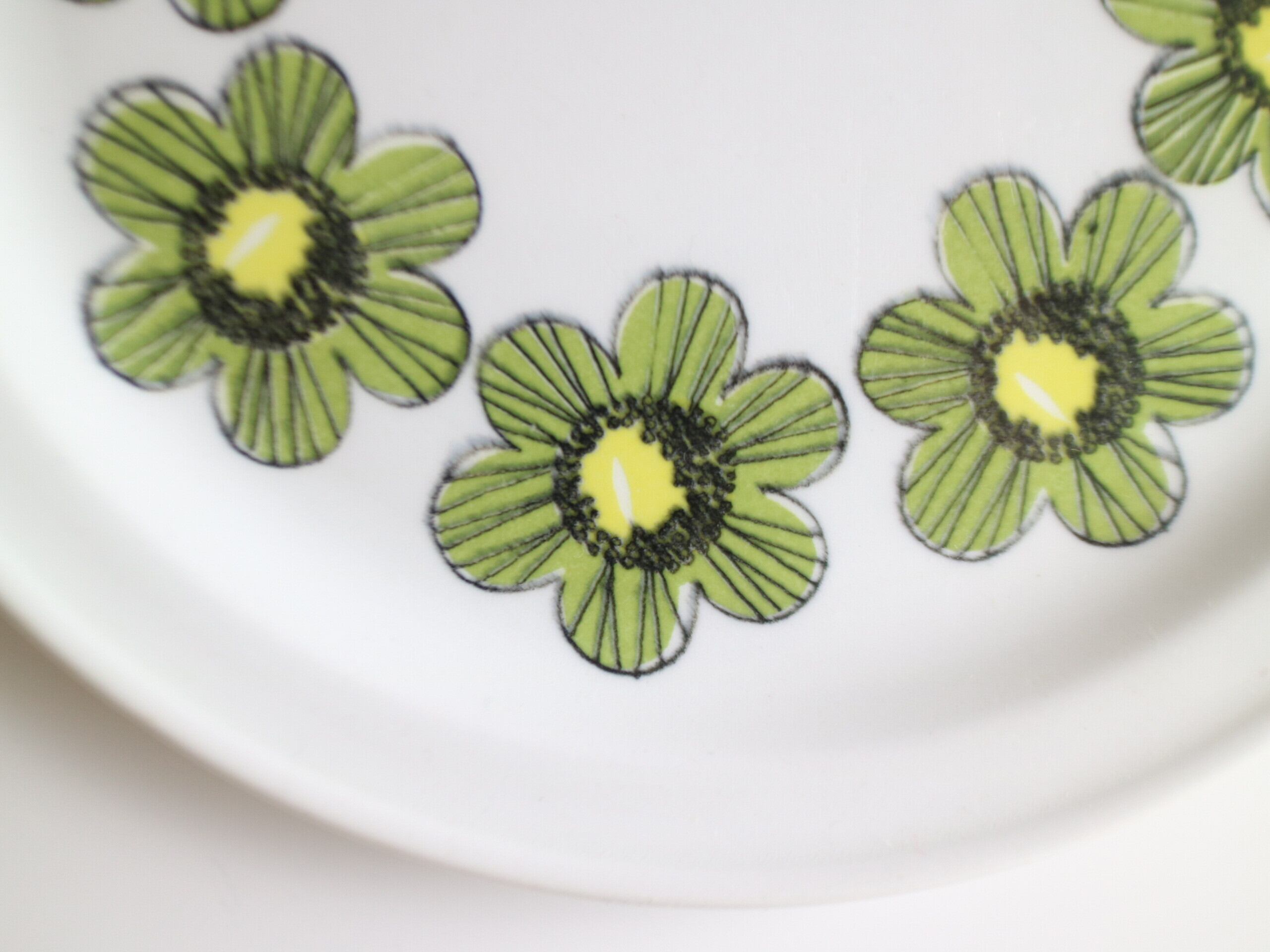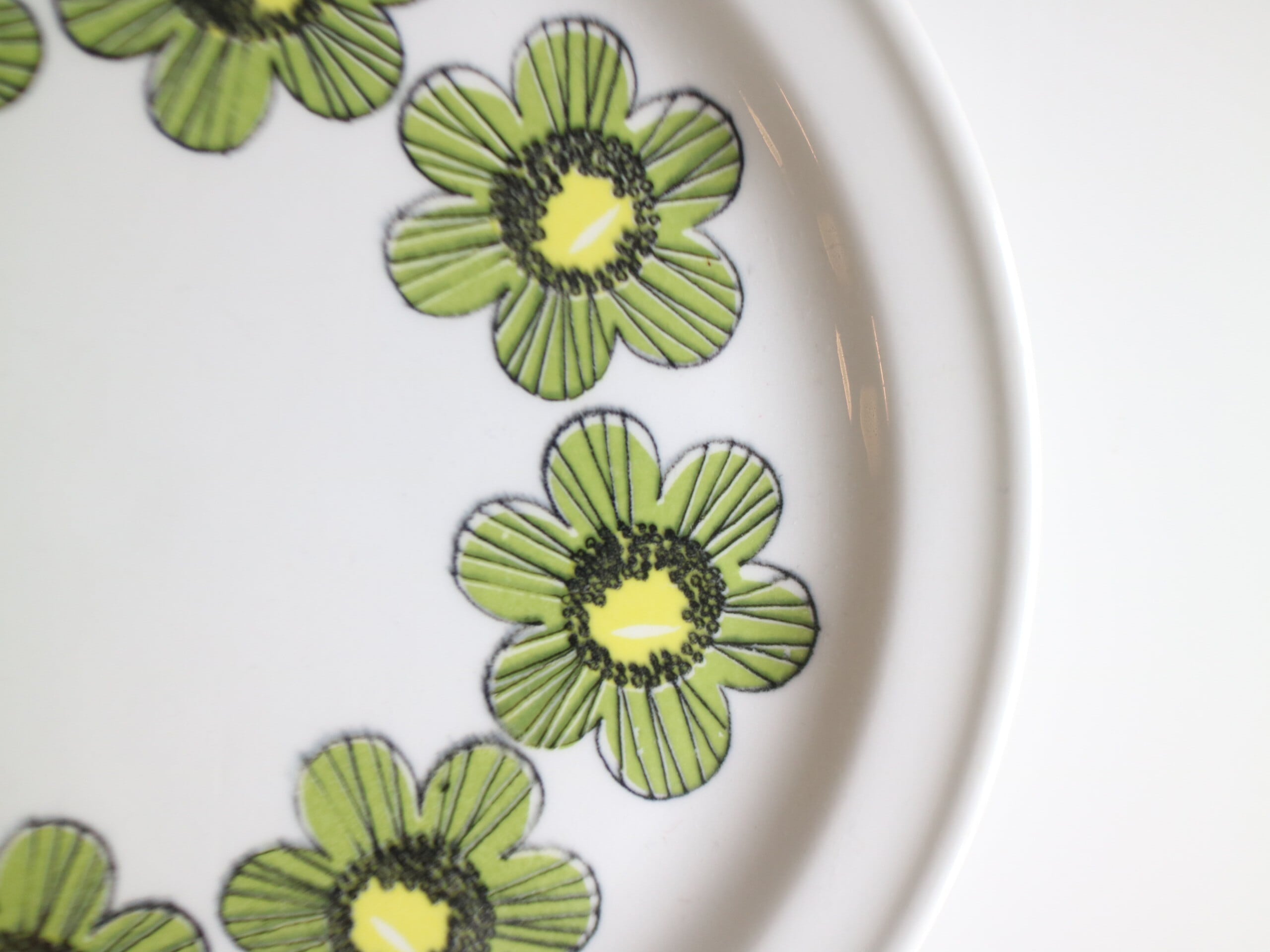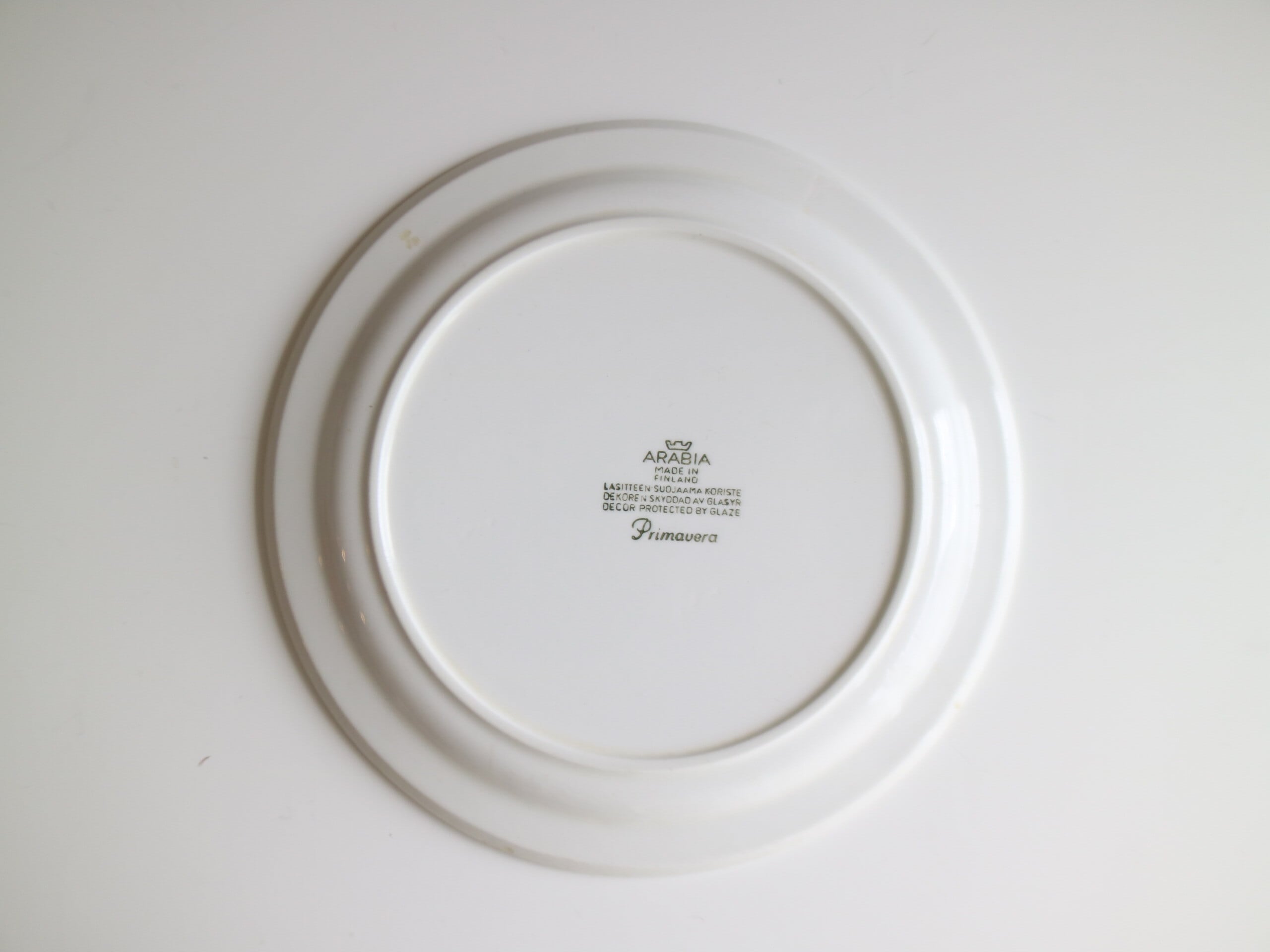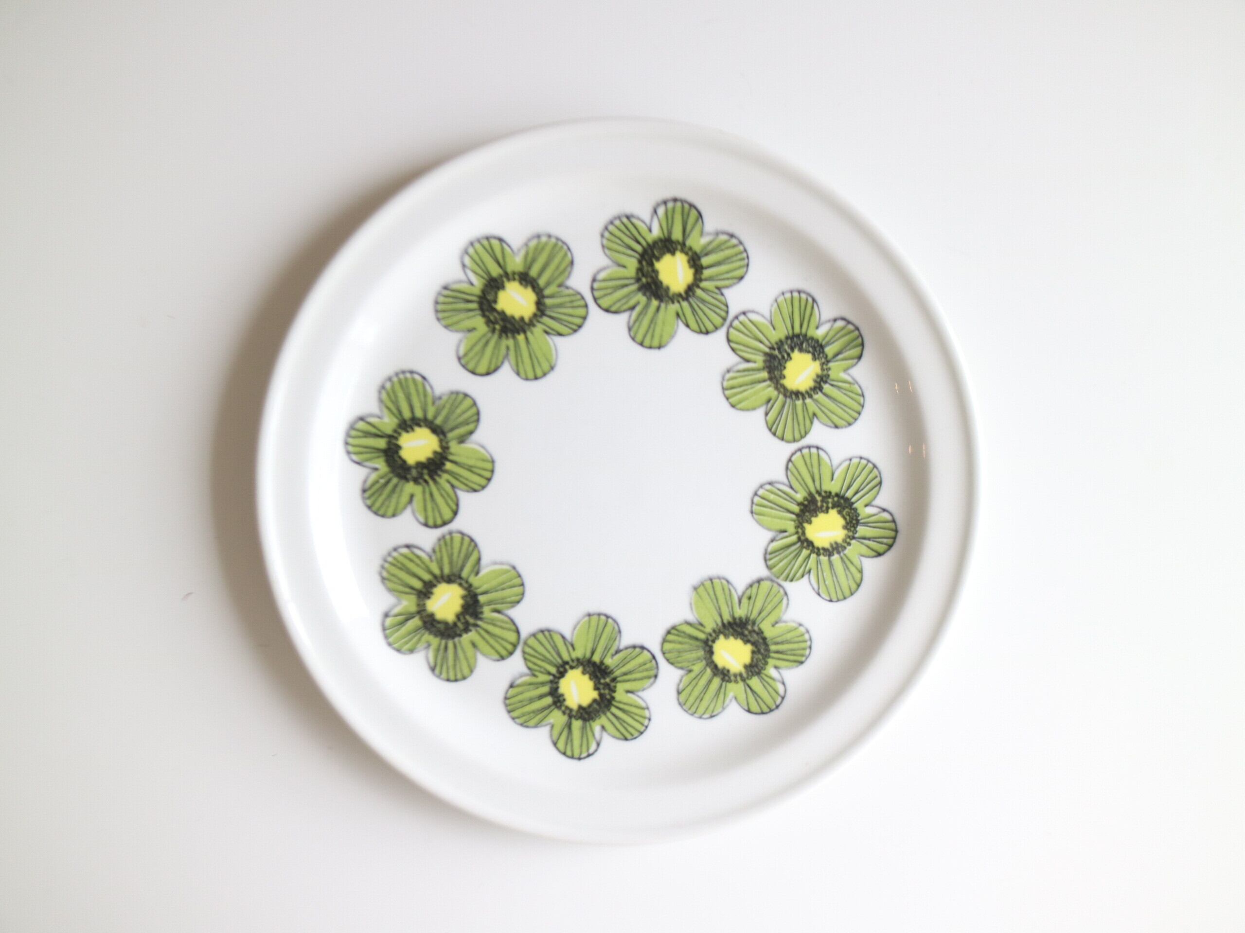 ARABIA社、Primavera (プリマヴェーラ) シリーズのプレート(17.0cm)です。Primavera はイタリア語で “春” を意味します。春らしいグリーンカラーの明るいお花がプレートにぐるりと描かれています。こちらは1968年~73年のみ製造された商品となり製造期間も短く、近年では非常に入手困難なお品となっております。