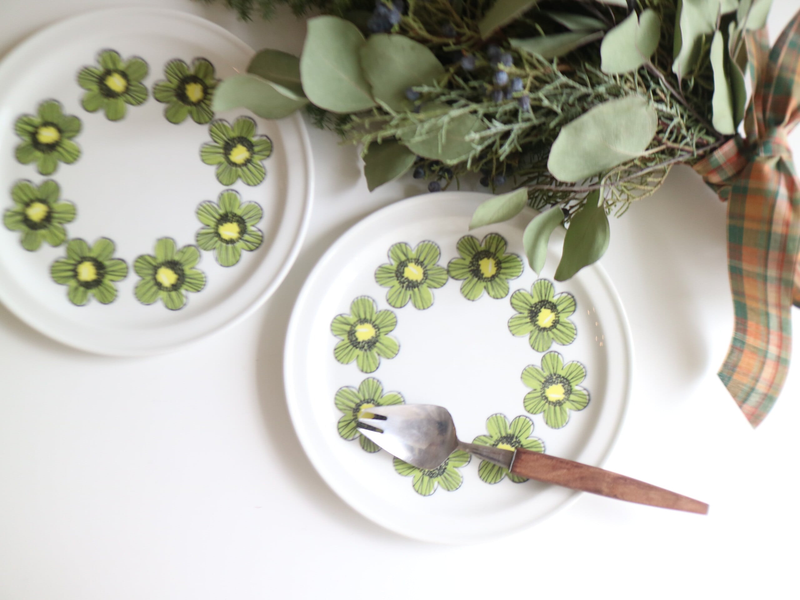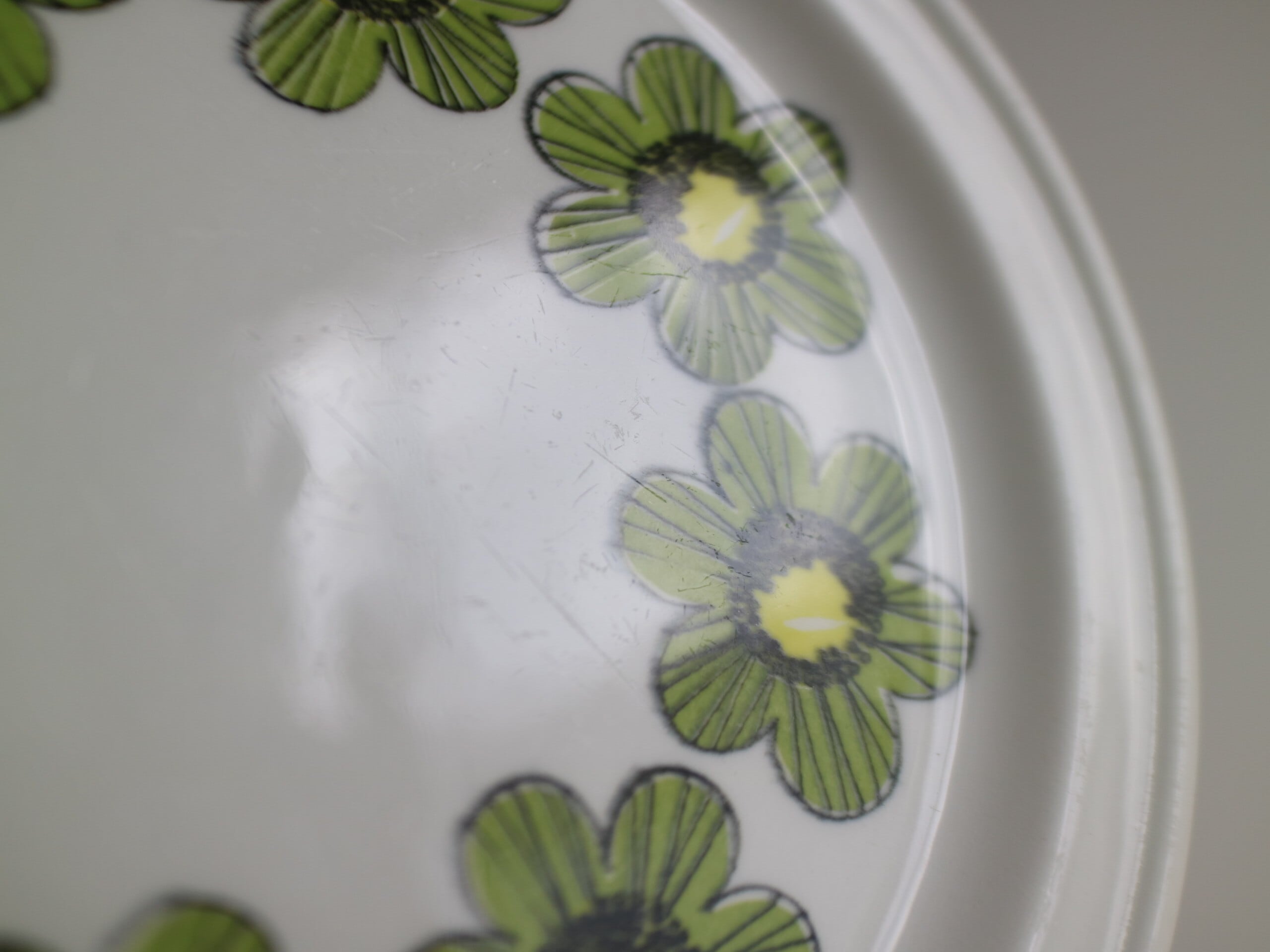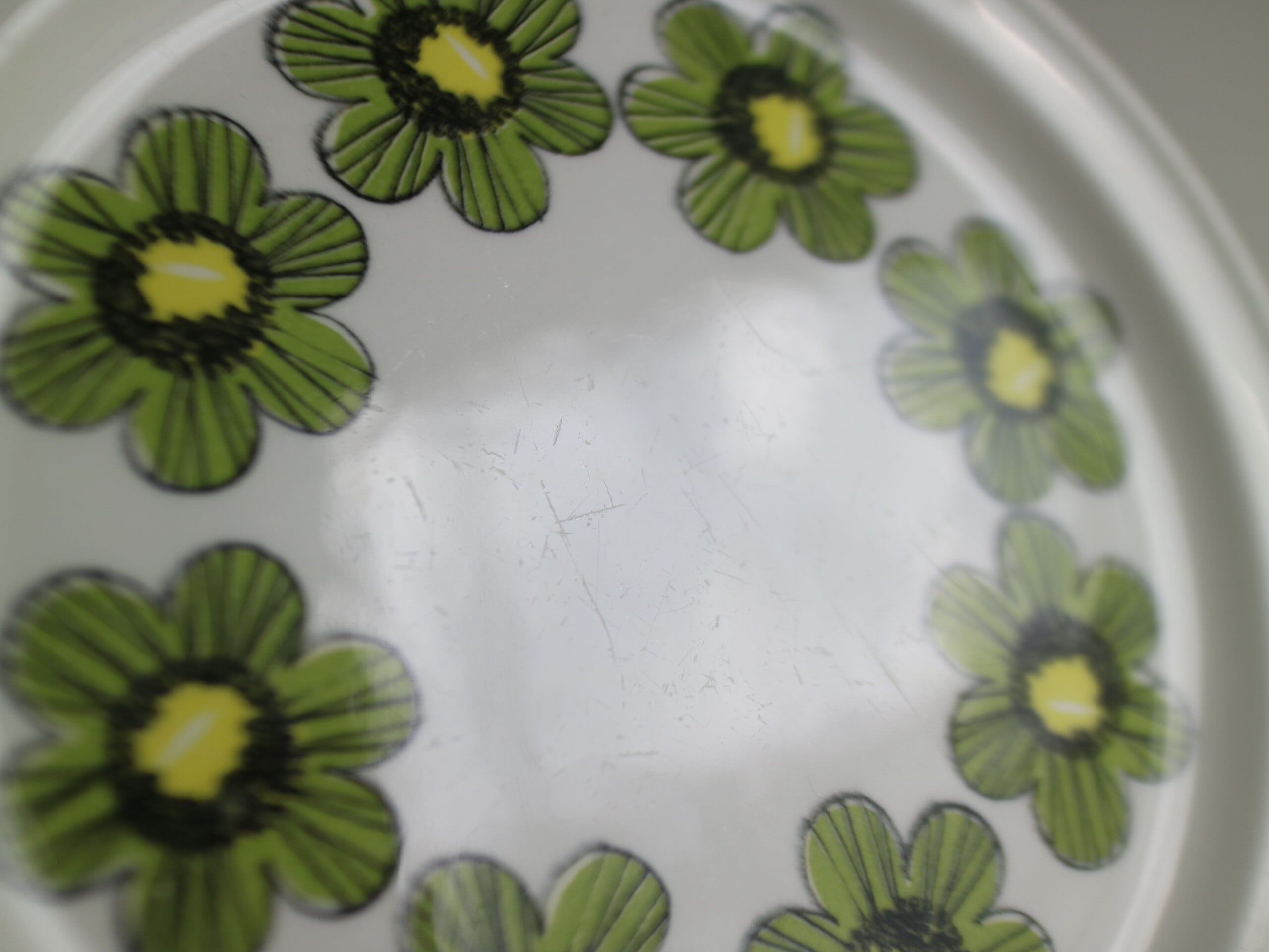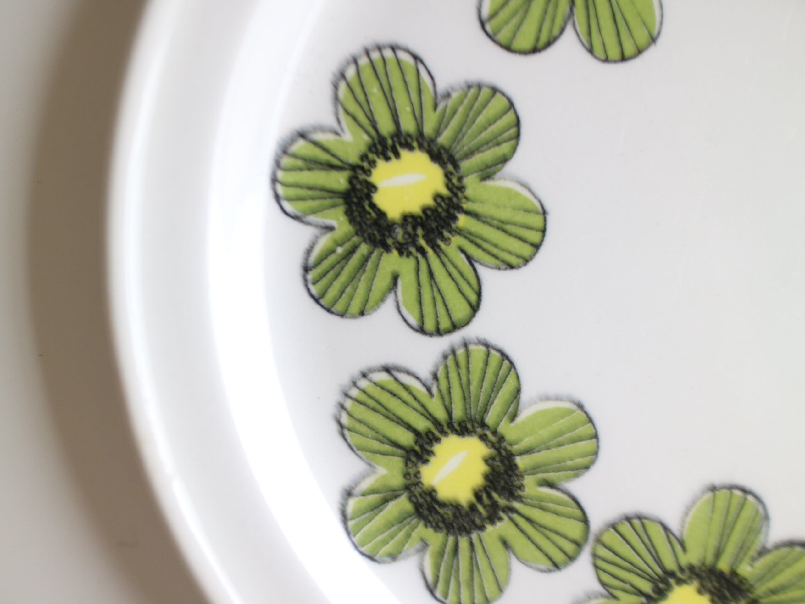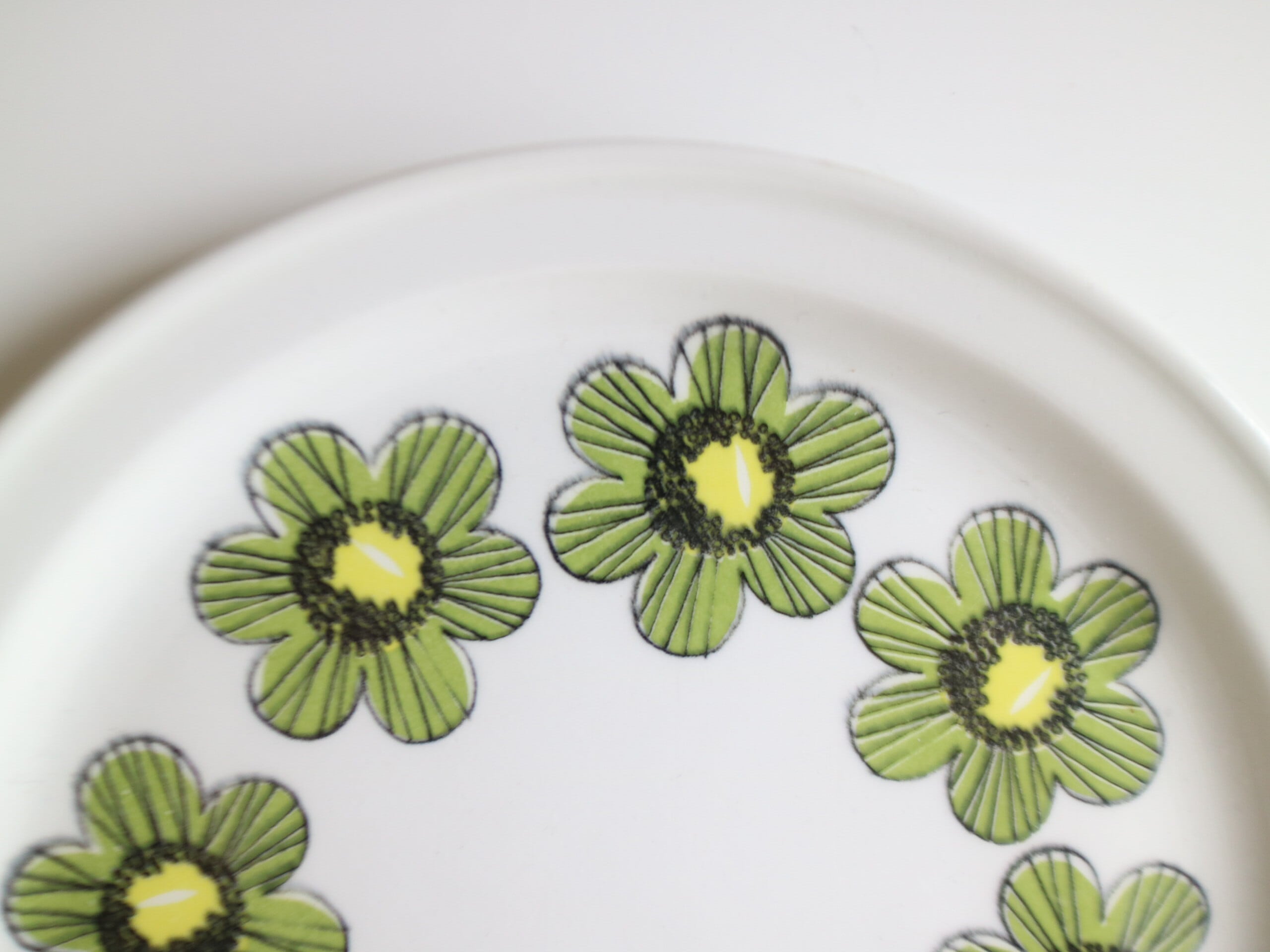 ARABIA社、Primavera (プリマヴェーラ) シリーズのプレート(17.0cm)です。Primavera はイタリア語で “春” を意味します。春らしいグリーンカラーの明るいお花がプレートにぐるりと描かれています。こちらは1968年~73年のみ製造された商品となり製造期間も短く、近年では非常に入手困難なお品となっております。