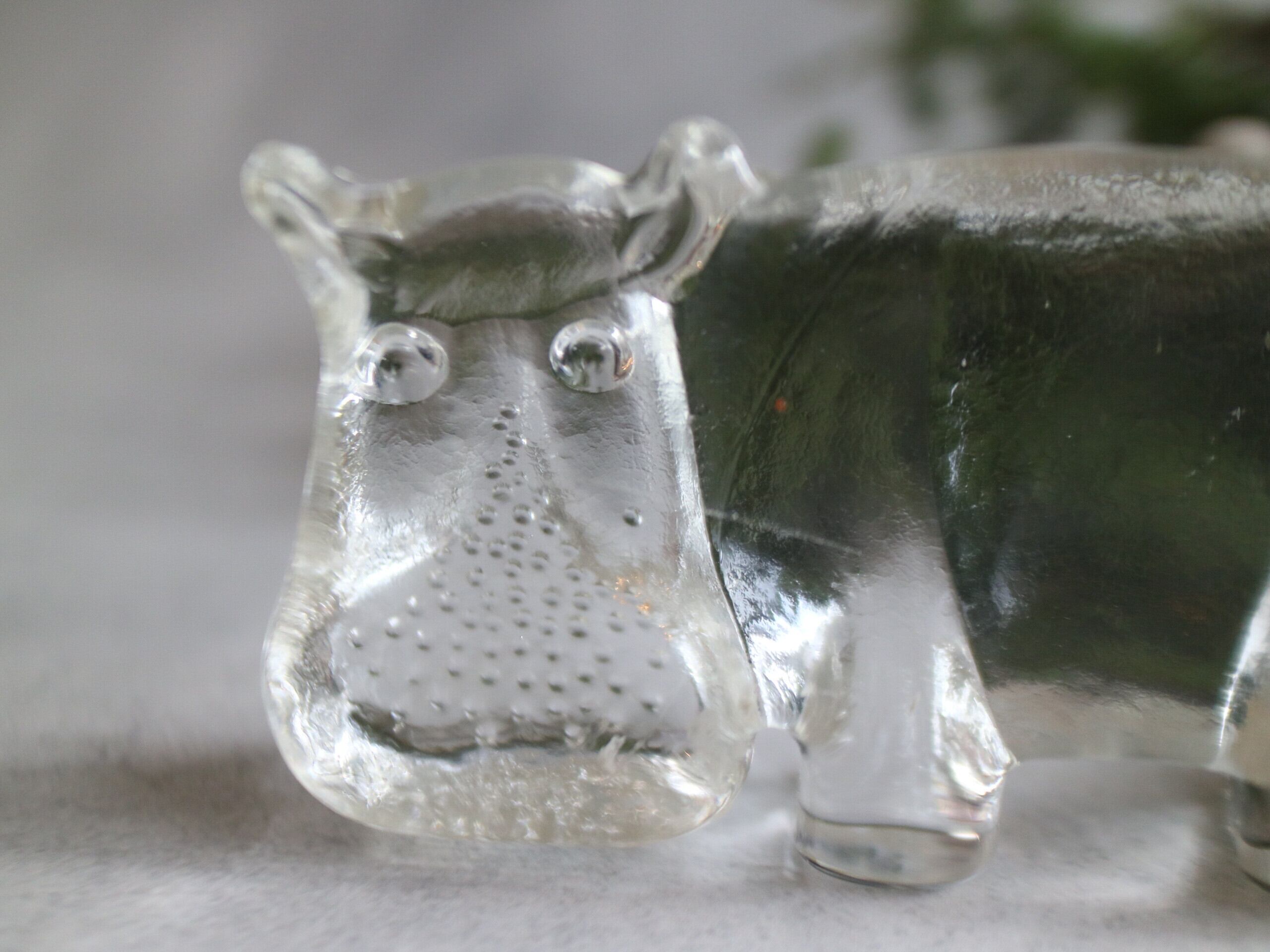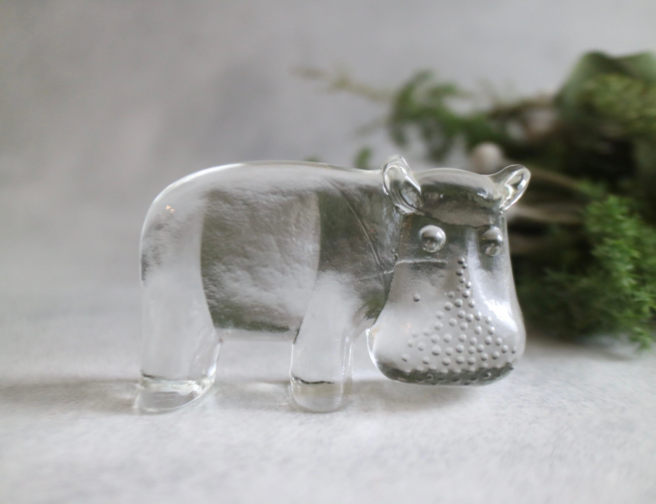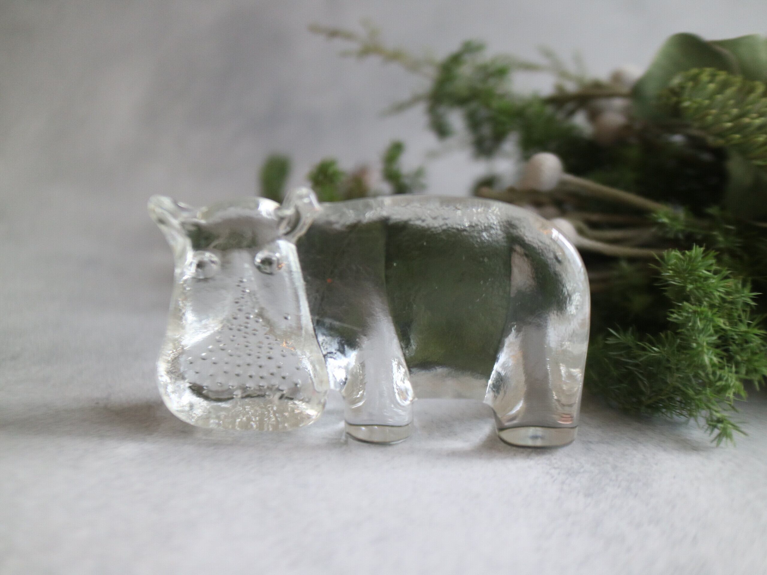 ころんとしたフォルムに、どこかとぼけた表情。ガラスの中に閉じ込められた、北欧らしいユーモアが魅力のカバのオブジェです。