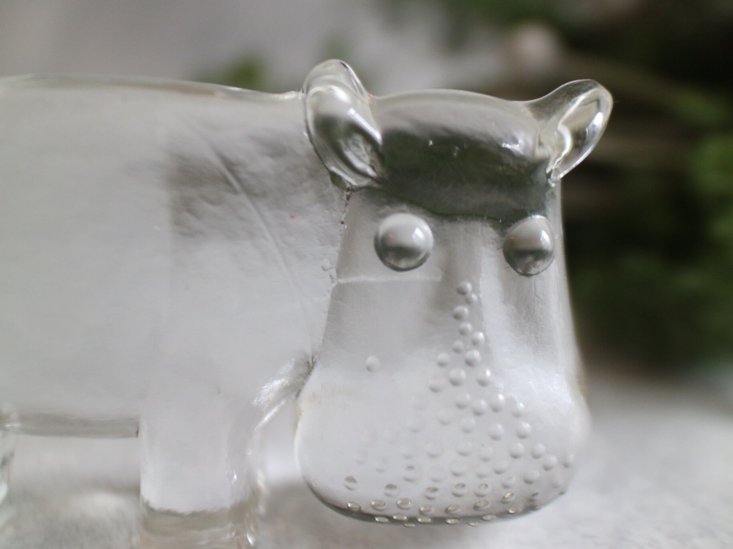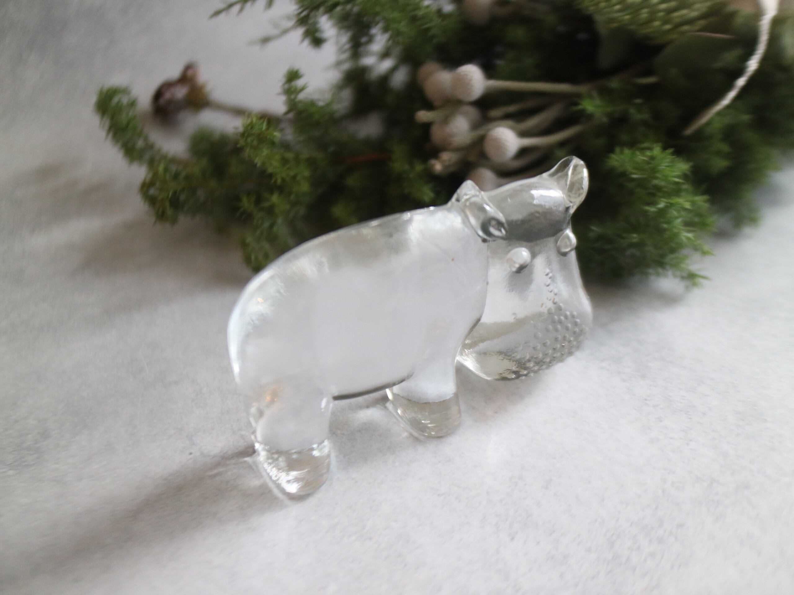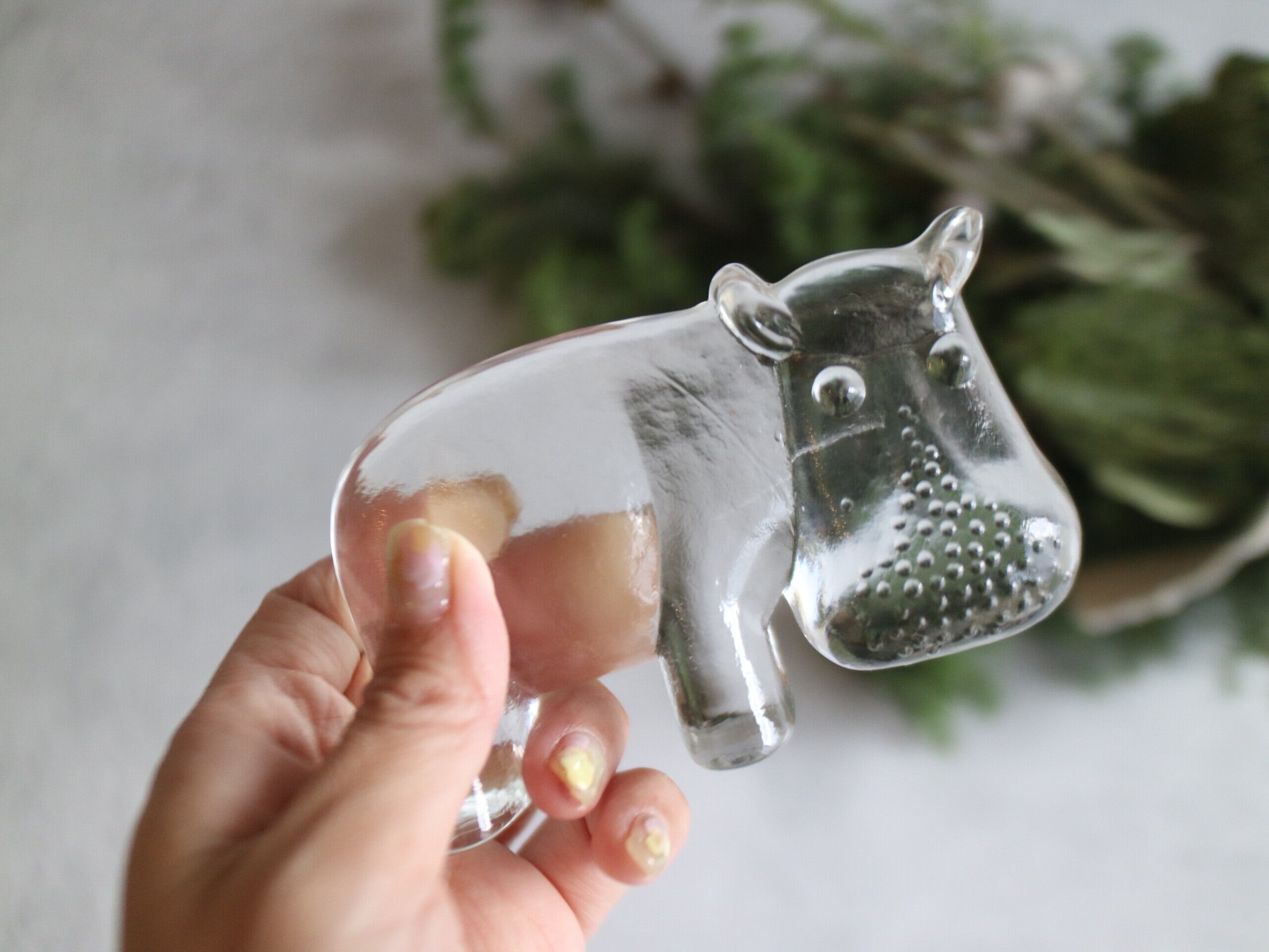 ころんとしたフォルムに、どこかとぼけた表情。ガラスの中に閉じ込められた、北欧らしいユーモアが魅力のカバのオブジェです。