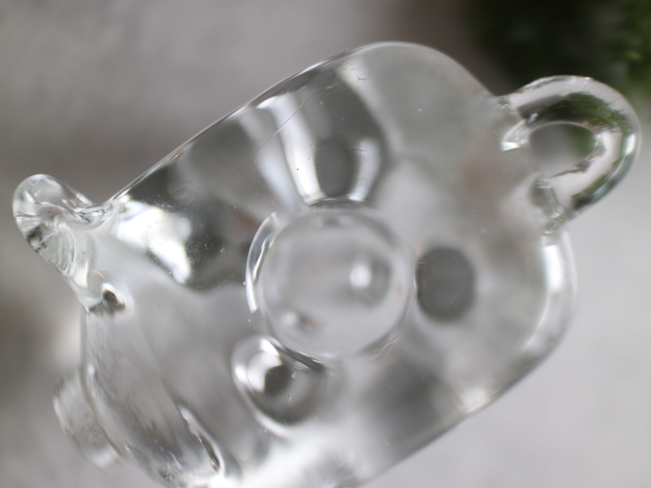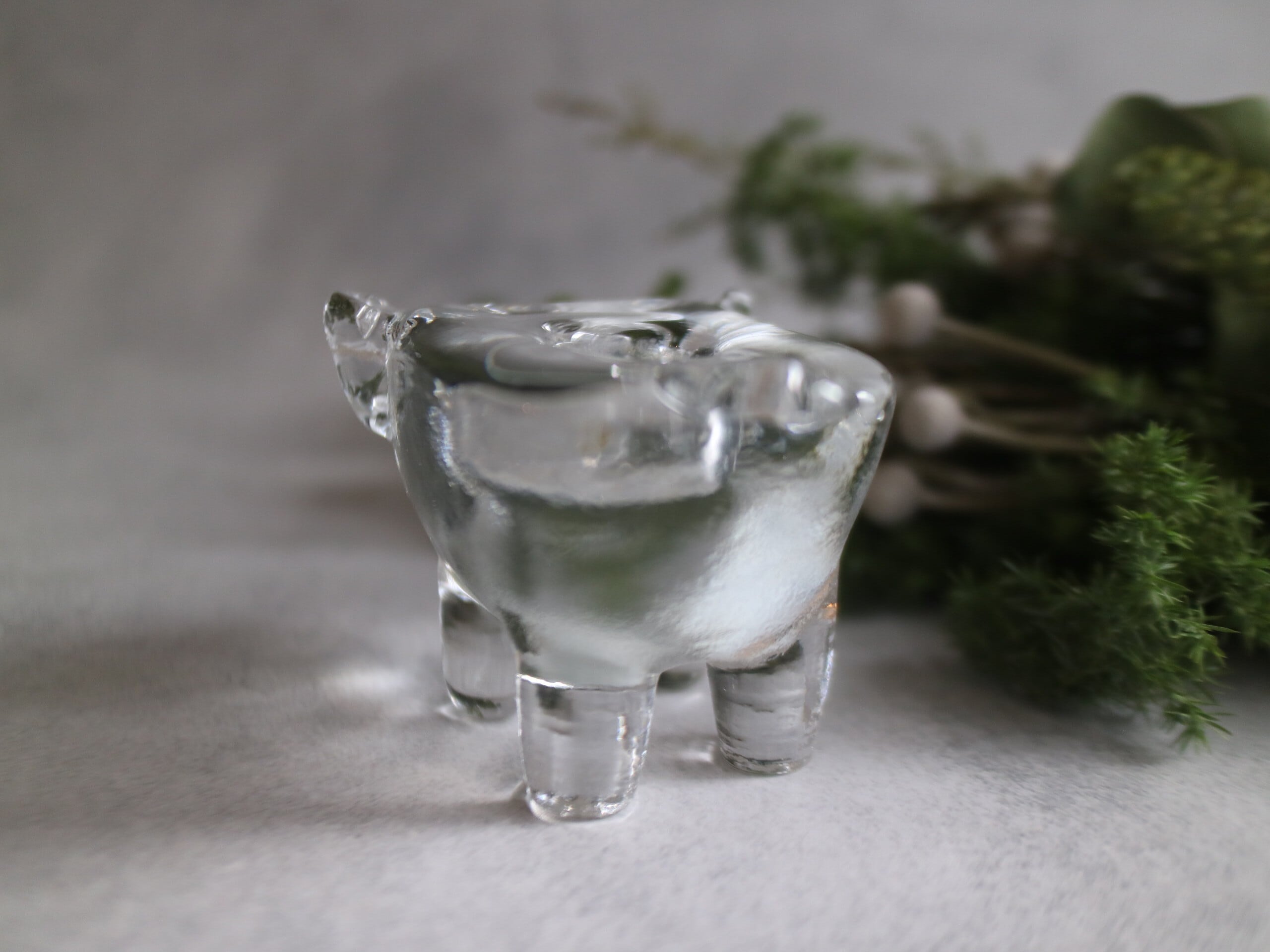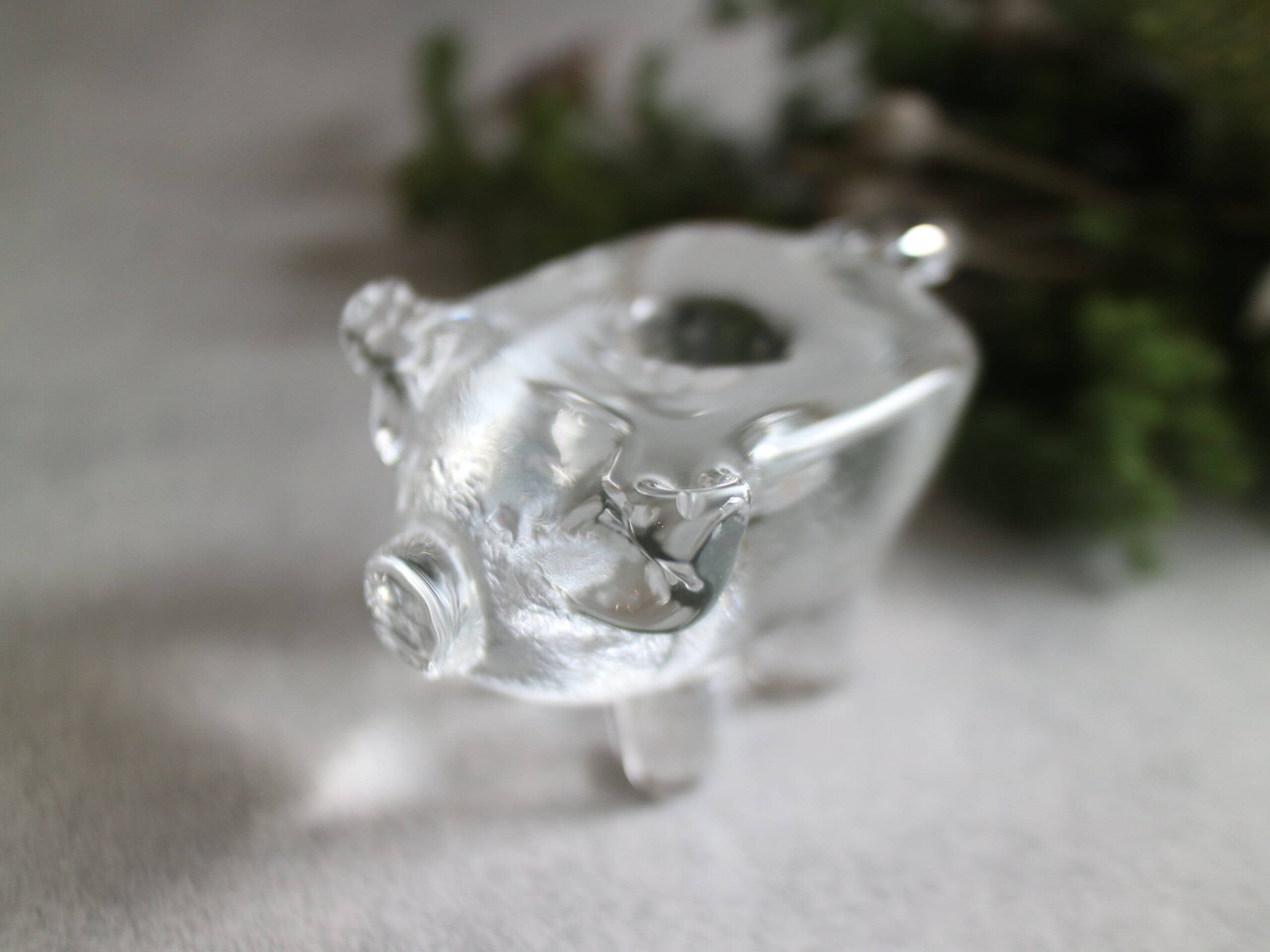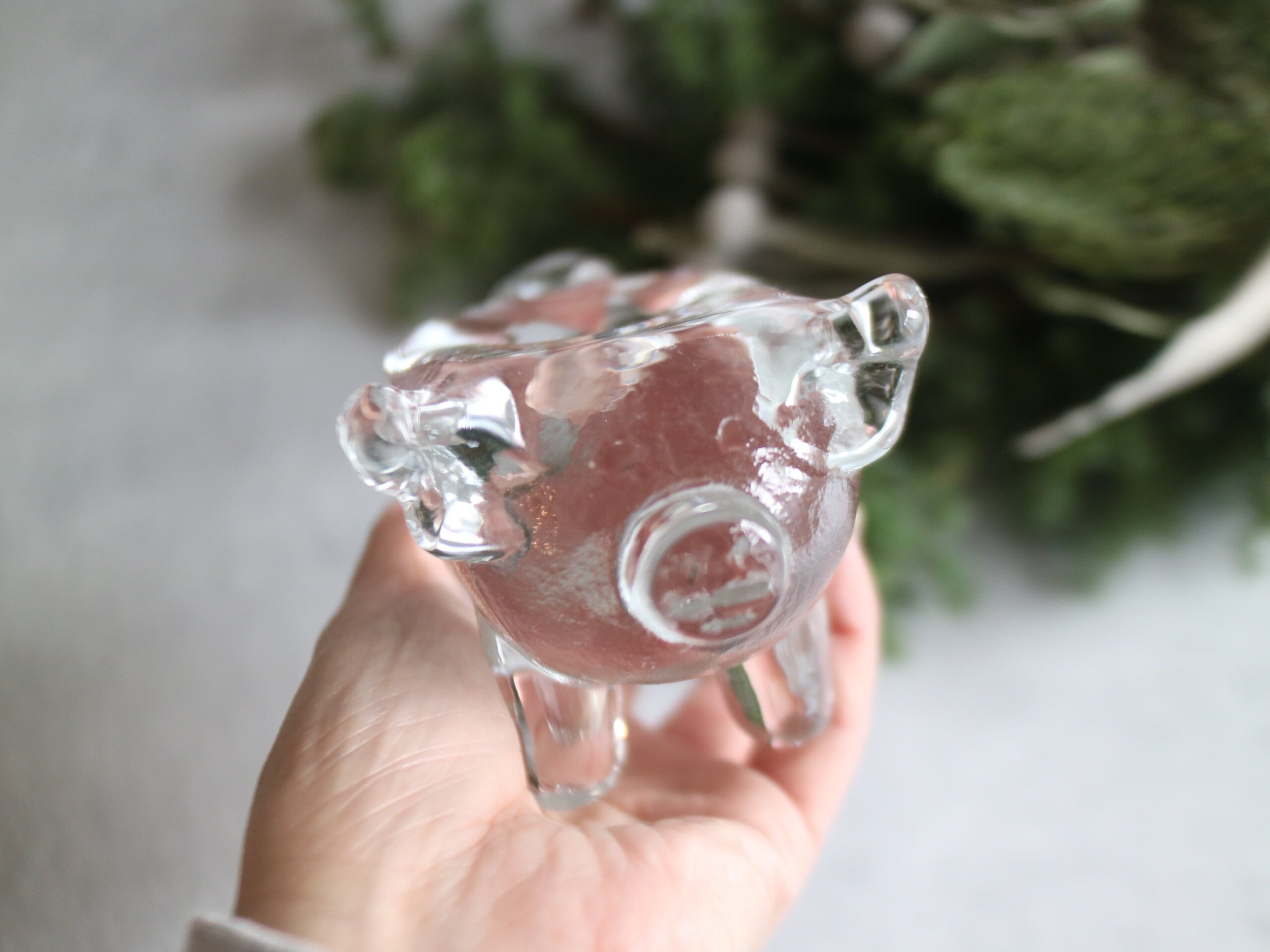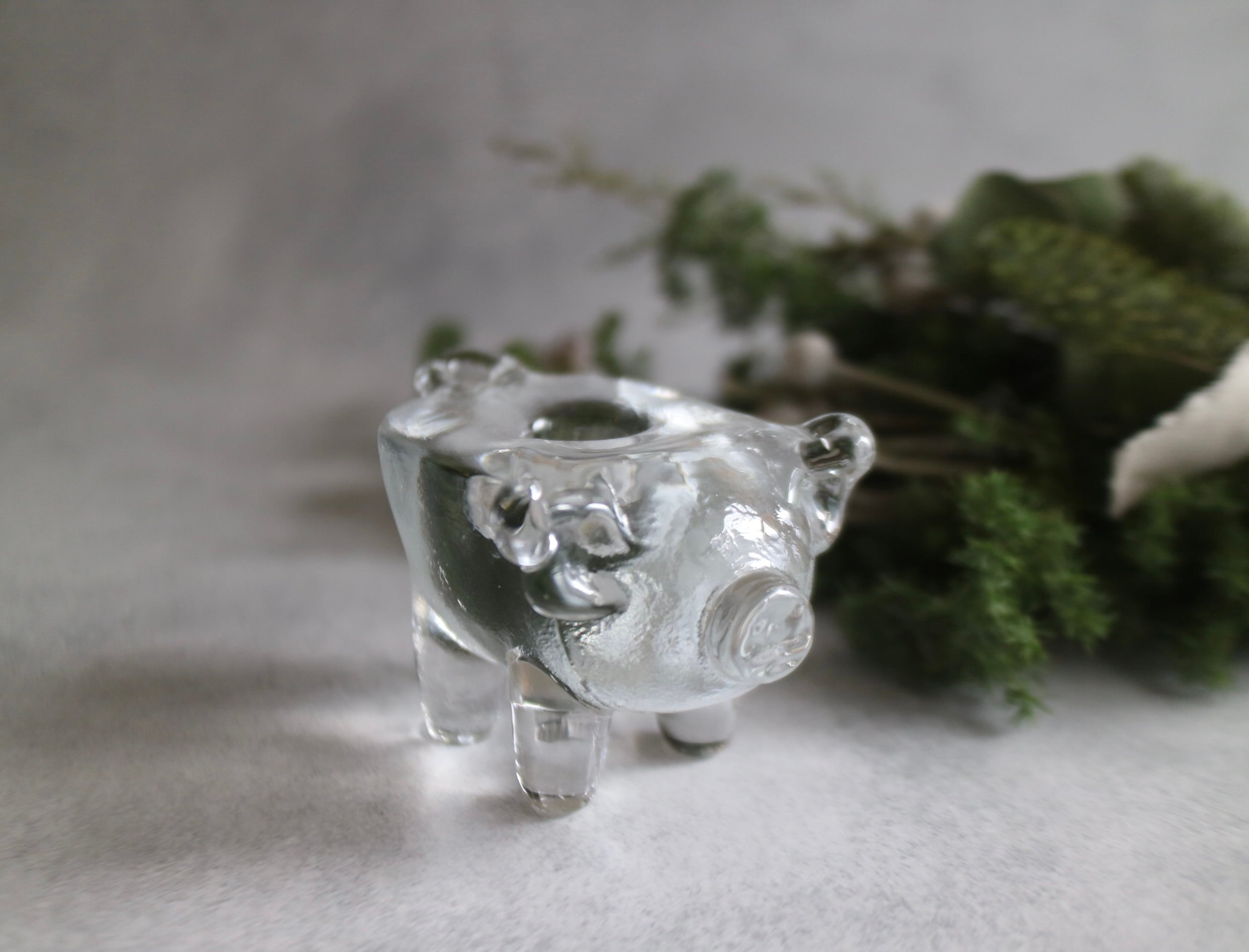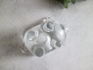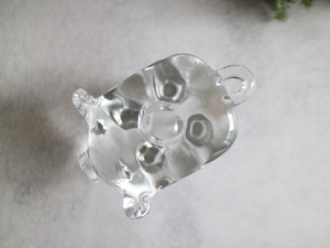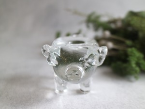 ころんとしたフォルムに、つぶらな表情のブタさんがこちらを見上げているような、ユーモアと温もりを感じるガラスのキャンドルスタンドです。