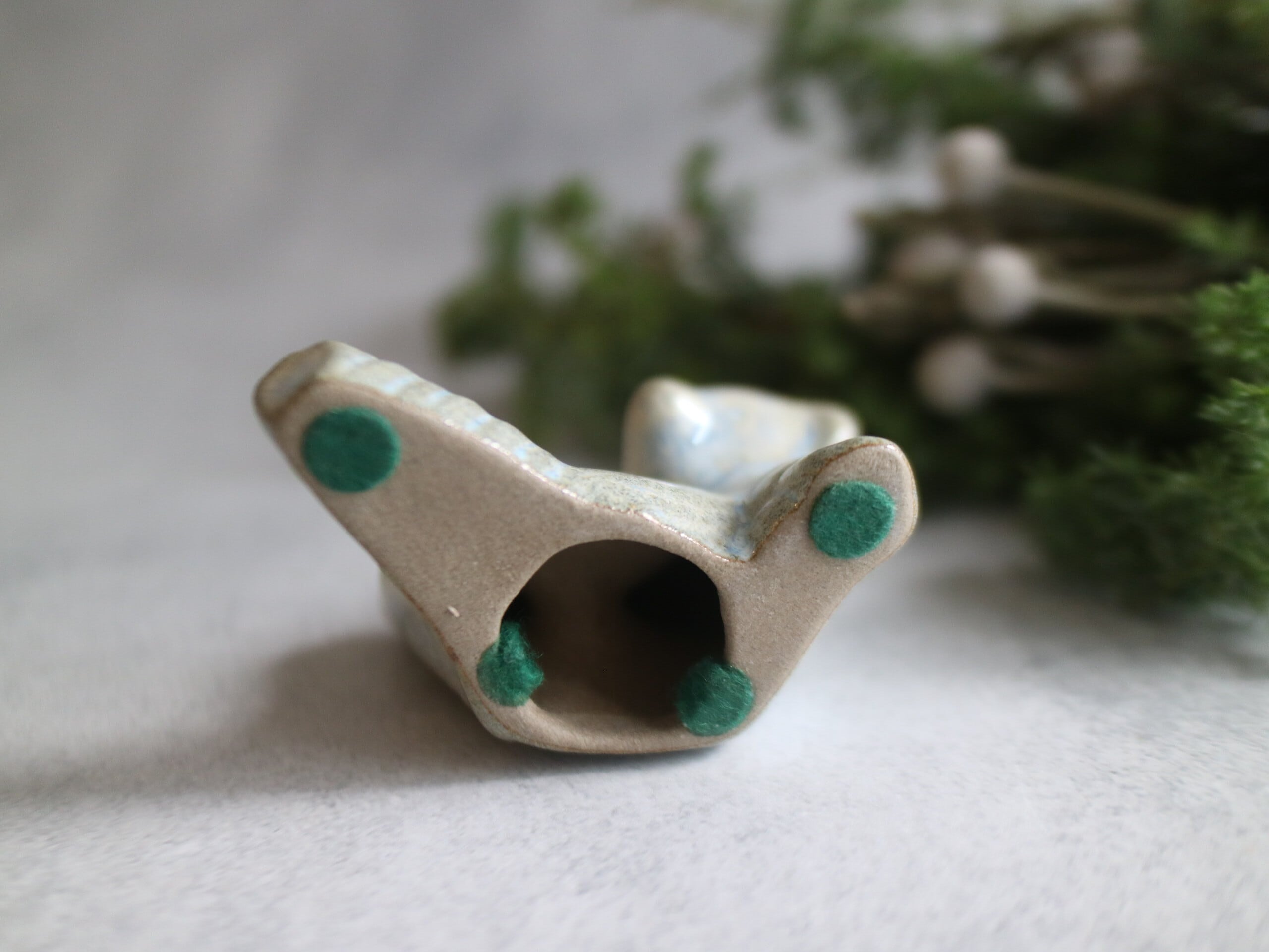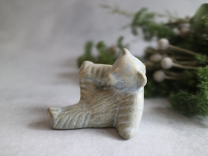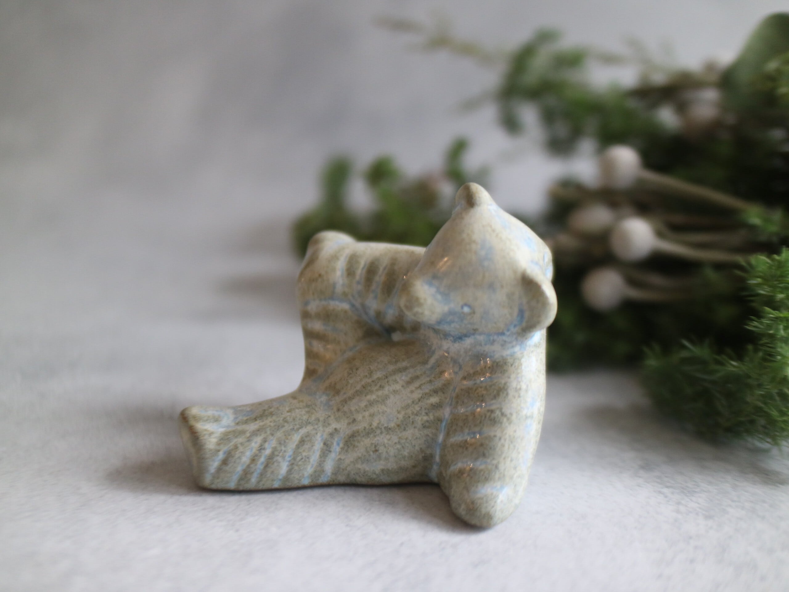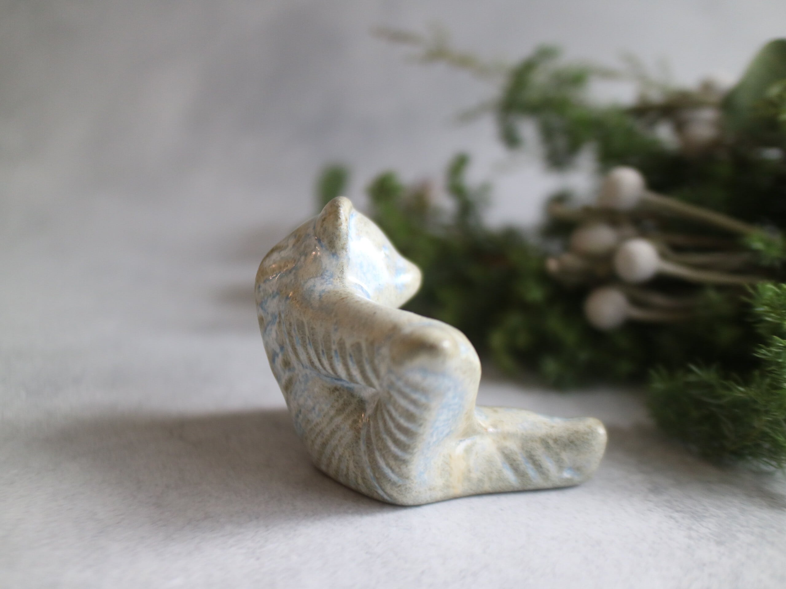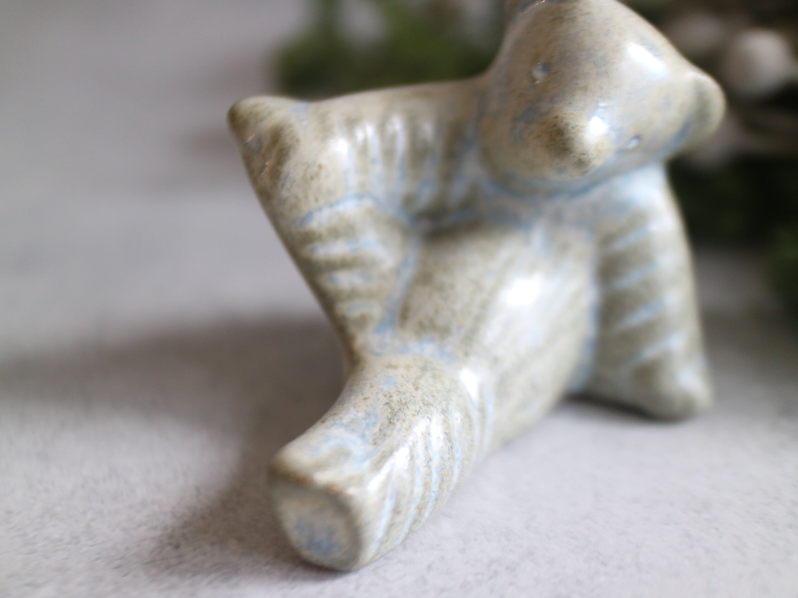 輪郭や毛並みに沿ってかかる 淡いブルーの釉薬。