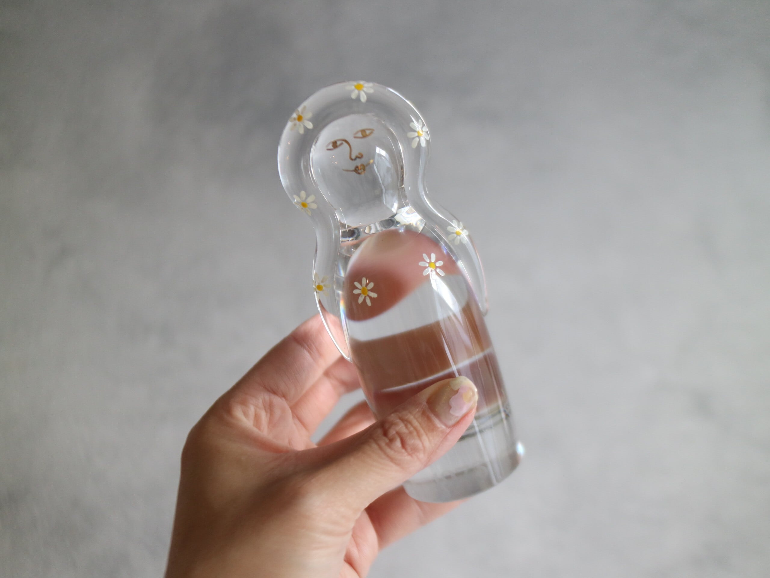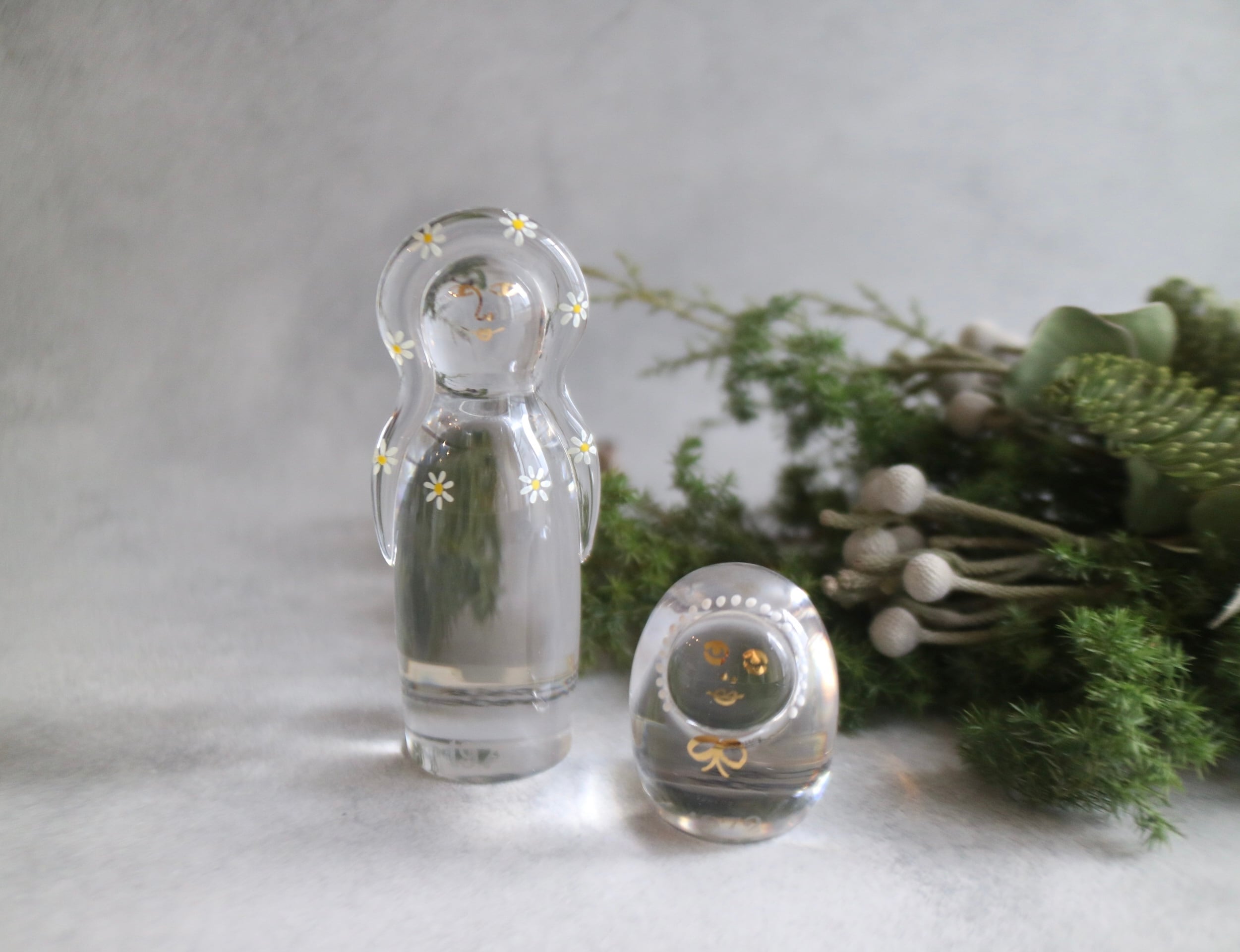 透明なガラスの中に描かれた、金彩のやさしい表情。まわりを囲む小さな白い花が、静かに寄り添います。