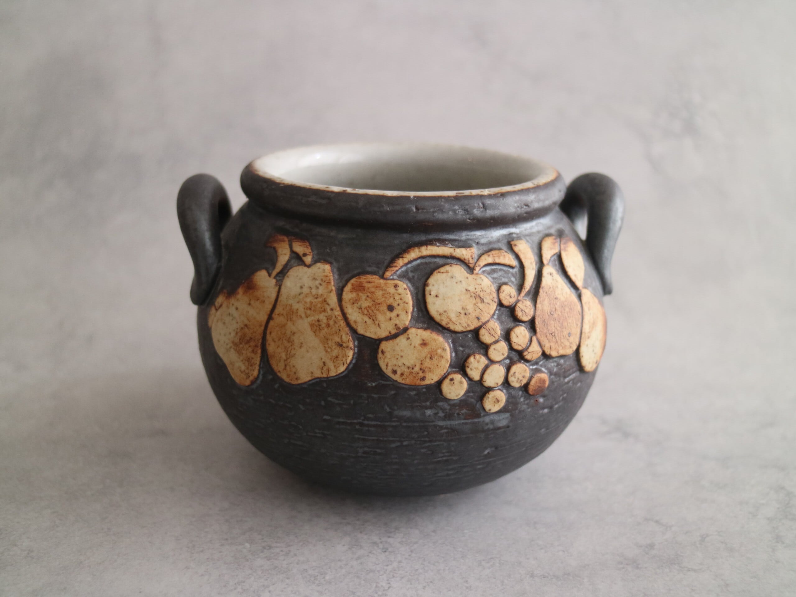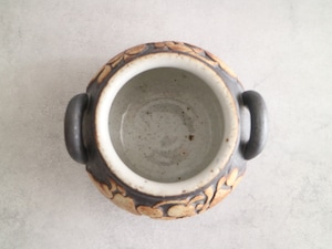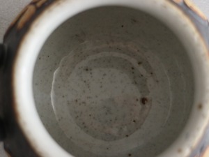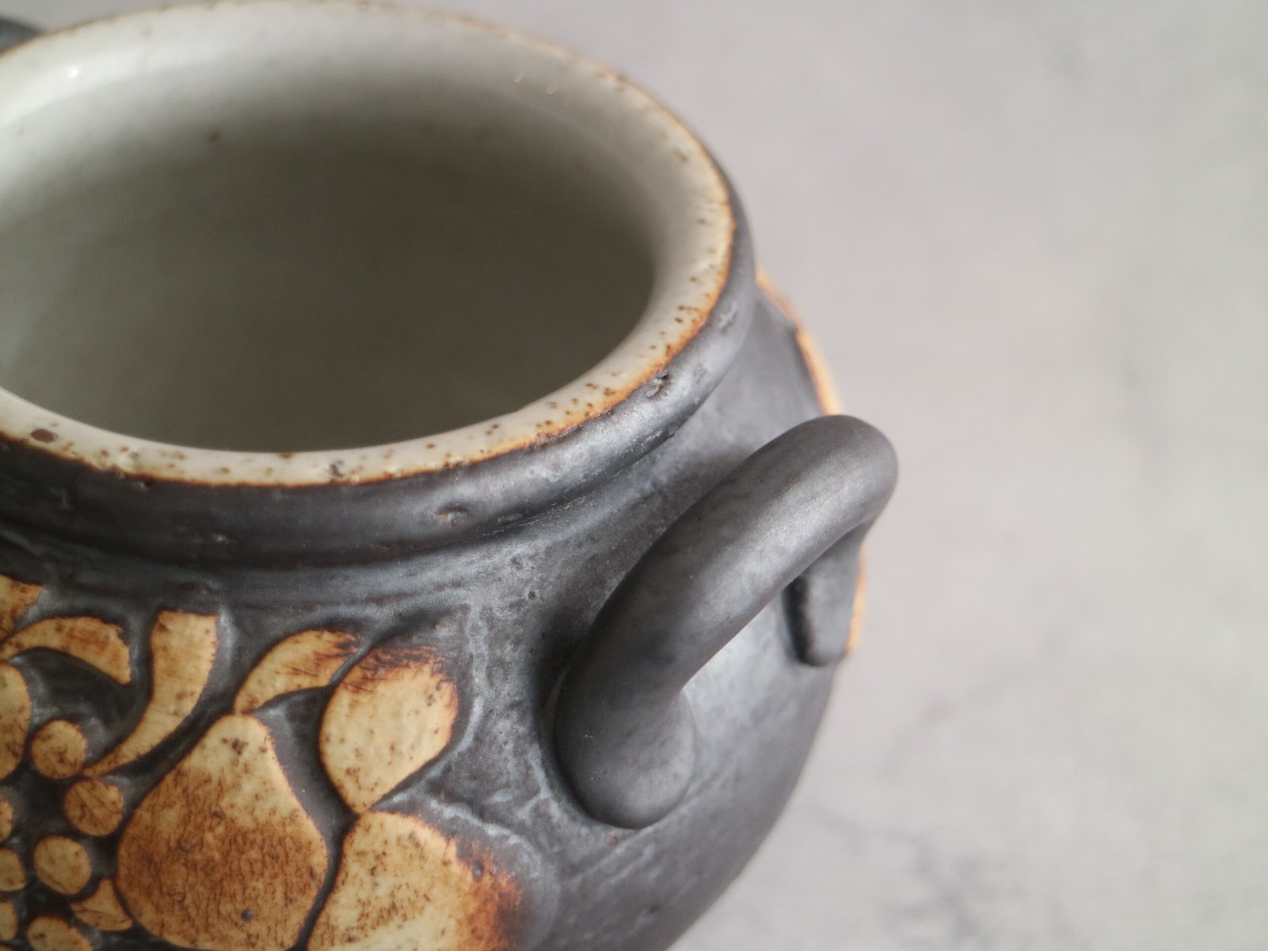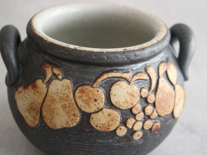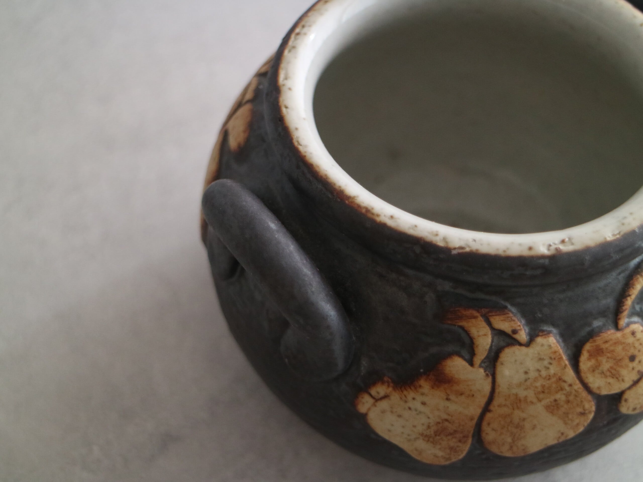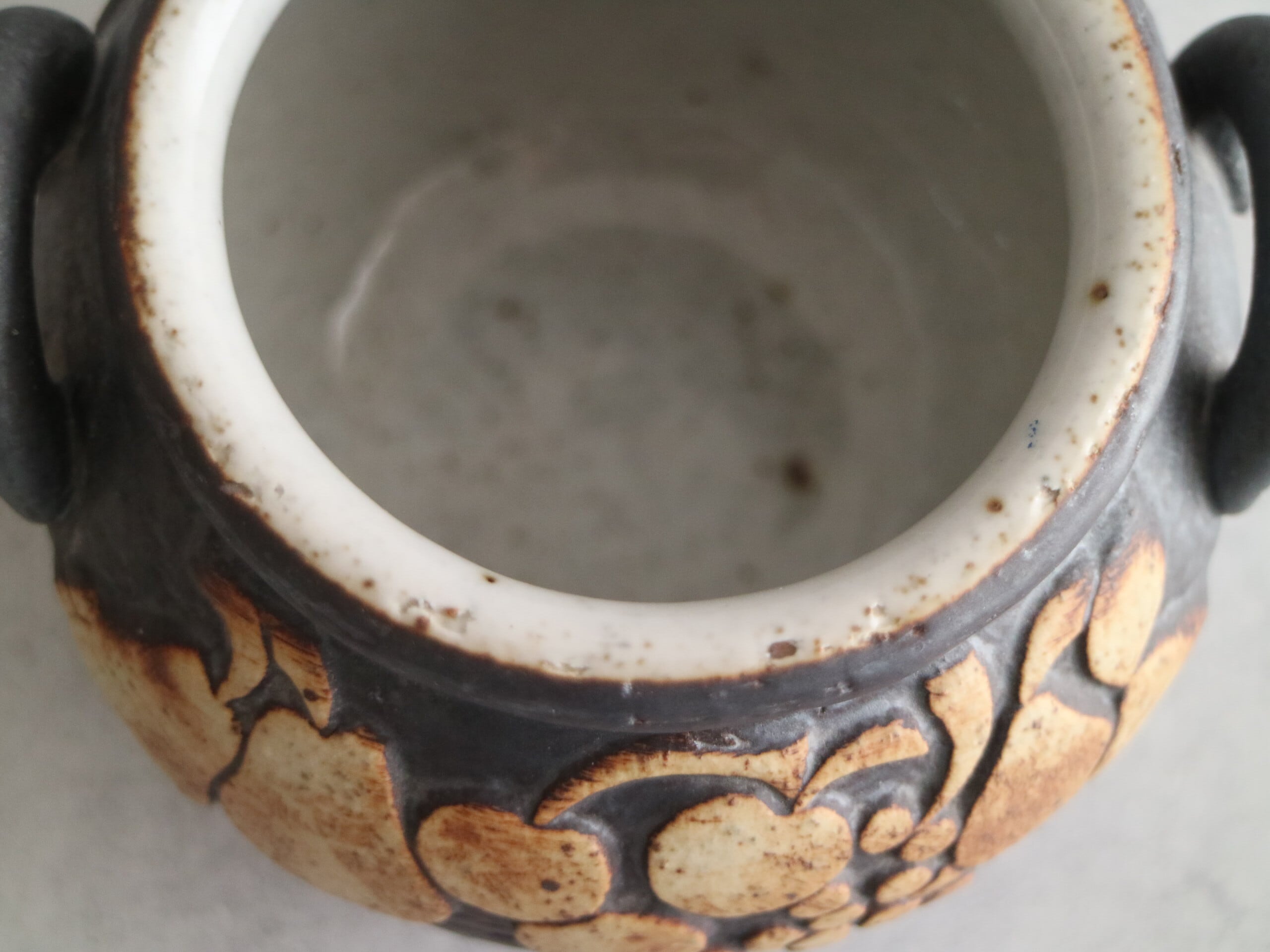 ポットの縁に製造時に出来たピンホールがございます。これは素焼きの段階で器に含まれた空気が焼成時に釉薬の表面で気泡となって現れるもので欠陥ではございません。その他、ヒビや欠けのような大きなダメージはなく、とても良いヴィンテージコンディションを保っています。