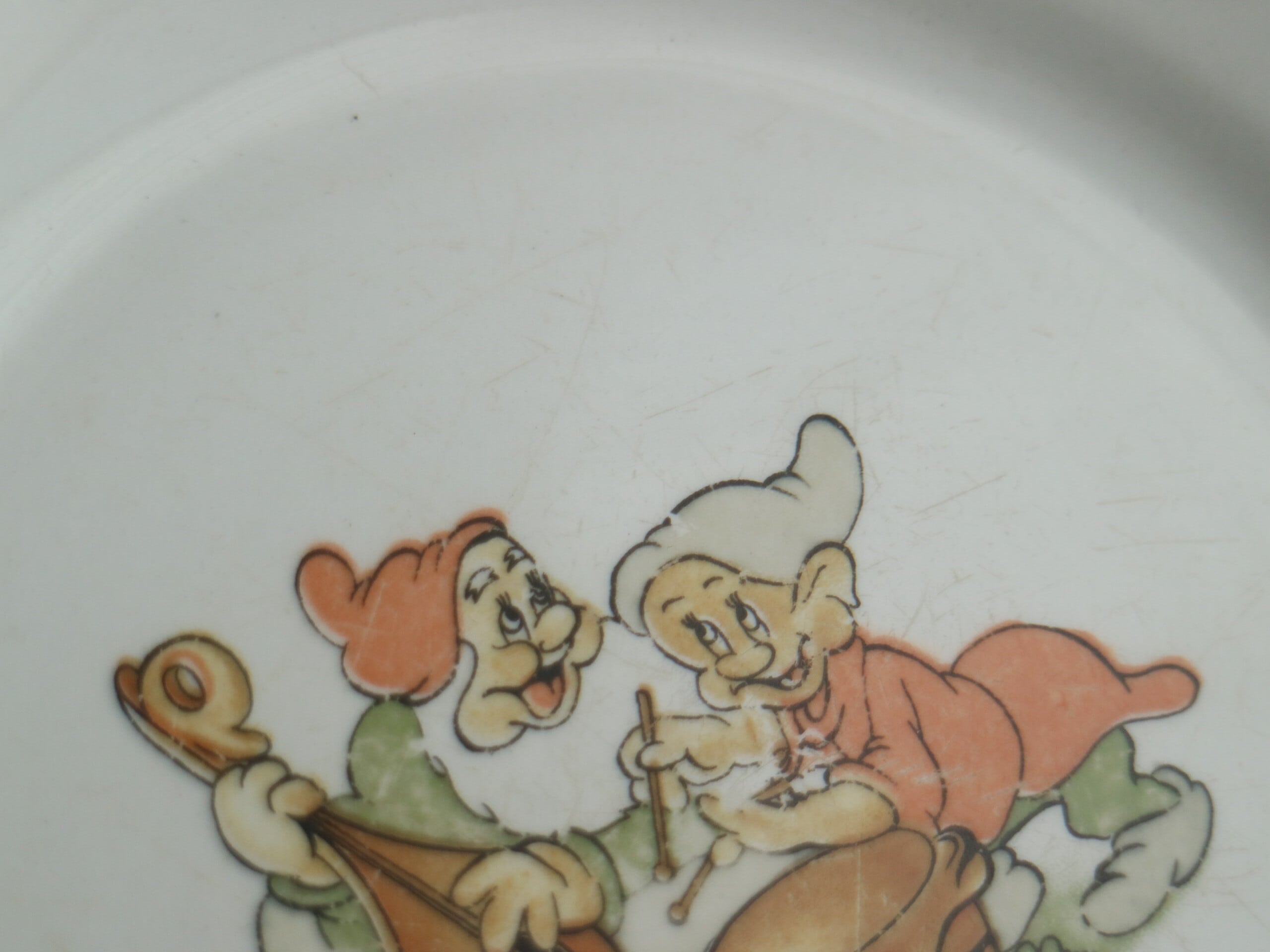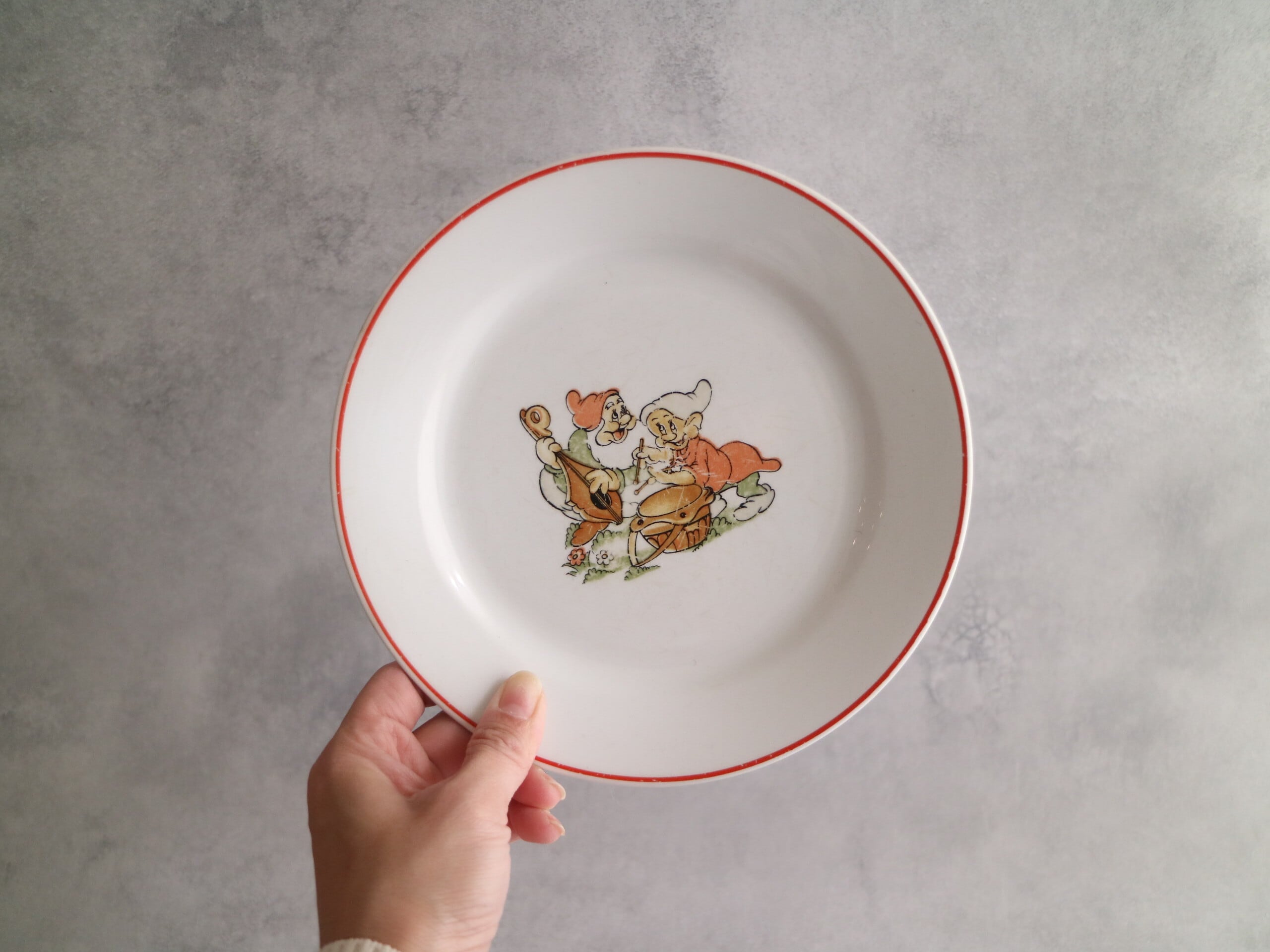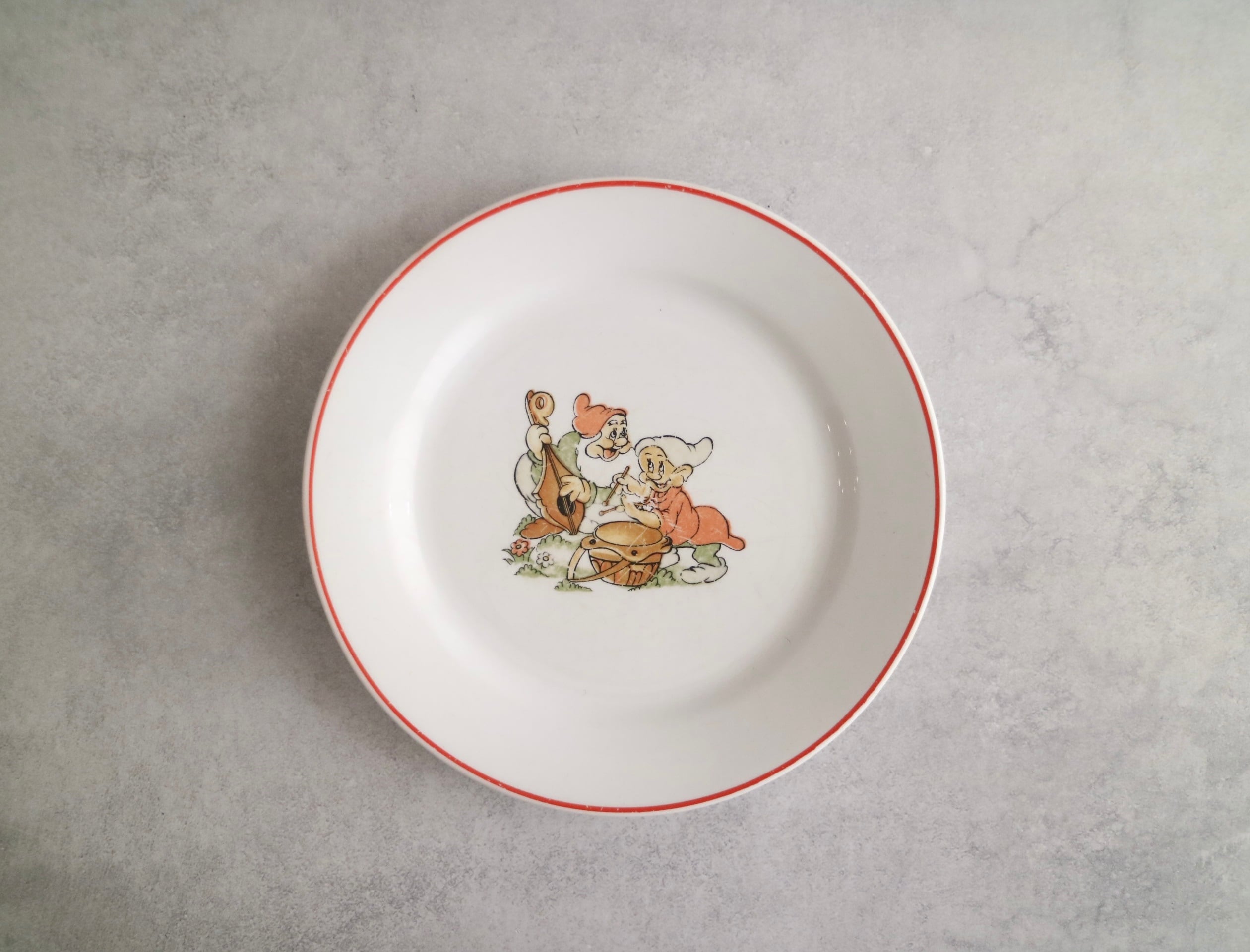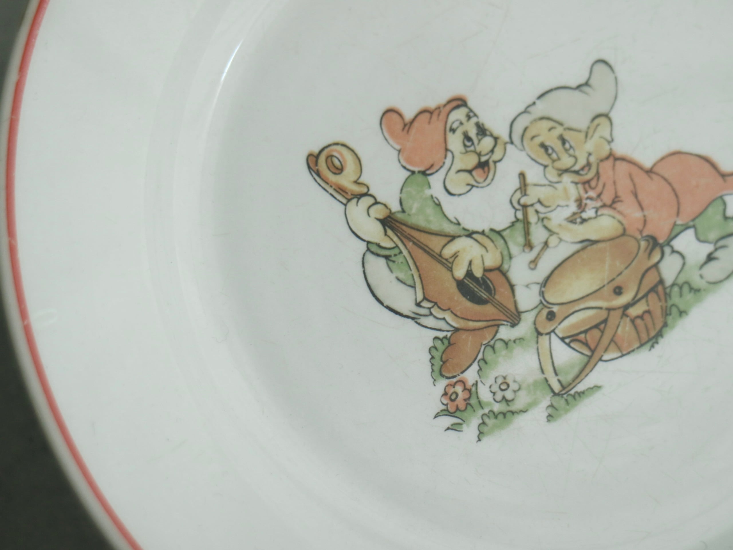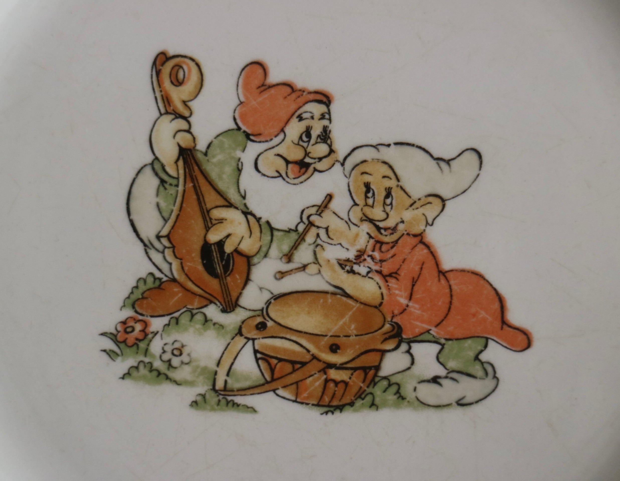 ARABIA社、Walt Disney 白雪姫に登場する7人の小人のプレートです。描かれているのは、DopeyとSneezyでしょうか。 楽しそうに楽器を演奏している場面が描かれています。
