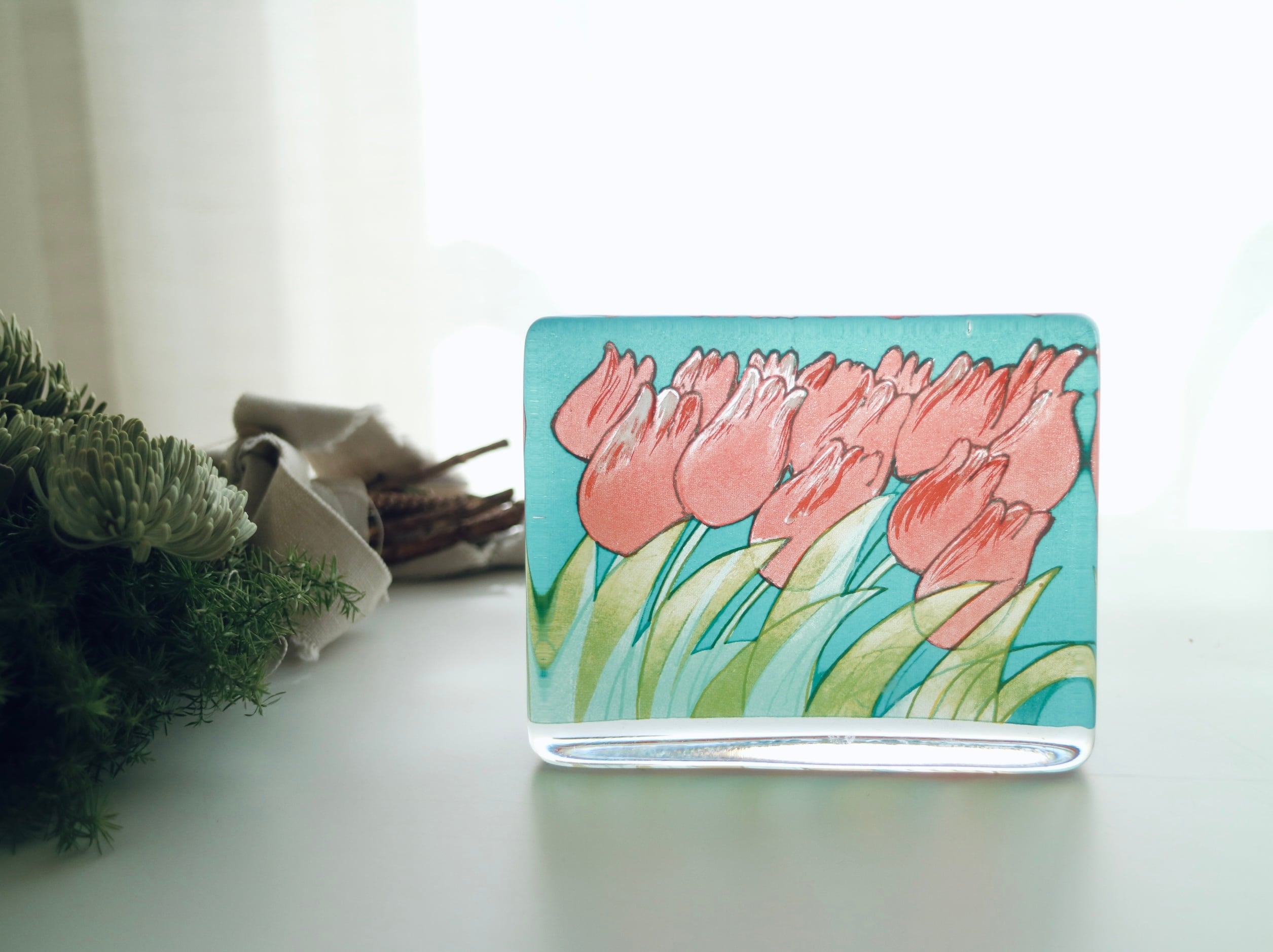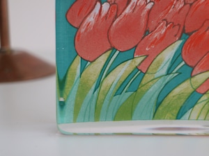 ガラスいっぱいに咲く、可愛らしいチューリップ。見ているだけで、春の明るい空気を運んできてくれるような作品です。