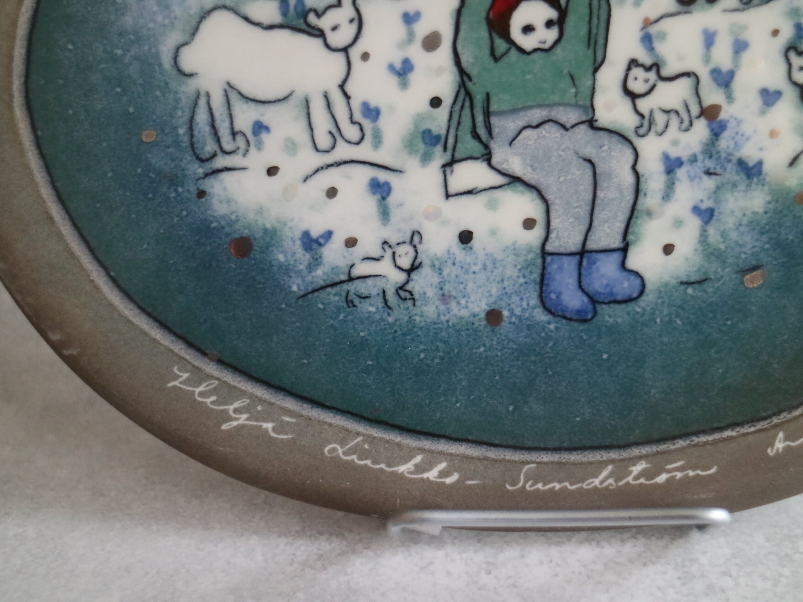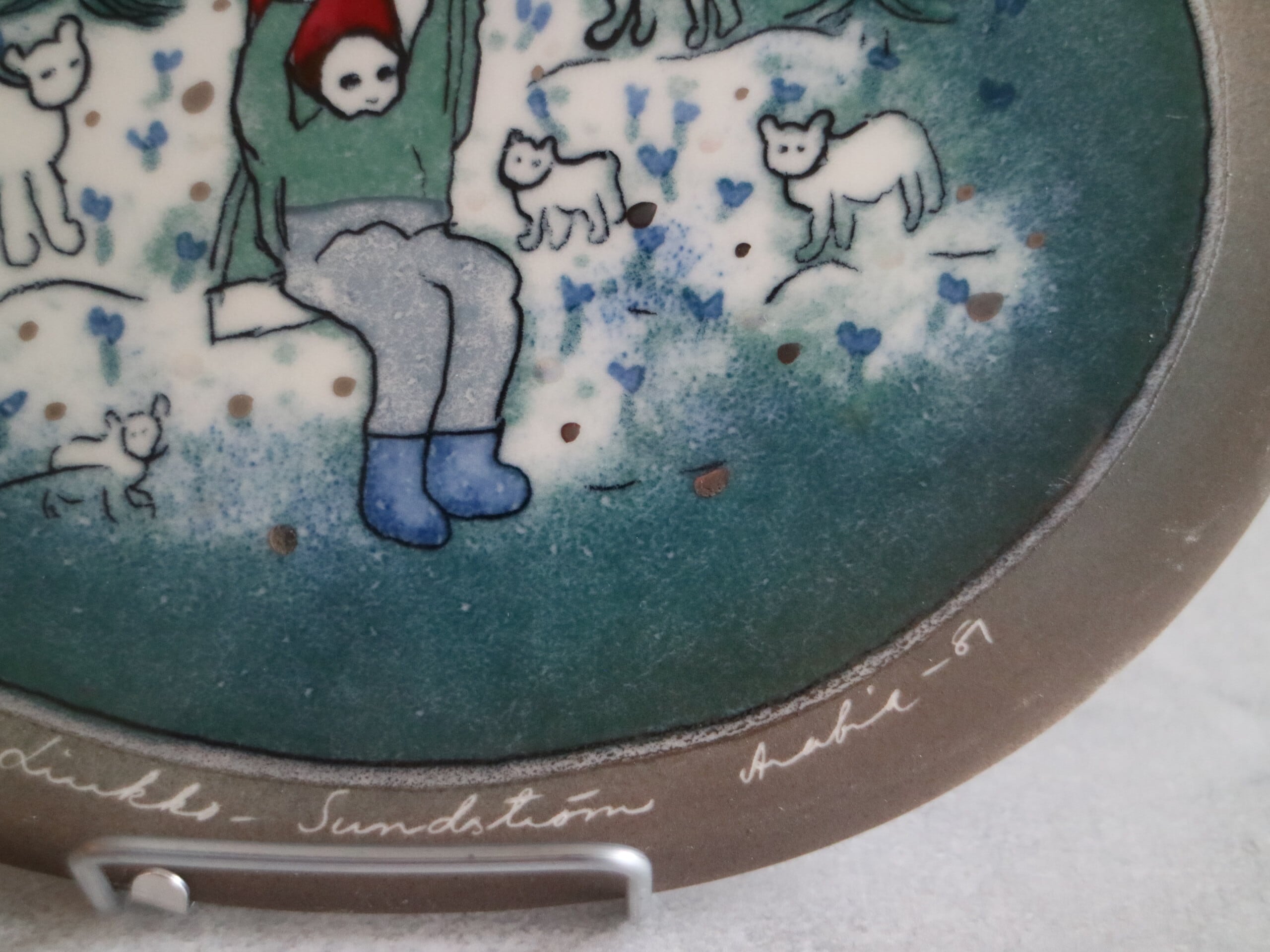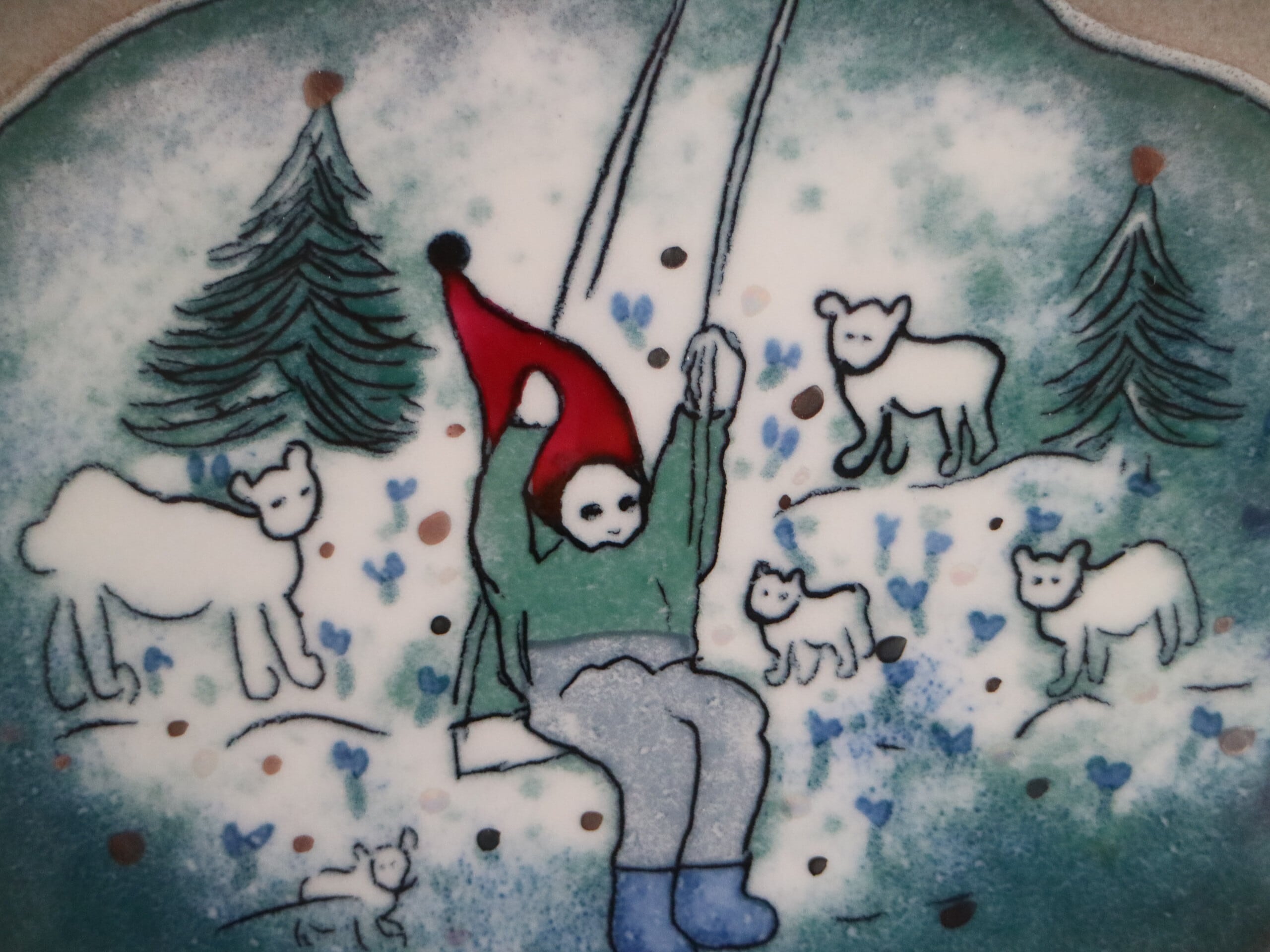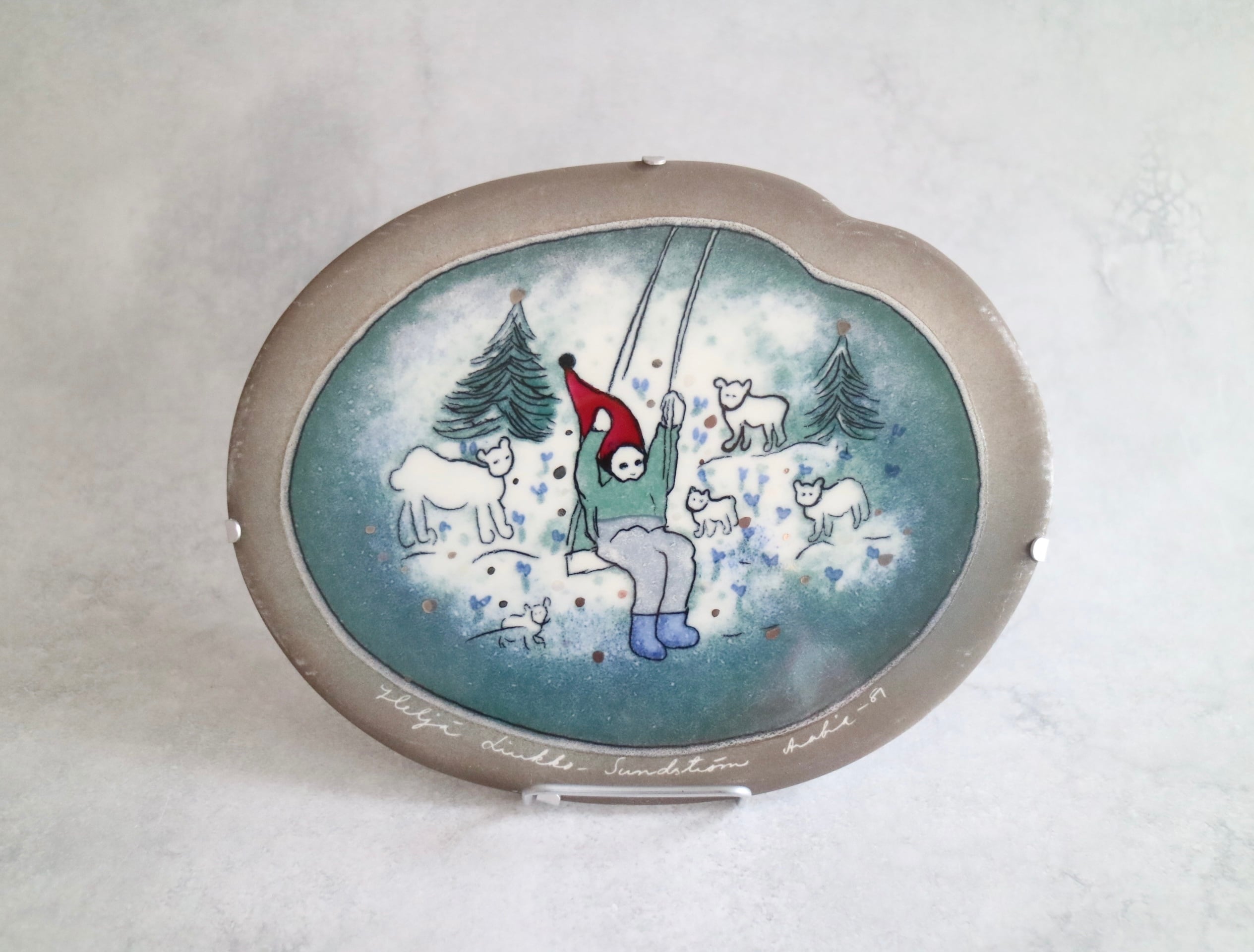 ARABIA社製Heljä Liukko-Sundström(ヘルヤ・リウッコ=スンドストロム)による陶板作品です。タイトルは 「Keinuva tonttu(ブランコに乗るトントゥ)」。