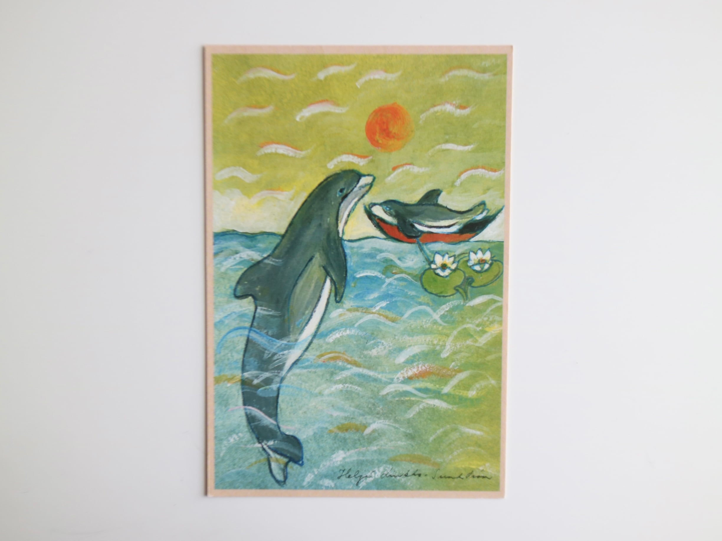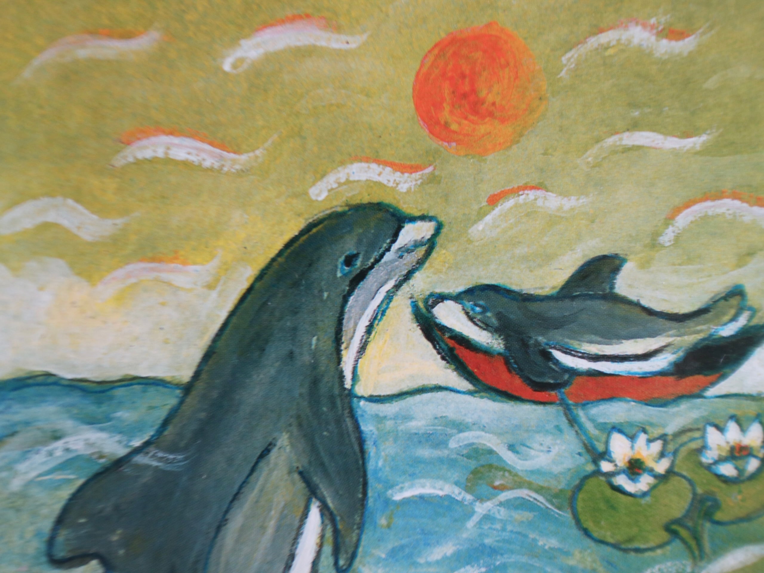 イルカの親子が描かれた一枚。よく見ると、子どものイルカはなぜかボートの上に。