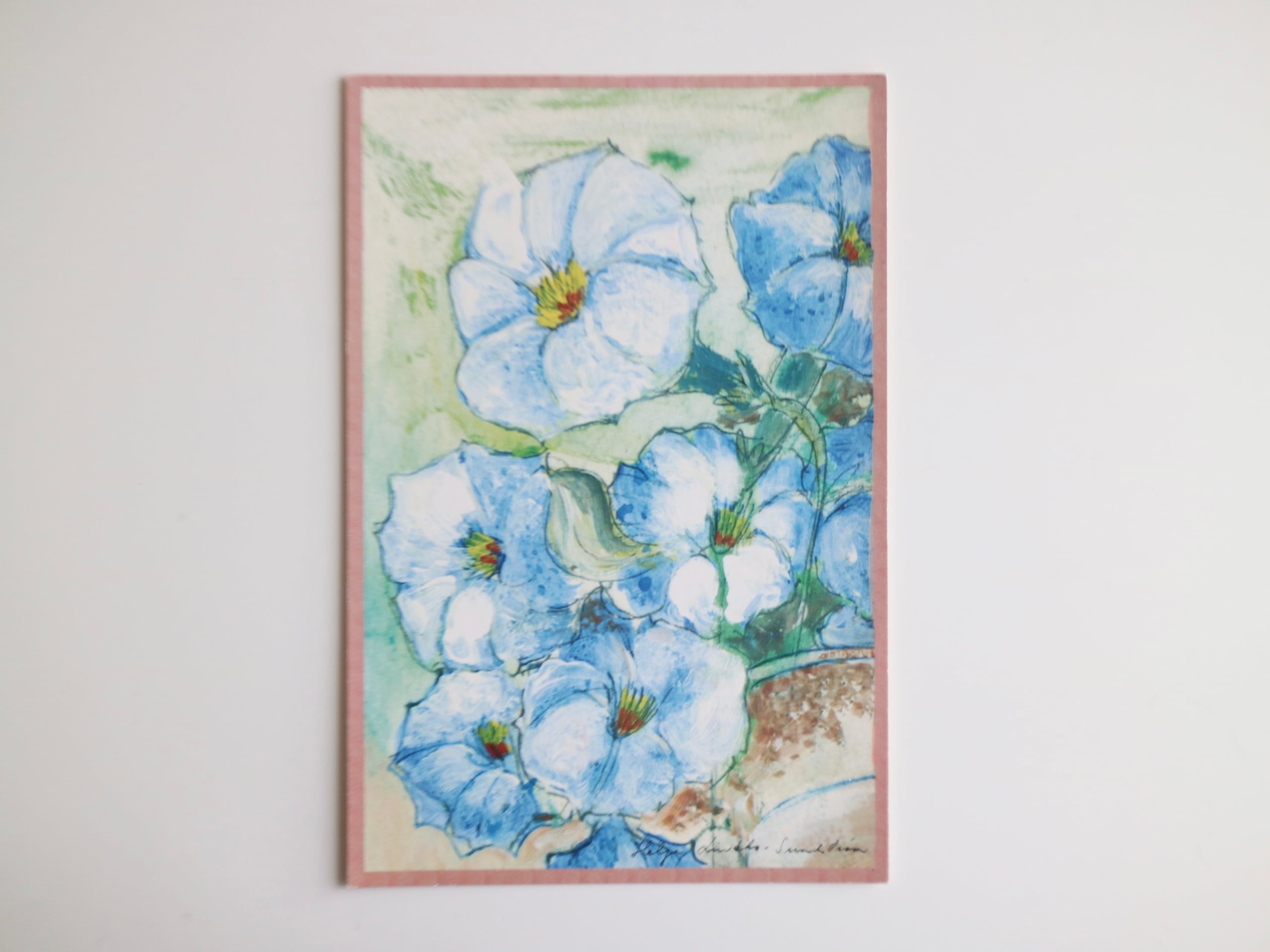 ほんのり淡い青で描かれた花。やさしい色の重なりの中に、少しだけ深い青も感じられます。