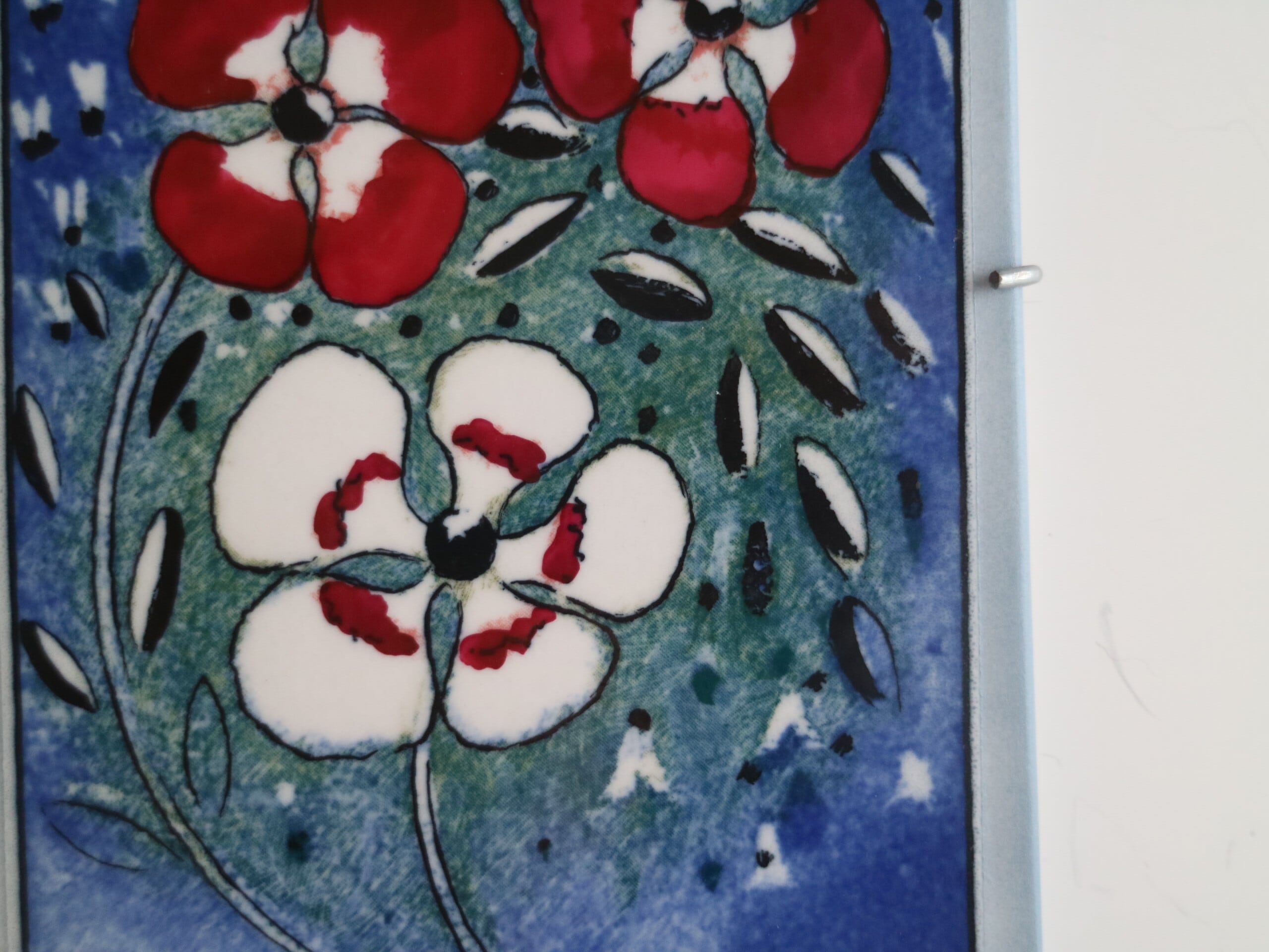 陶板に描かれているのは、やさしく咲くパンジーの花々。赤と白の花びらがブルーの背景に映え、やわらかなにじみがヘルヤらしい一枚です。