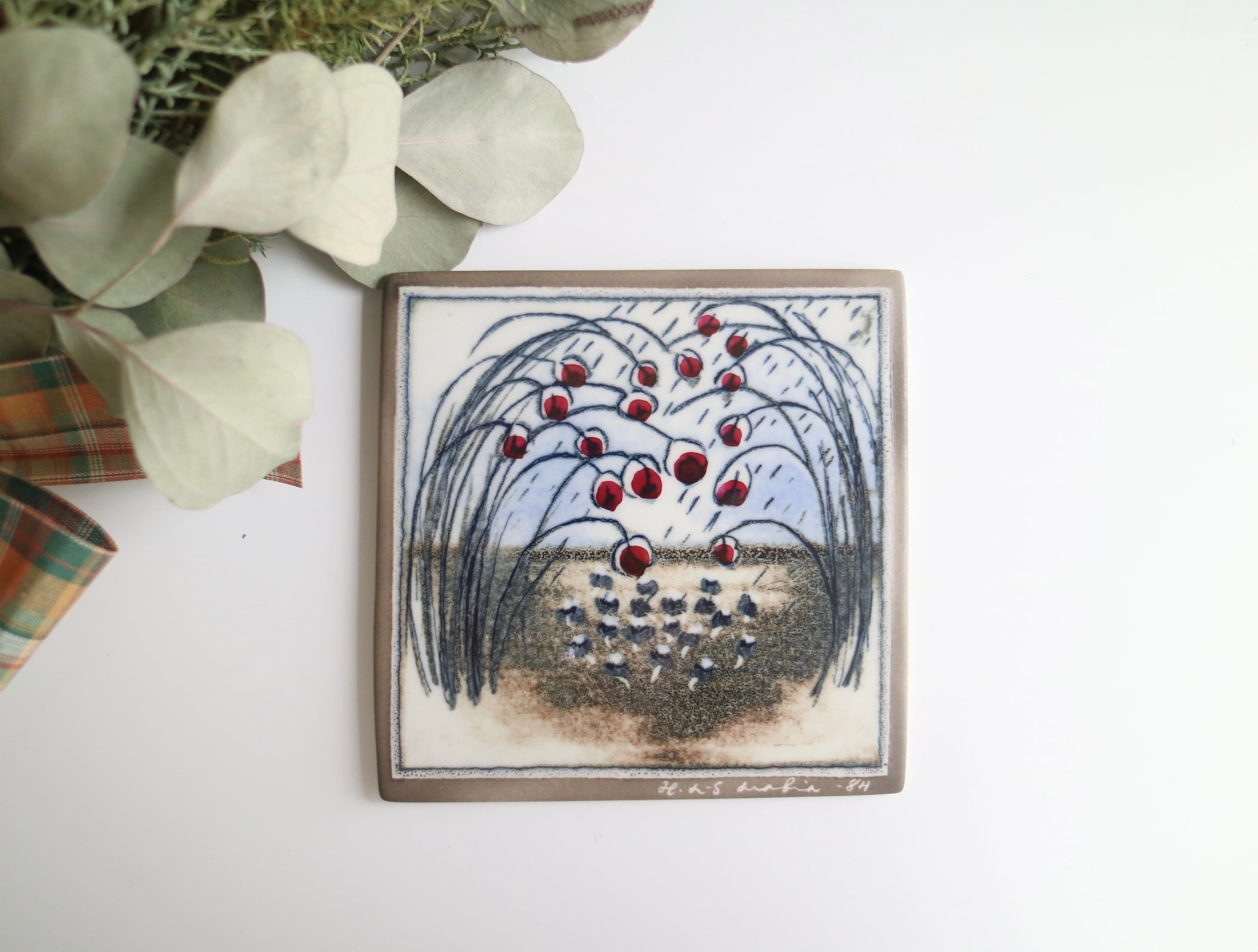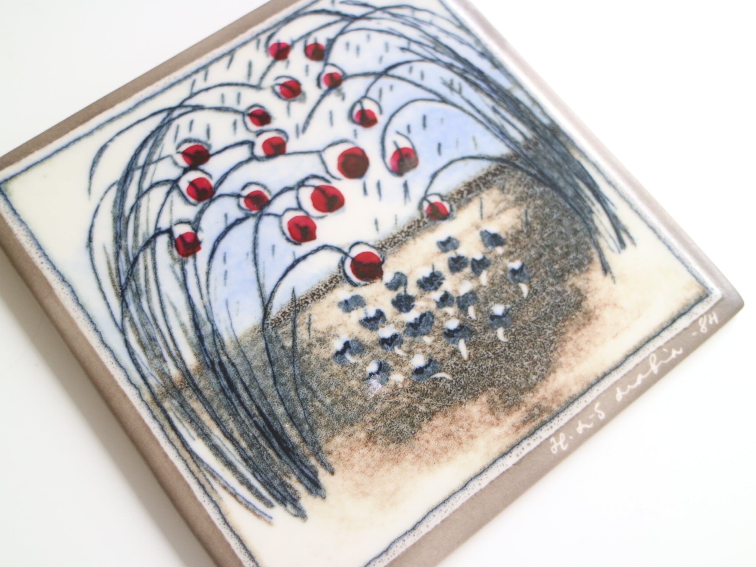 しなやかに垂れる枝と、艶やかな赤い実。静かな風景の中に、ぱっと目を引く赤が印象的な陶板です。