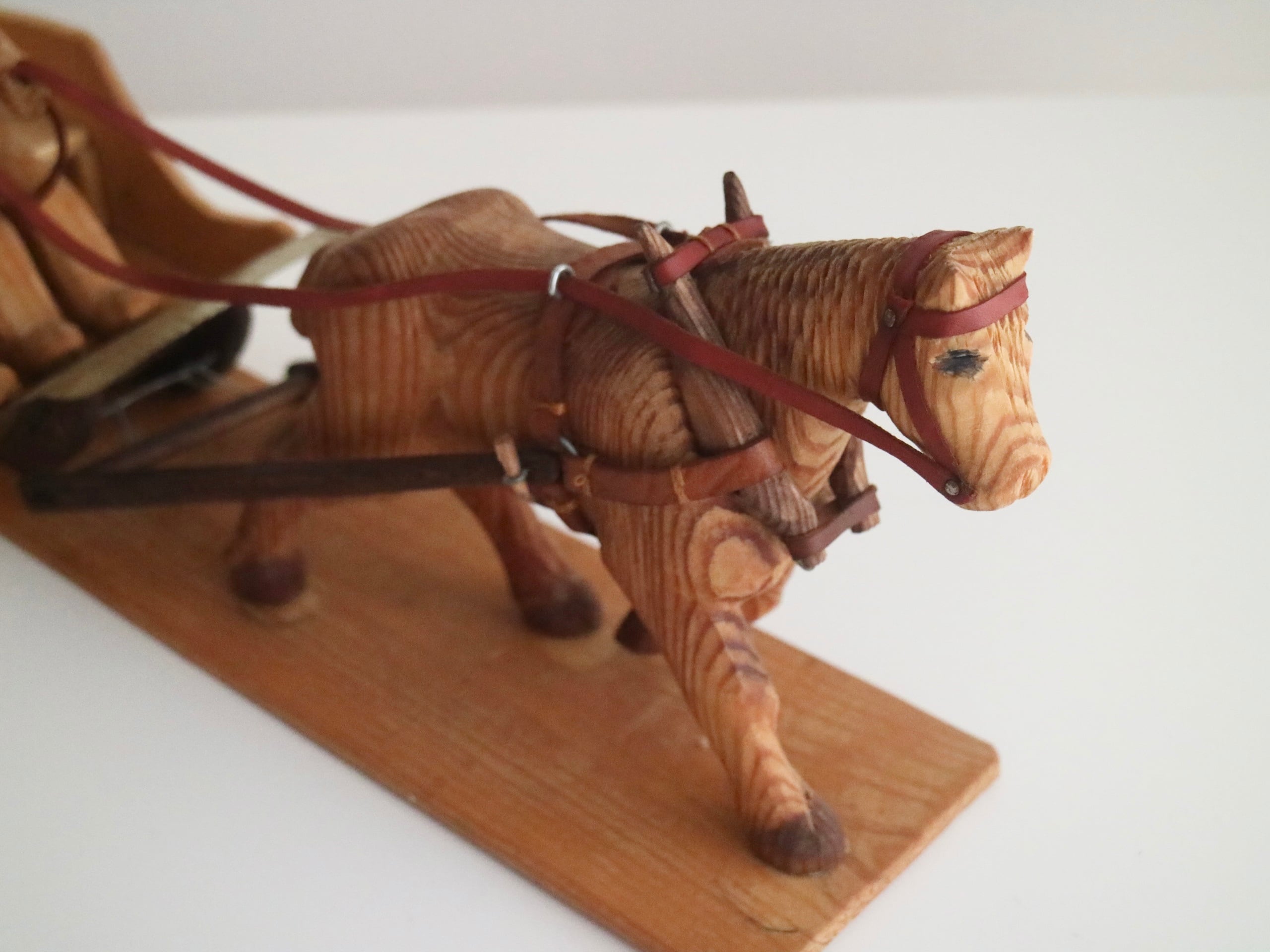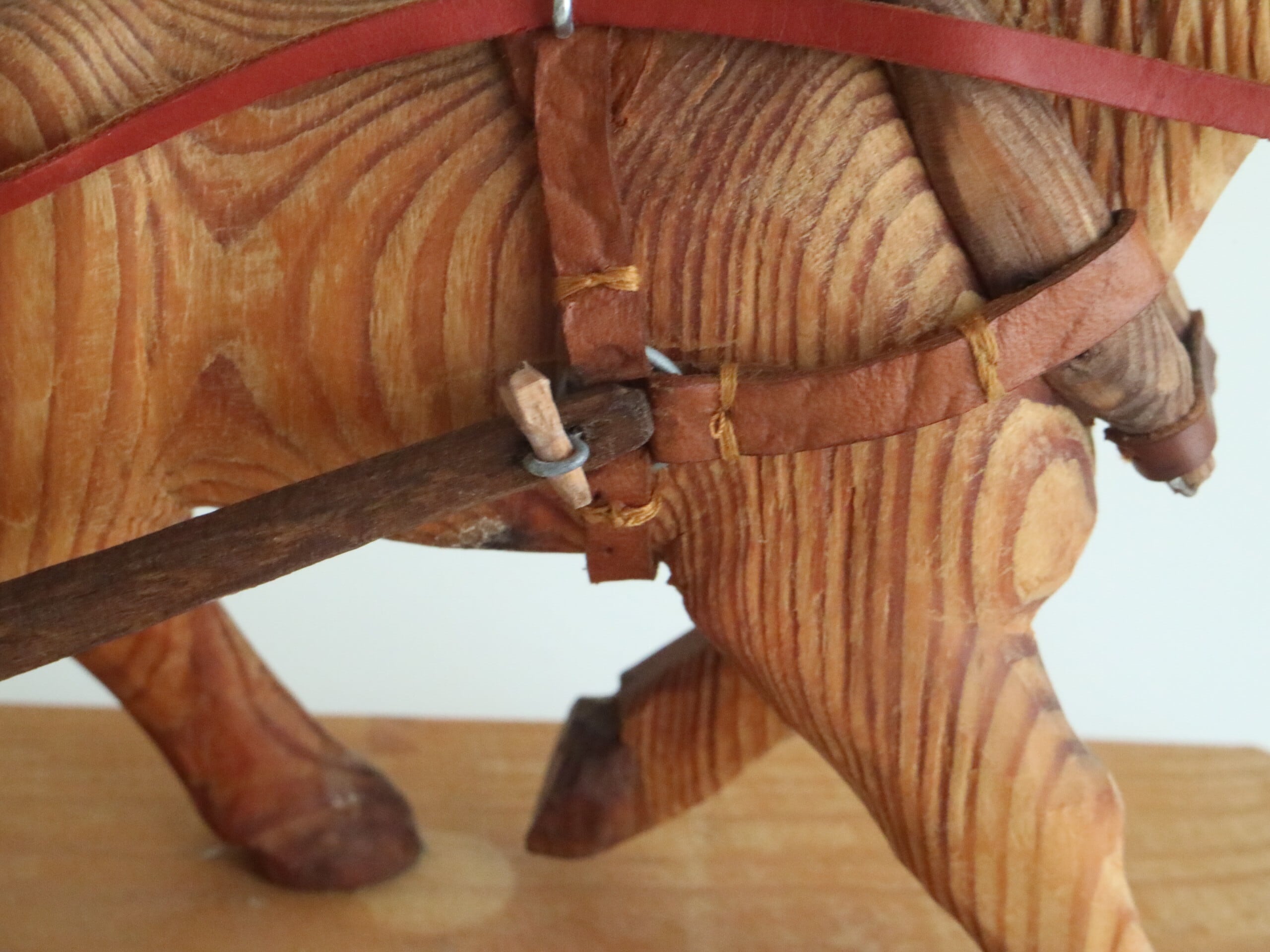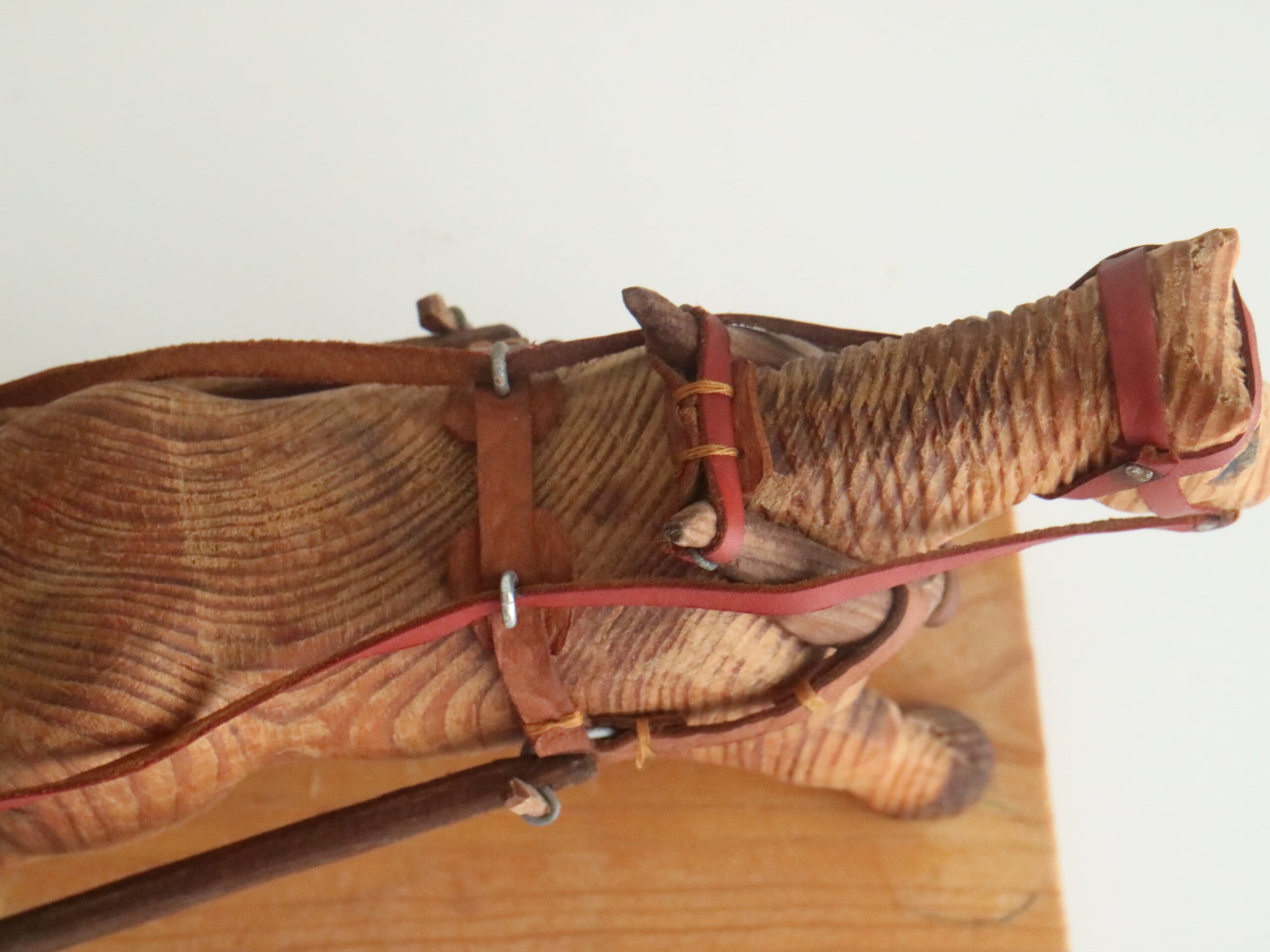 やわらかな木の表情と、革の手綱や金具の細かなつくり。じっくりと手をかけて仕上げられたことが伝わってくる、あたたかみのある一品です。