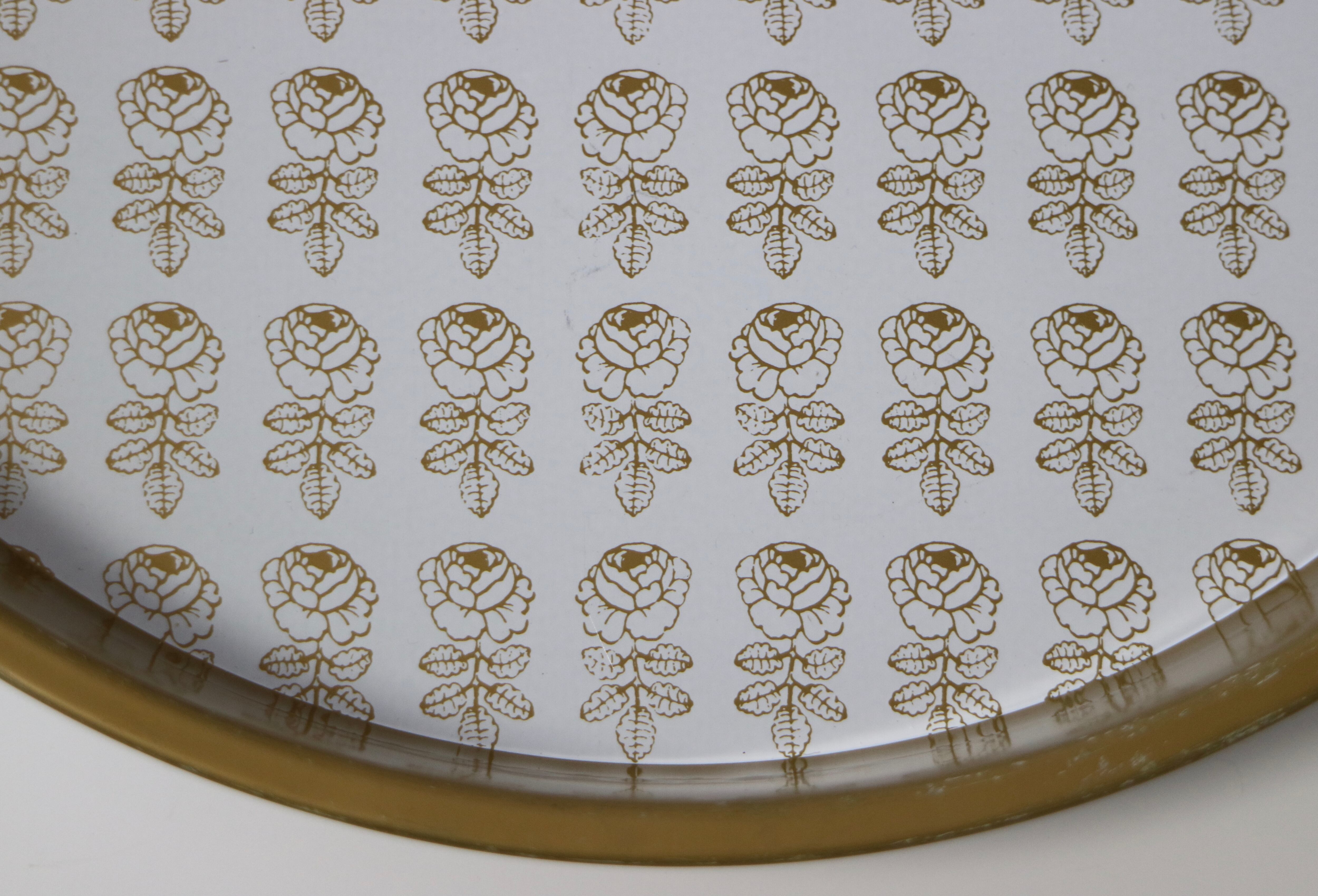 marimekko社 ピックルース柄の丸いブリキのトレイです。こちらはなかなか市場に出回らない珍しい商品となります。レトロ感たっぷりで、トレイの側面までピックルース柄が描かれています。
