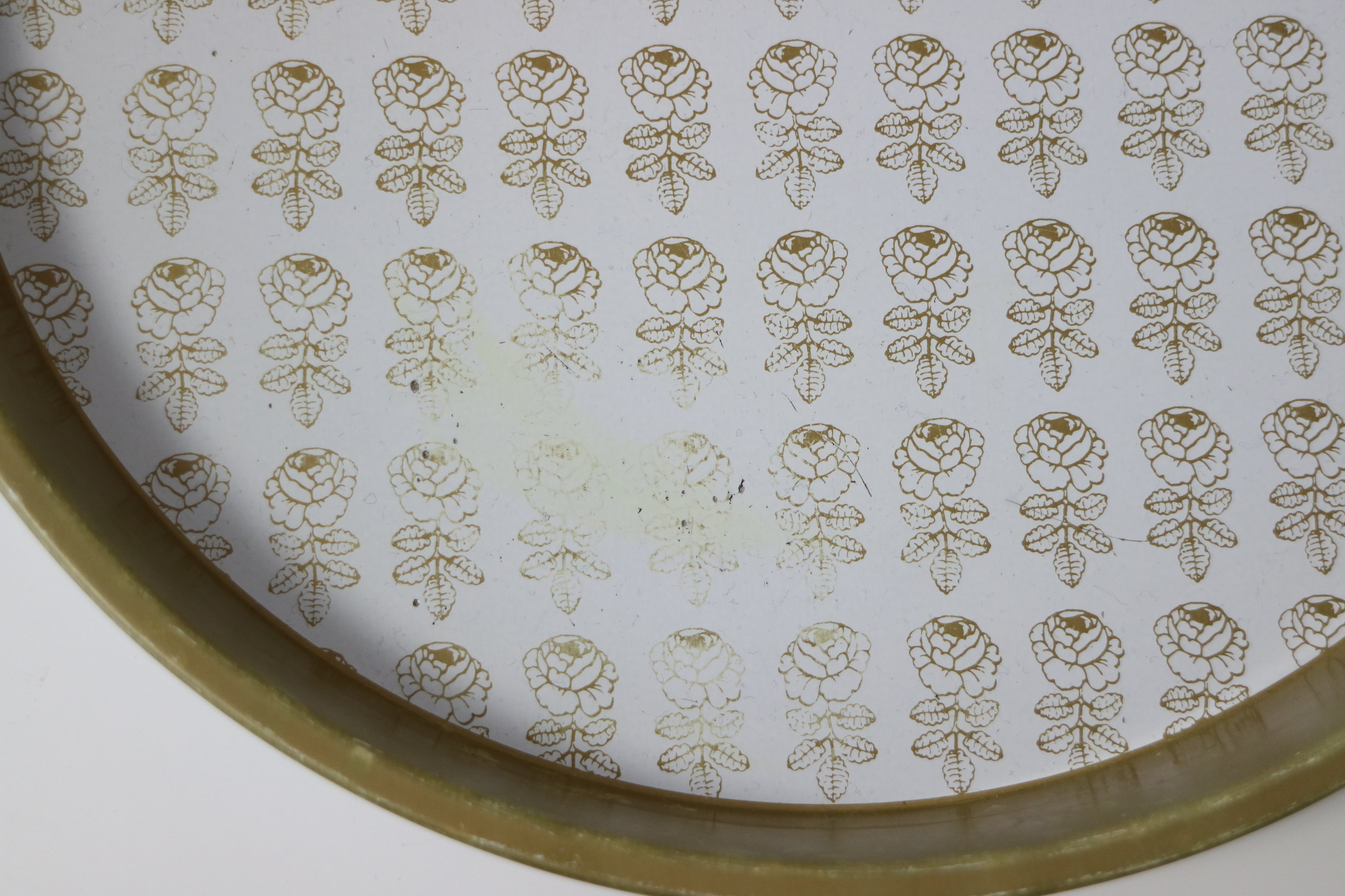 marimekko社 ピックルース柄の丸いブリキのトレイです。こちらはなかなか市場に出回らない珍しい商品となります。レトロ感たっぷりで、トレイの側面までピックルース柄が描かれています。