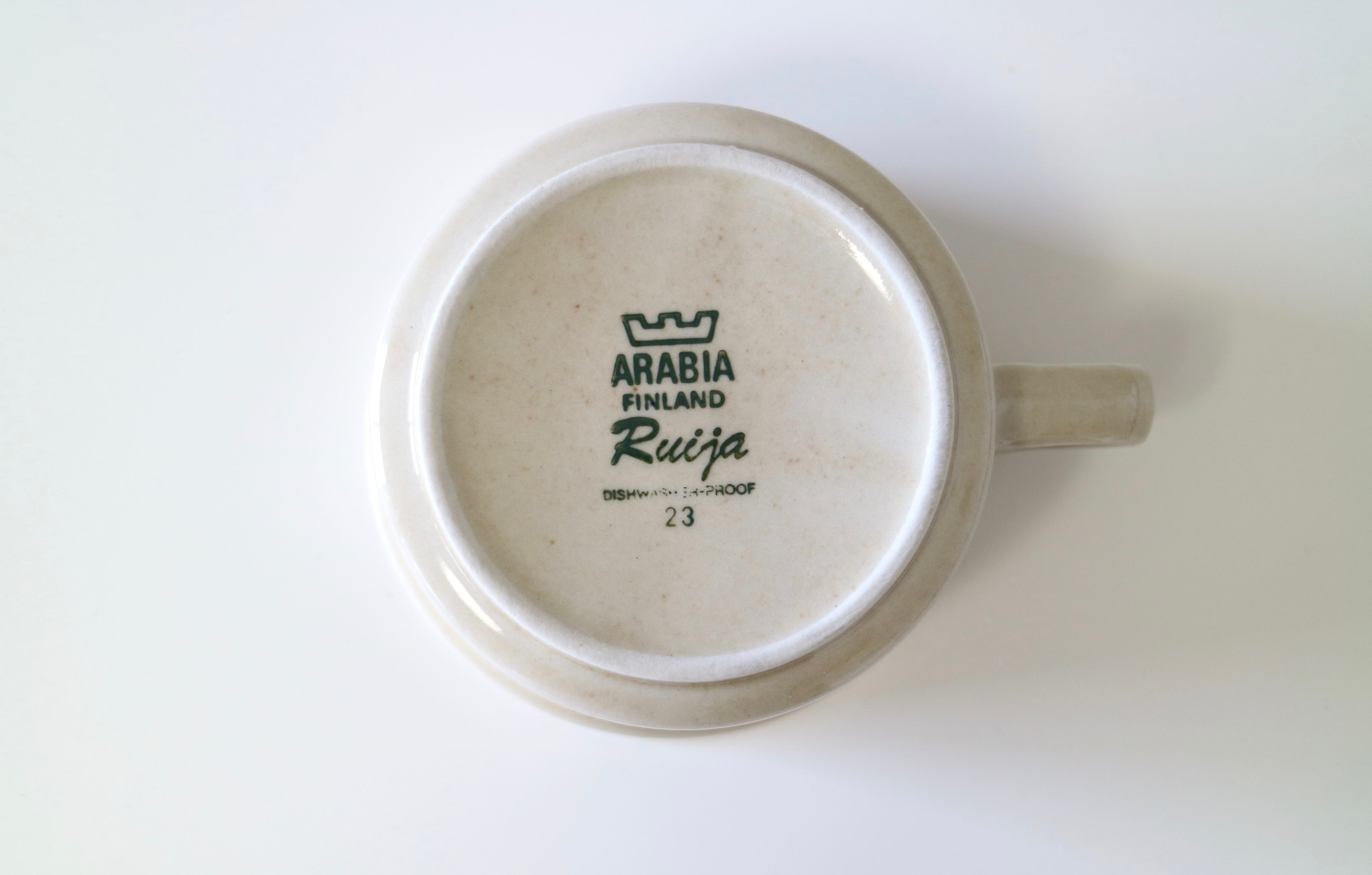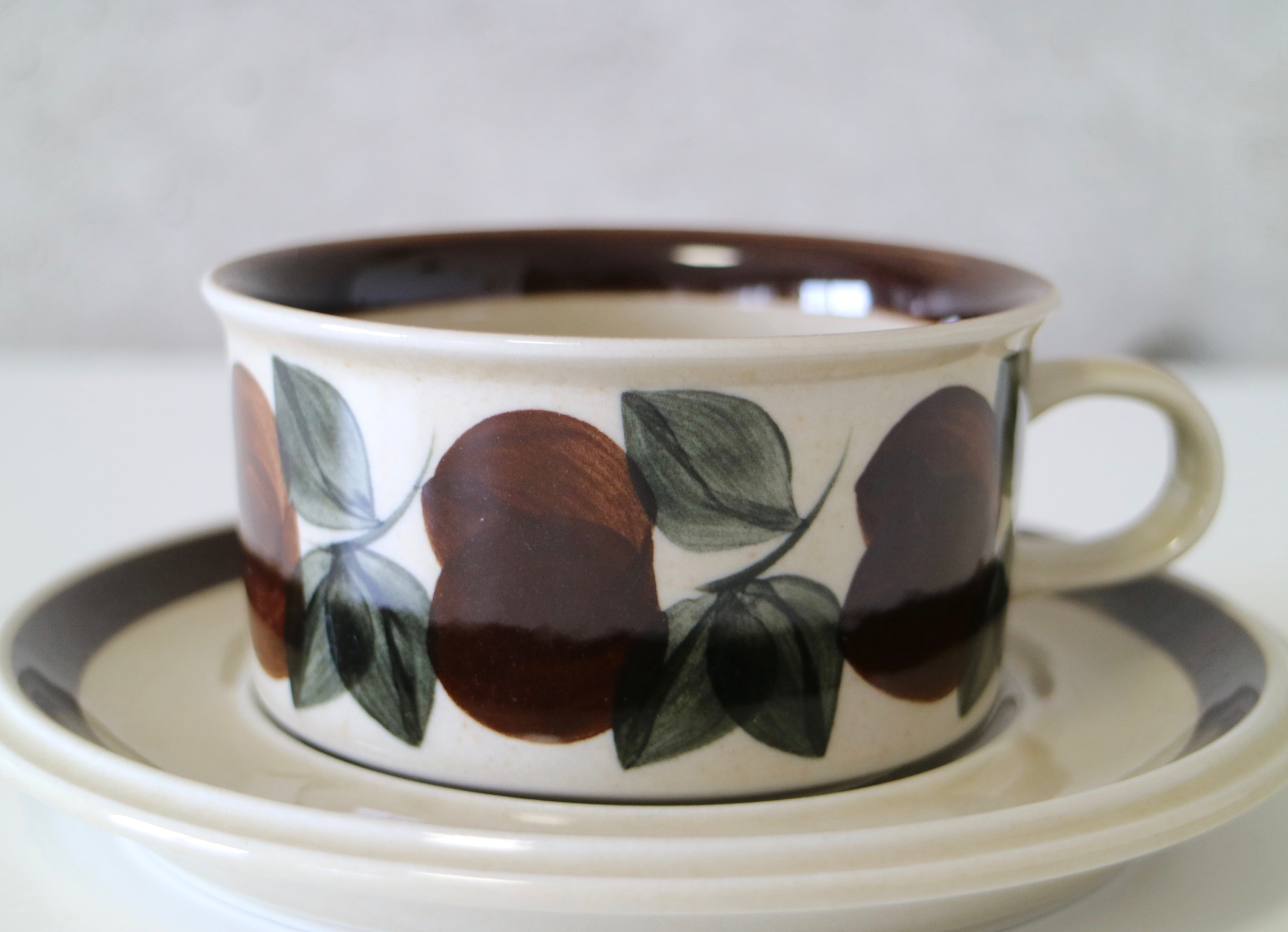 ARABIA社Ruija(ルイヤ)のティーカップ &ソーサーです。デザインはライヤ・ウオシッキネンで、カップに葉がハンドペイントで描かれており、とてもこころ温まる作品です。