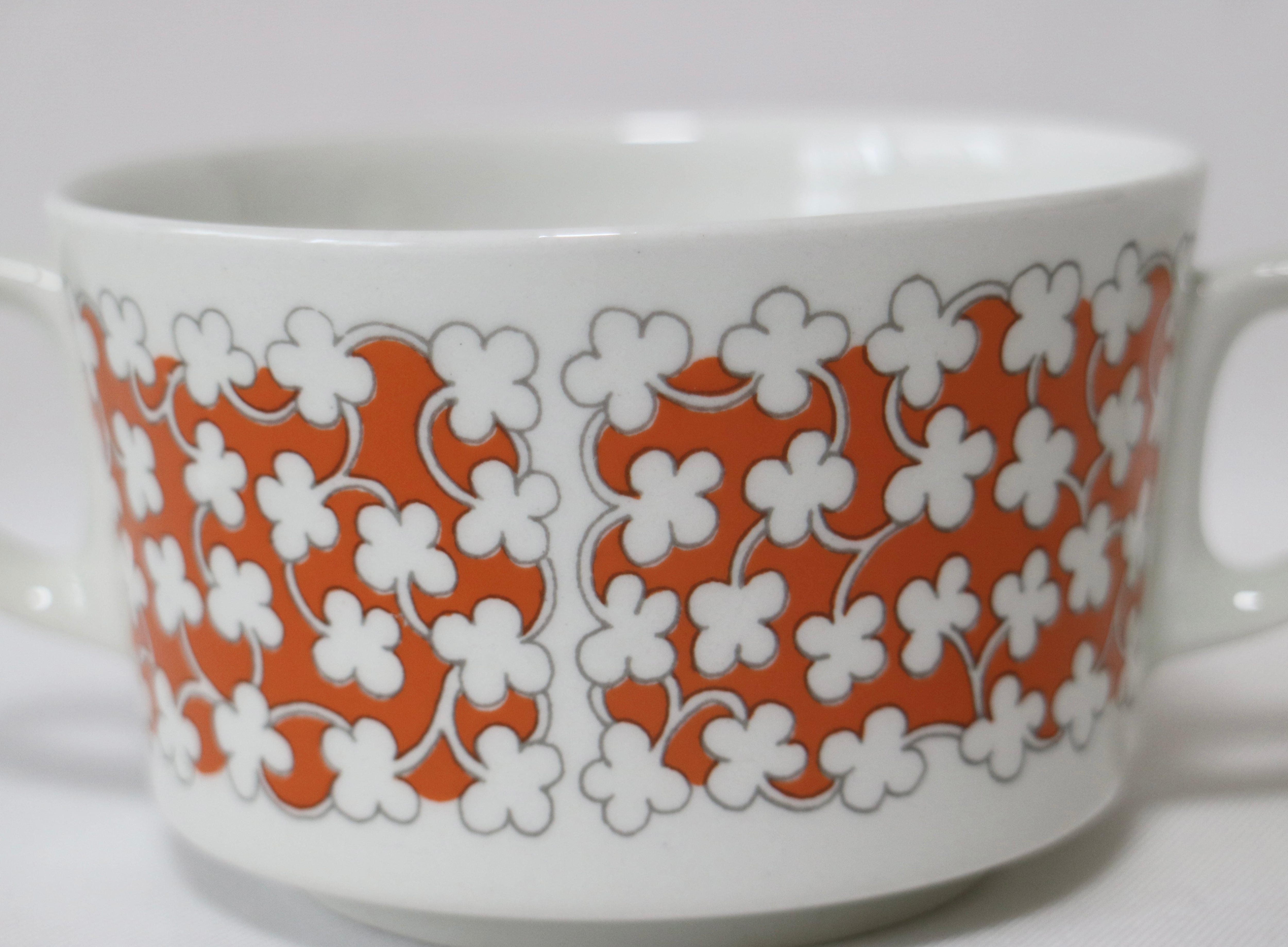 ARABIA社のシュガーボウルです。どこかレトロな雰囲気でクローバーが沢山描かれています。ビタミンカラーのオレンジが鮮やかですね。