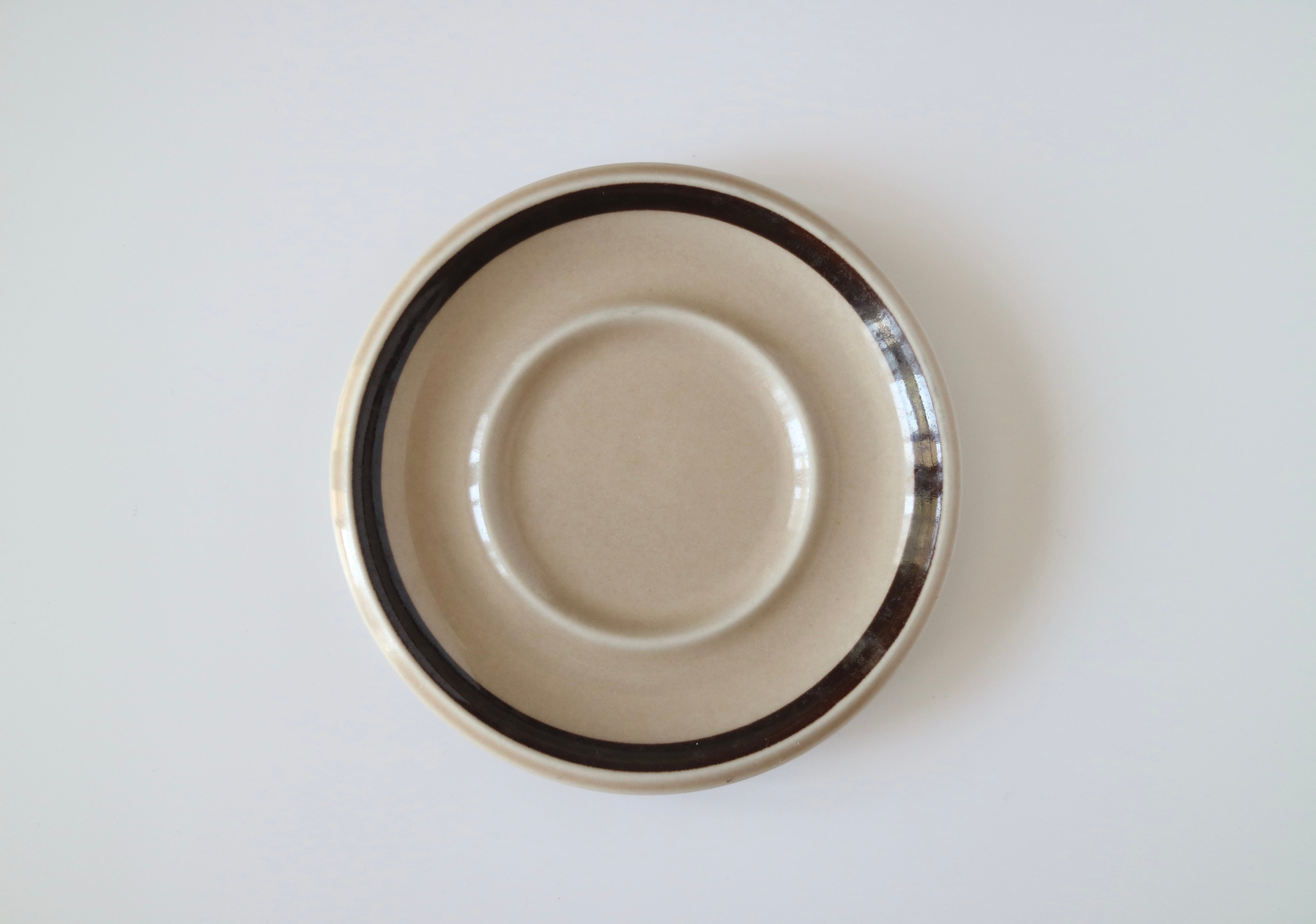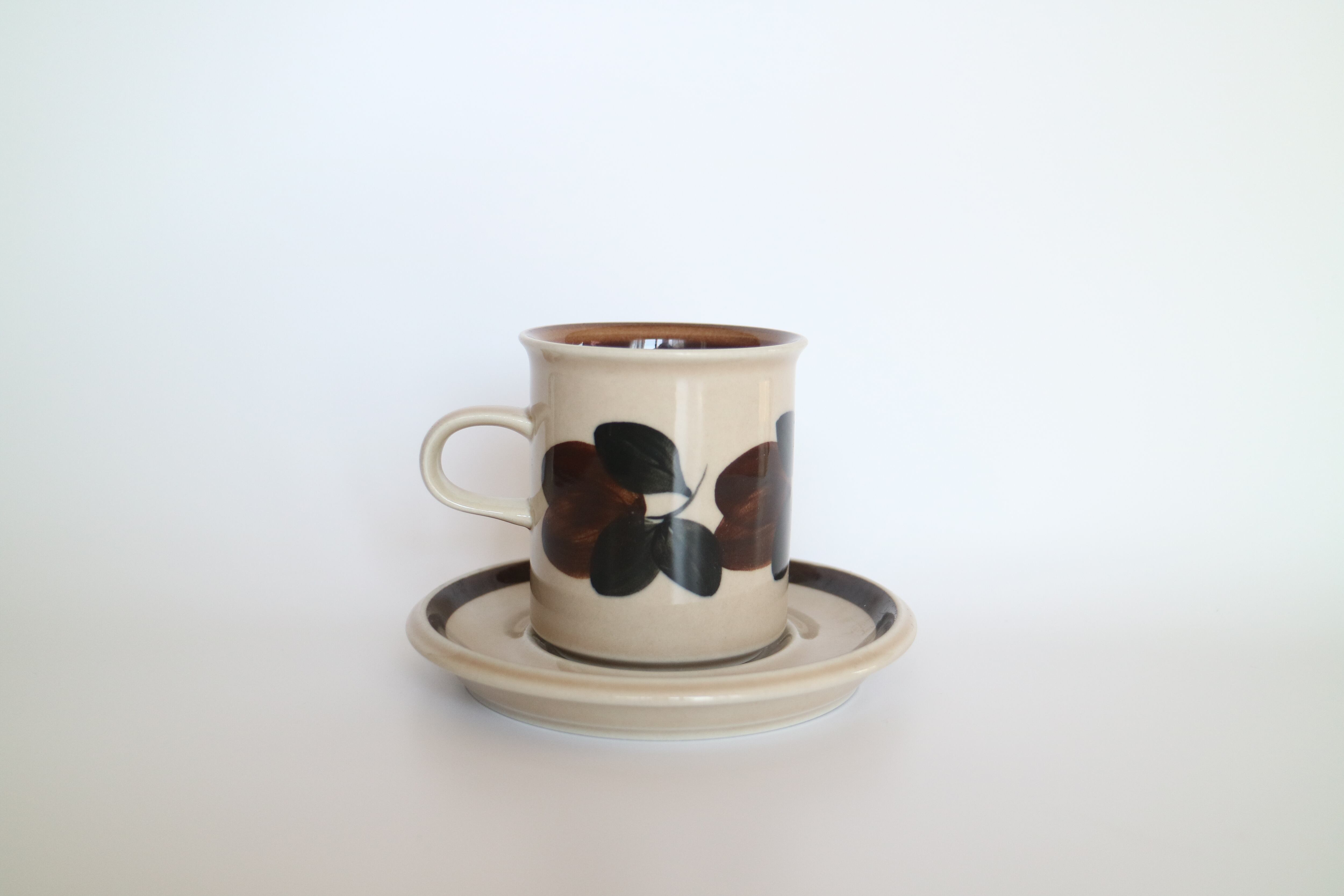 ARABIA社Ruija(ルイヤ)のコーヒーカップ&ソーサ+プレート(17cm)のトリオセットです。ベースのベージュカラーに、ブラウンやグリーンで手描きの葉っぱや実の絵柄が描かれています。