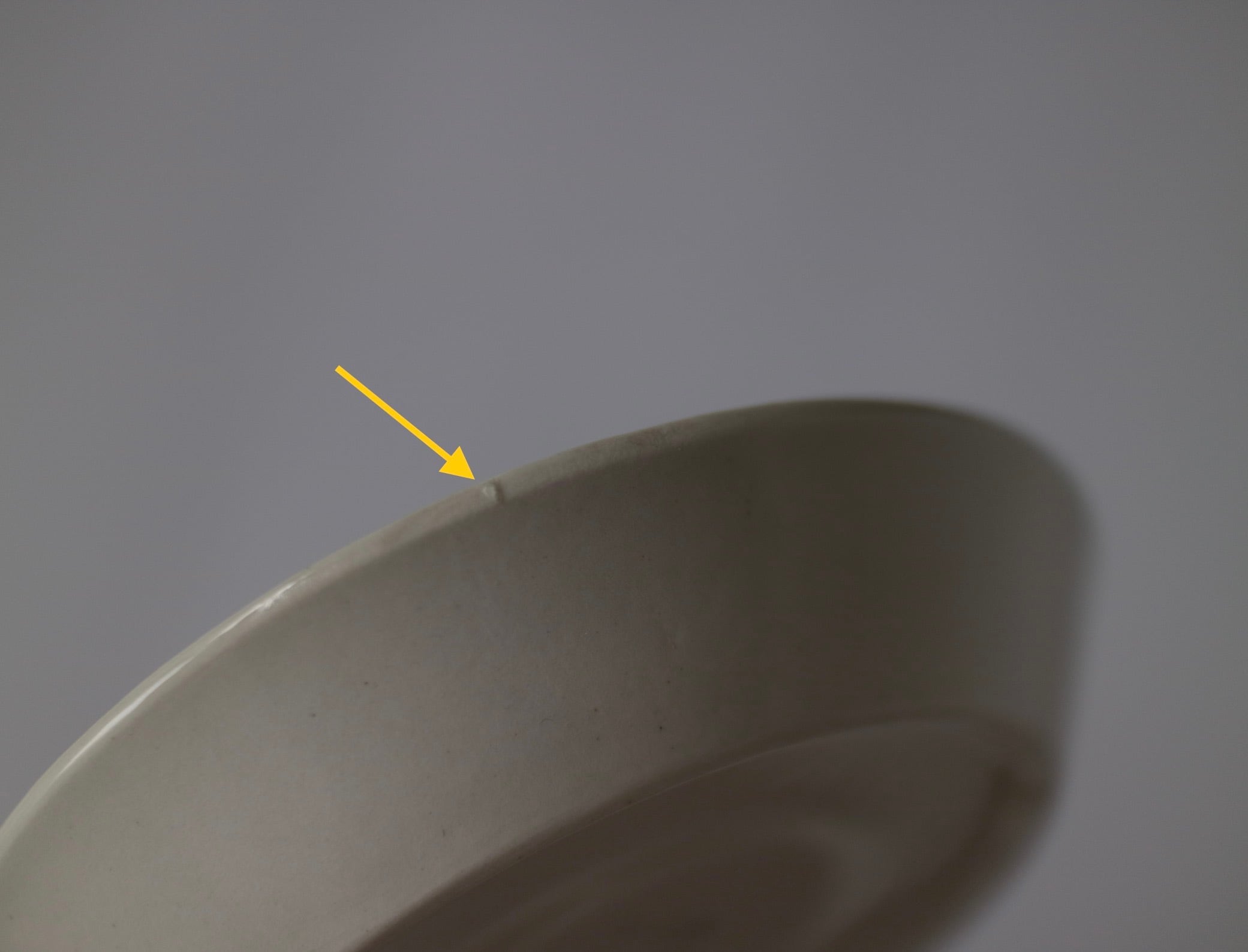 写真13枚目 製造時に出来たと思われる凸があります。その他、ソーサーに僅かなカトラリー痕、着色、支柱跡が見られます。