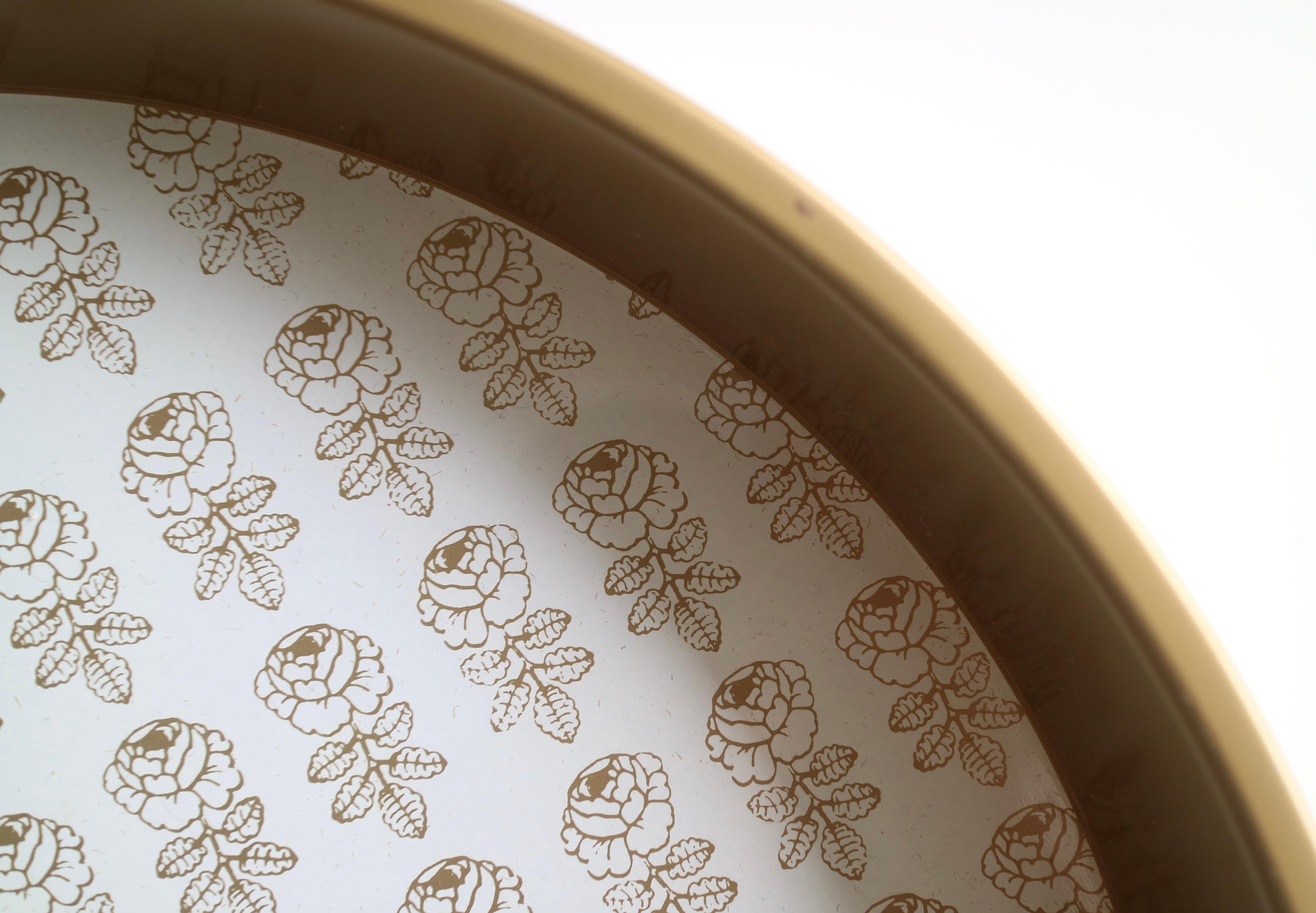 marimekko社 ピックルース柄の丸いブリキのトレイです。こちらはなかなか市場に出回らない珍しいお品となります。レトロ感たっぷりで、トレイの側面までピックルース柄が描かれていてとても可愛いデザインです。
