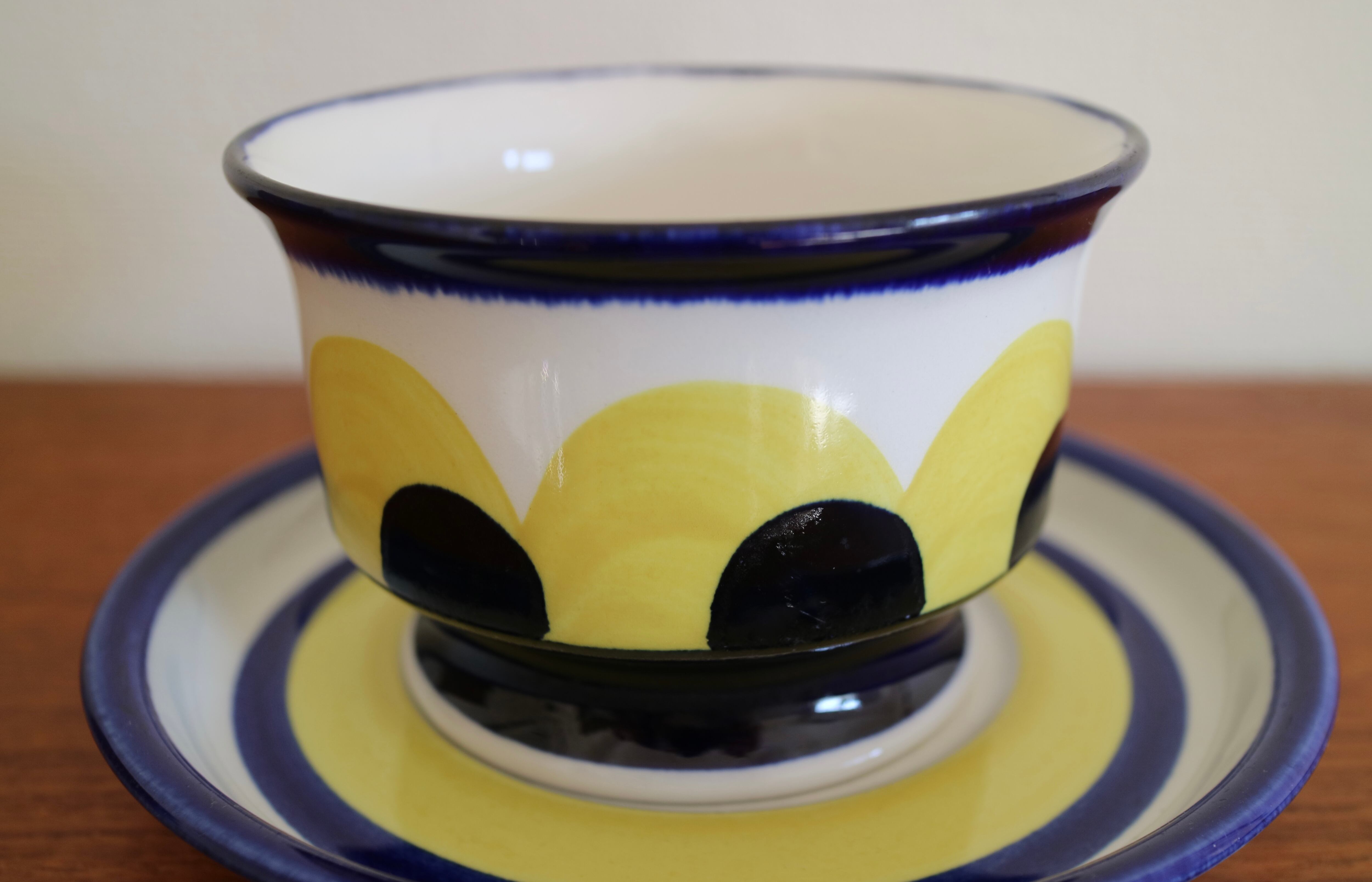 ARABIA社のPaju/パユシリーズのティーカップ&ソーサーです。フォルムはNDモデルで(他にValenciaシリーズなどがあります)、イエローとネイビーの半円がハンドペイントで綺麗に描かれています。