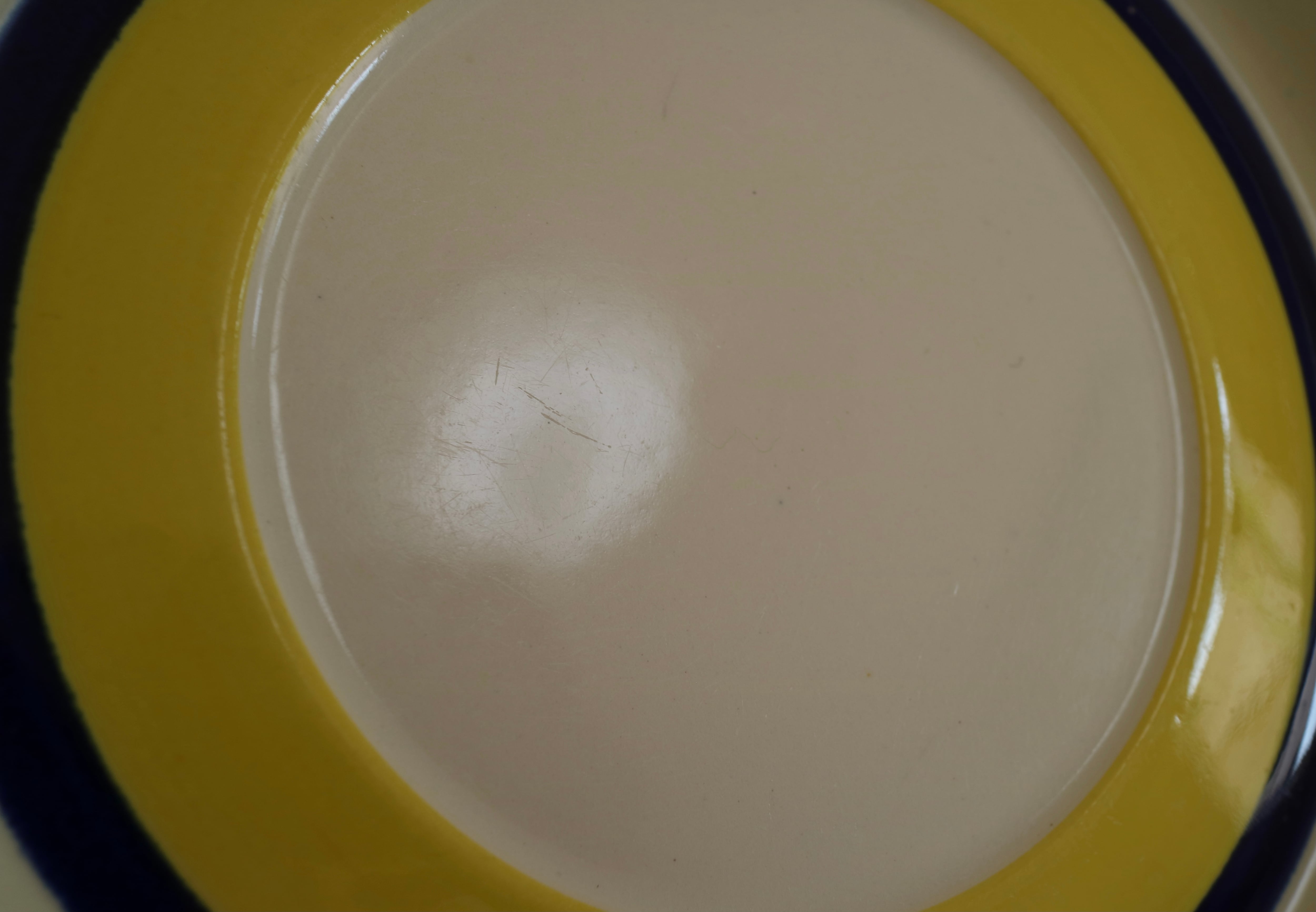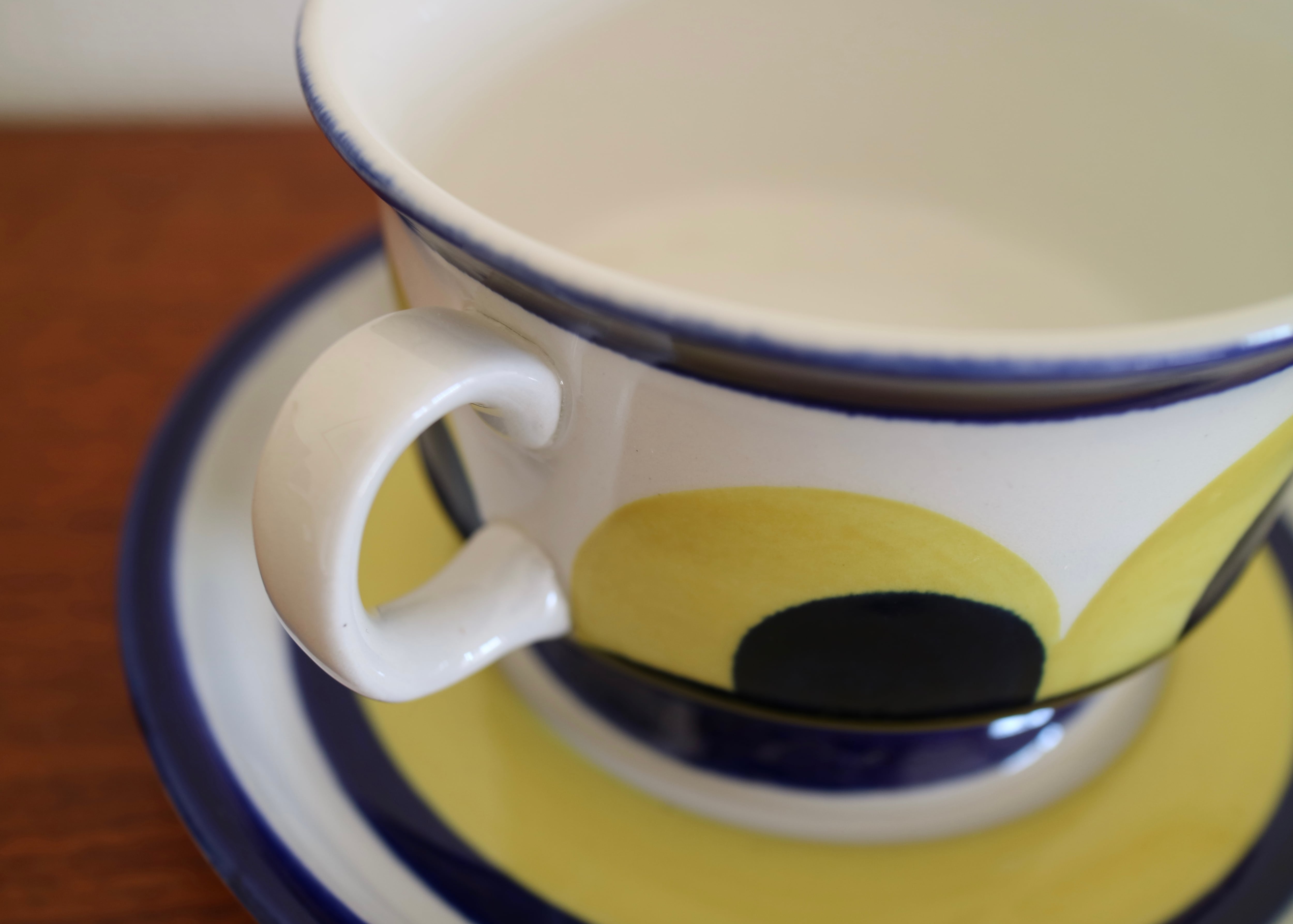 ARABIA社のPaju/パユシリーズのティーカップ&ソーサーです。フォルムはNDモデルで(他にValenciaシリーズなどがあります)、イエローとネイビーの半円がハンドペイントで綺麗に描かれています。