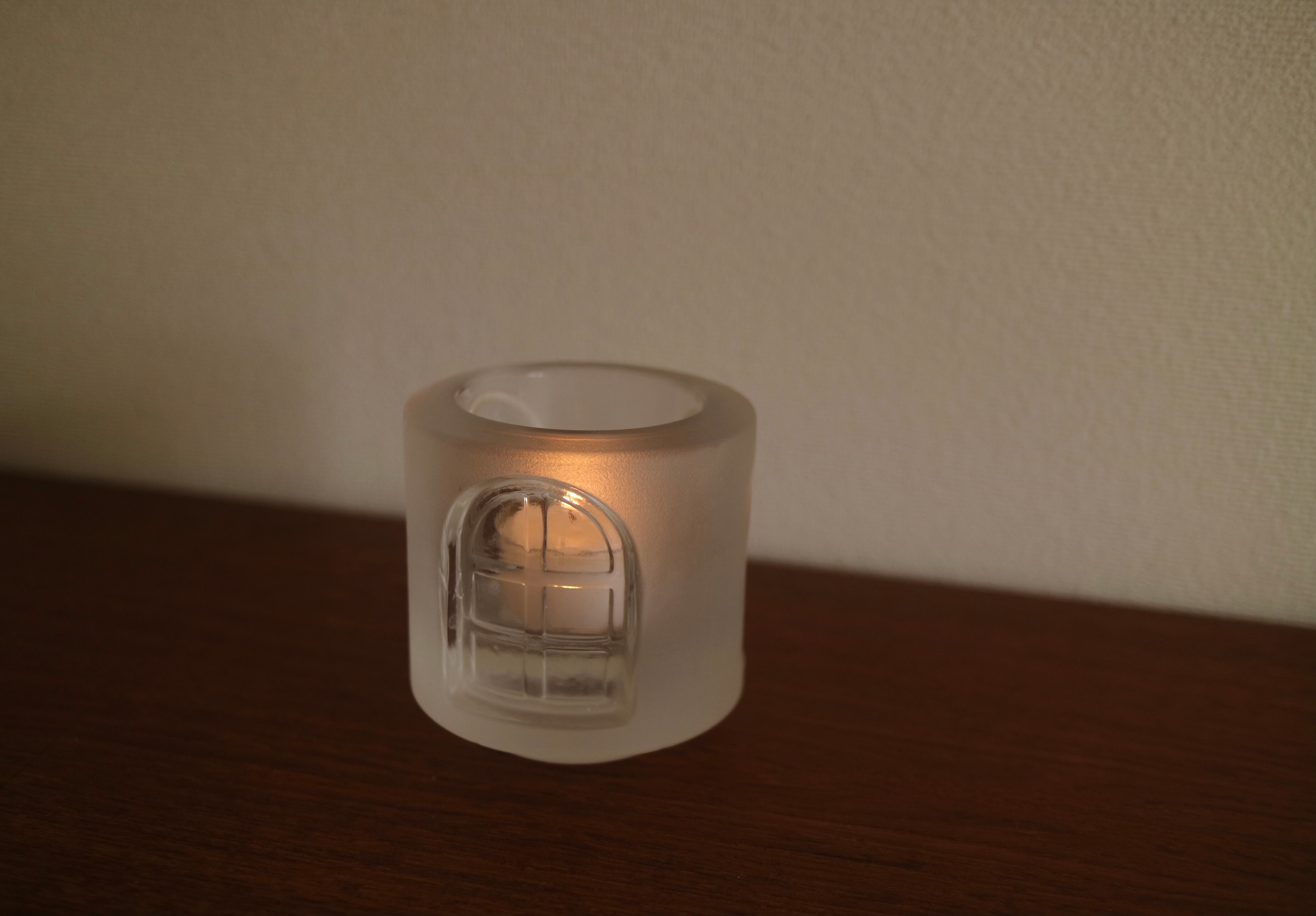 フィンランド、イッタラのBalladi(バラディ)のキャンドルホルダー 大です。バラディとはフィンランド語でバラード(物語るような歌)を意味します。家の形を模して、壁は摺りガラス、窓の部分は透明ガラスにして、光が窓からこぼれる様な演出をしてくれます。デザインはJorma Vennola(ヨルマ・ヴェンノラ)。Balladiシリーズには、吊り下げて使うタイプや背の高いものなど様々な形のキャンドルホルダーがありますが、こちらは卓上タイプです。
