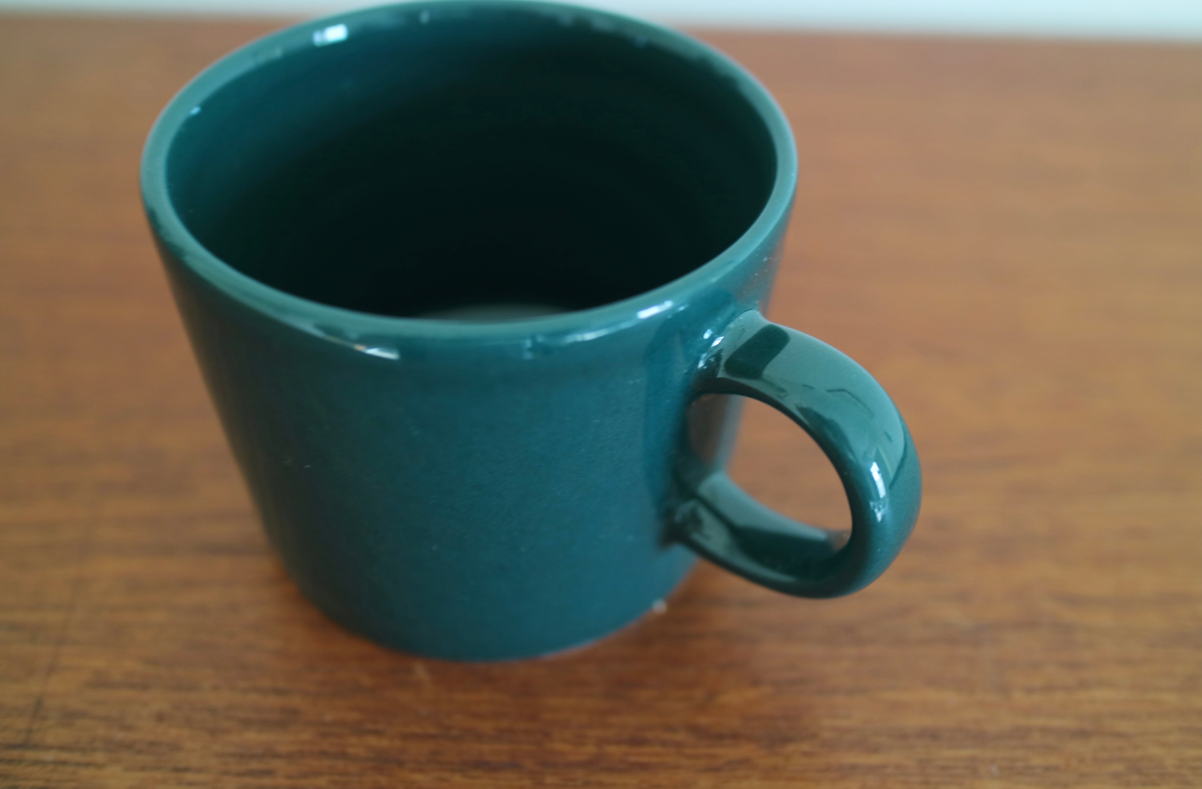 北欧の定番アイテム、Kaj Franck(カイ・フランク)デザインのTEEMA(ティーマ)のコーヒーカップ&ソーサーです。こちらは2005年で廃盤となったダークグリーンカラー。ソーサーはくぼみがなくフラットなので、単体で小皿としても使うことができます。