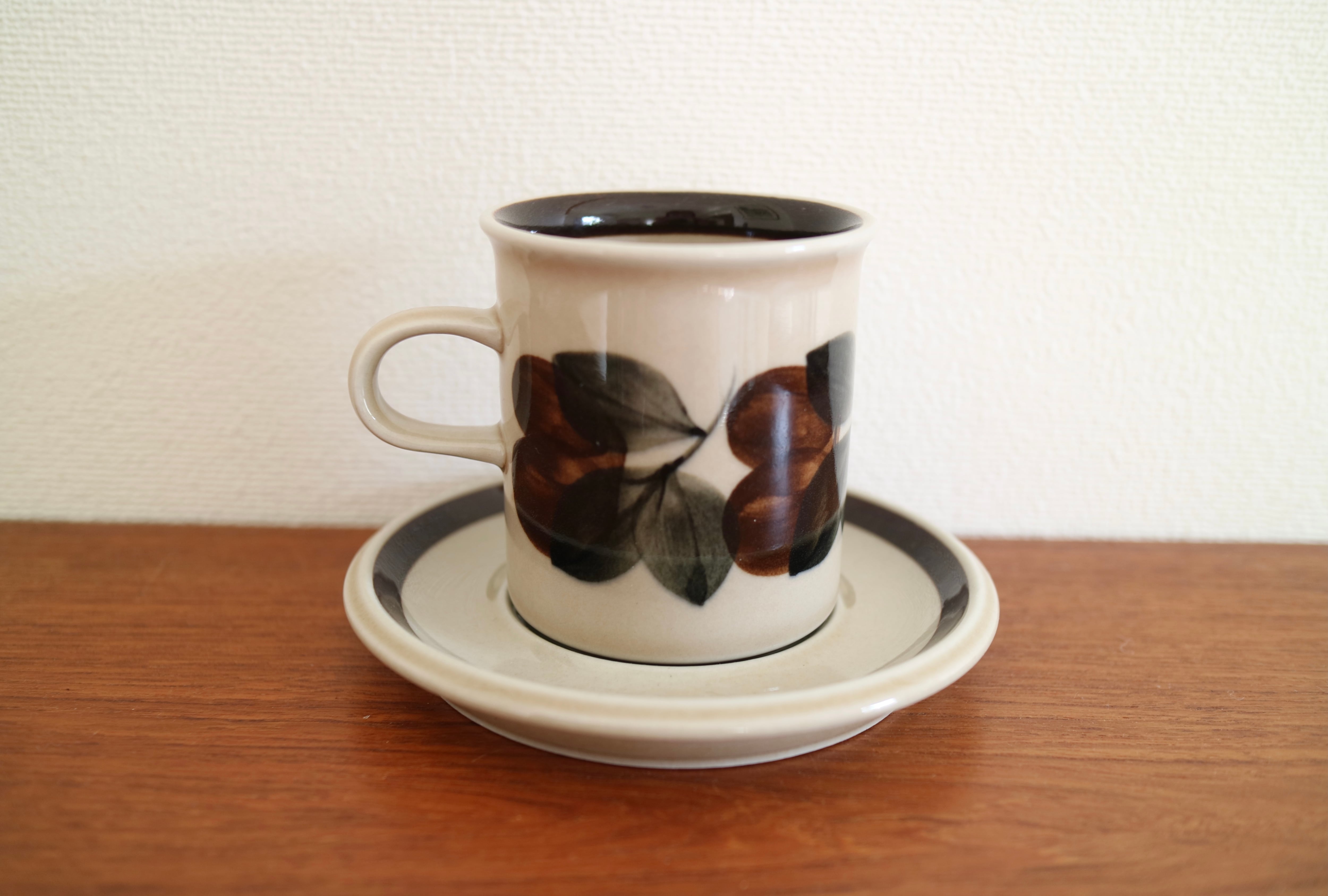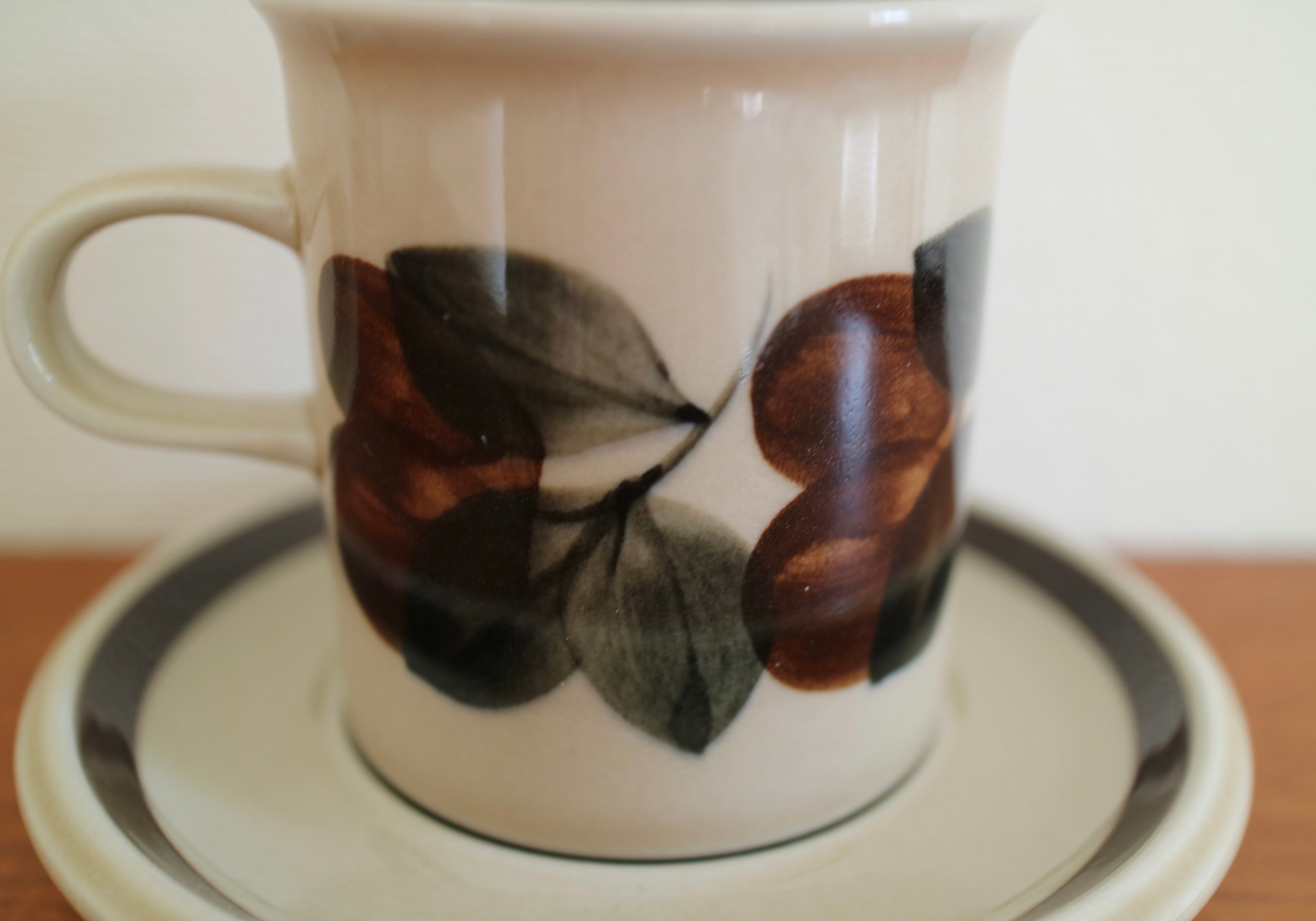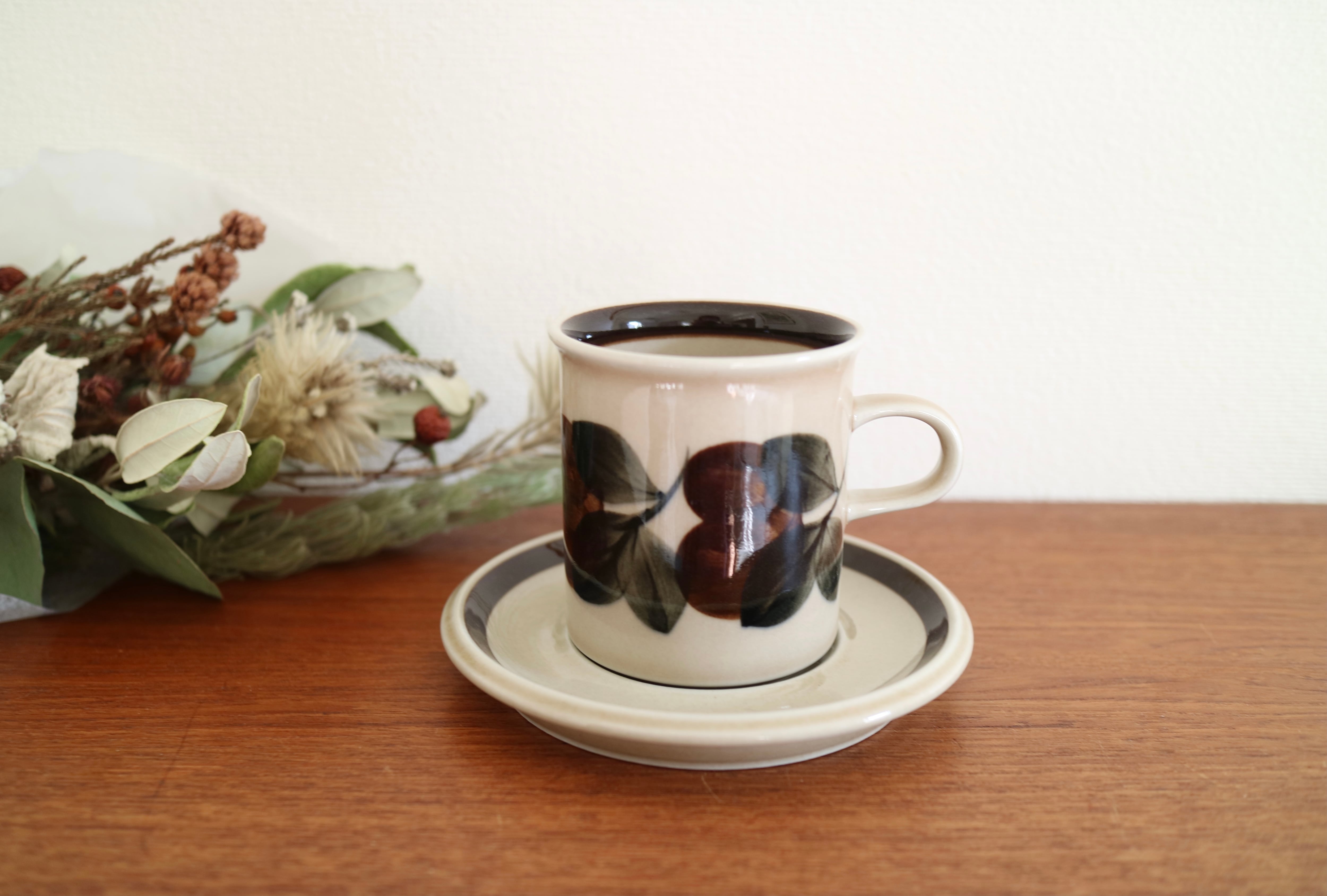 ARABIA社Ruija(ルイヤ)のコーヒーカップ&ソーサーです。ベースのベージュカラーに、ブラウンやグリーンで手描きの葉っぱや実の絵柄が描かれています。 北欧食器のぬくもりを感じられるデザインです。