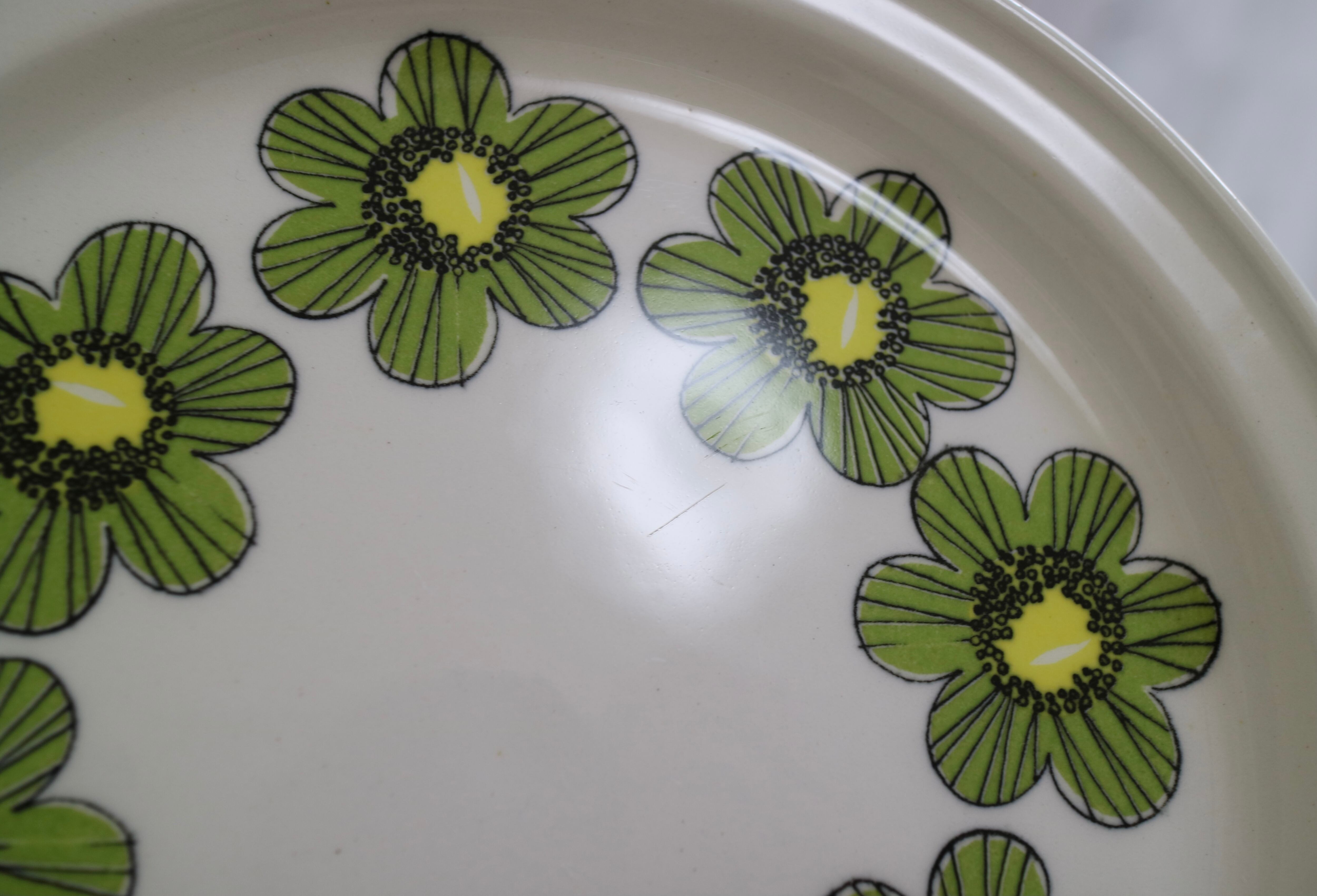 ARABIA社、Primavera (プリマヴェーラ) シリーズのケーキプレートです。Primavera はイタリア語で “春” を意味します。春らしいグリーンカラーの明るいお花がプレートにぐるりと描かれています。こちらは1969年~73年の5年間のみ製造された商品となり製造期間も短く、近年では非常に入手困難なお品となっております。