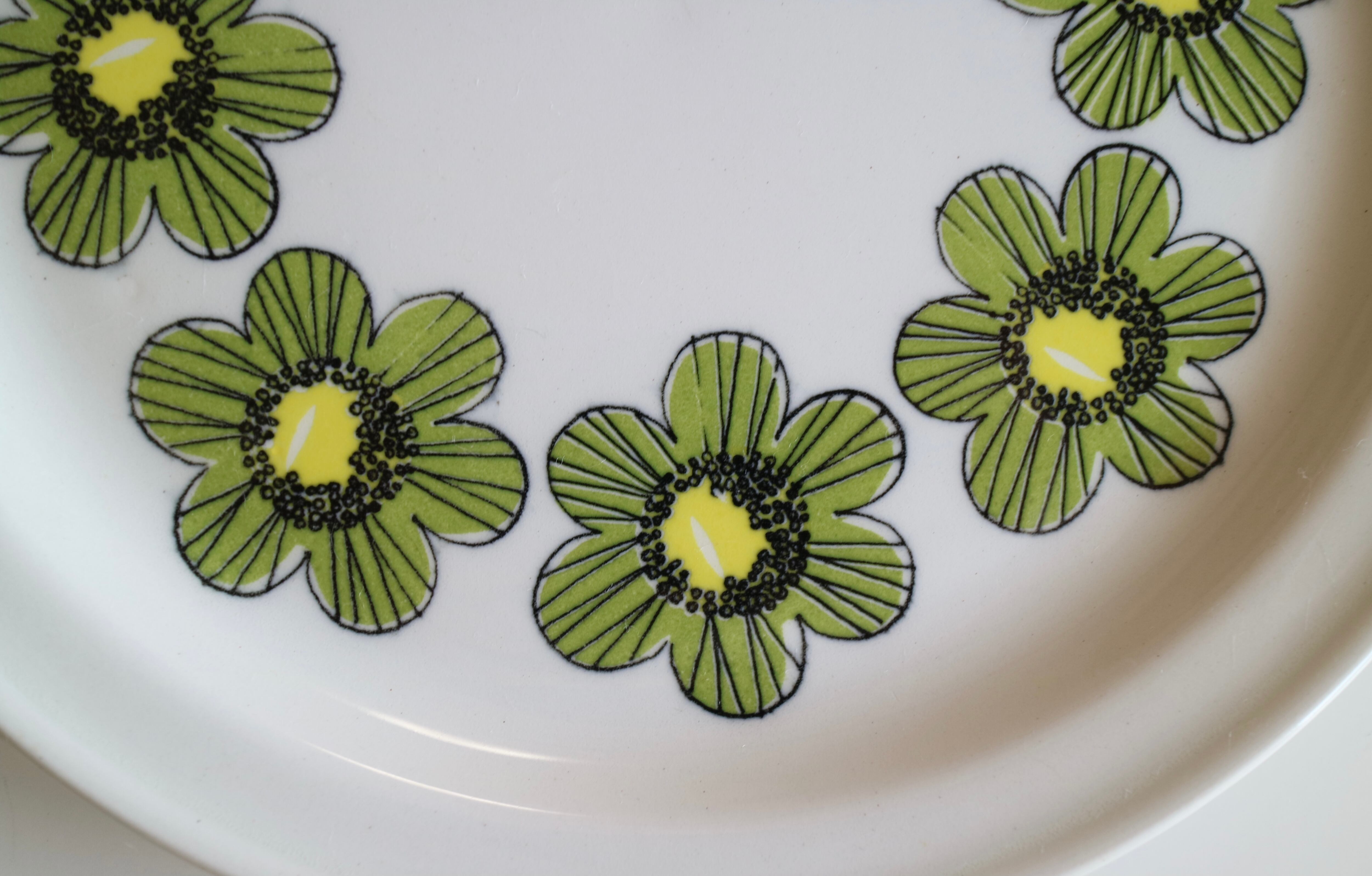 ARABIA社、Primavera (プリマヴェーラ) シリーズのケーキプレートです。Primavera はイタリア語で “春” を意味します。春らしいグリーンカラーの明るいお花がプレートにぐるりと描かれています。こちらは1969年~73年の5年間のみ製造された商品となり製造期間も短く、近年では非常に入手困難なお品となっております。