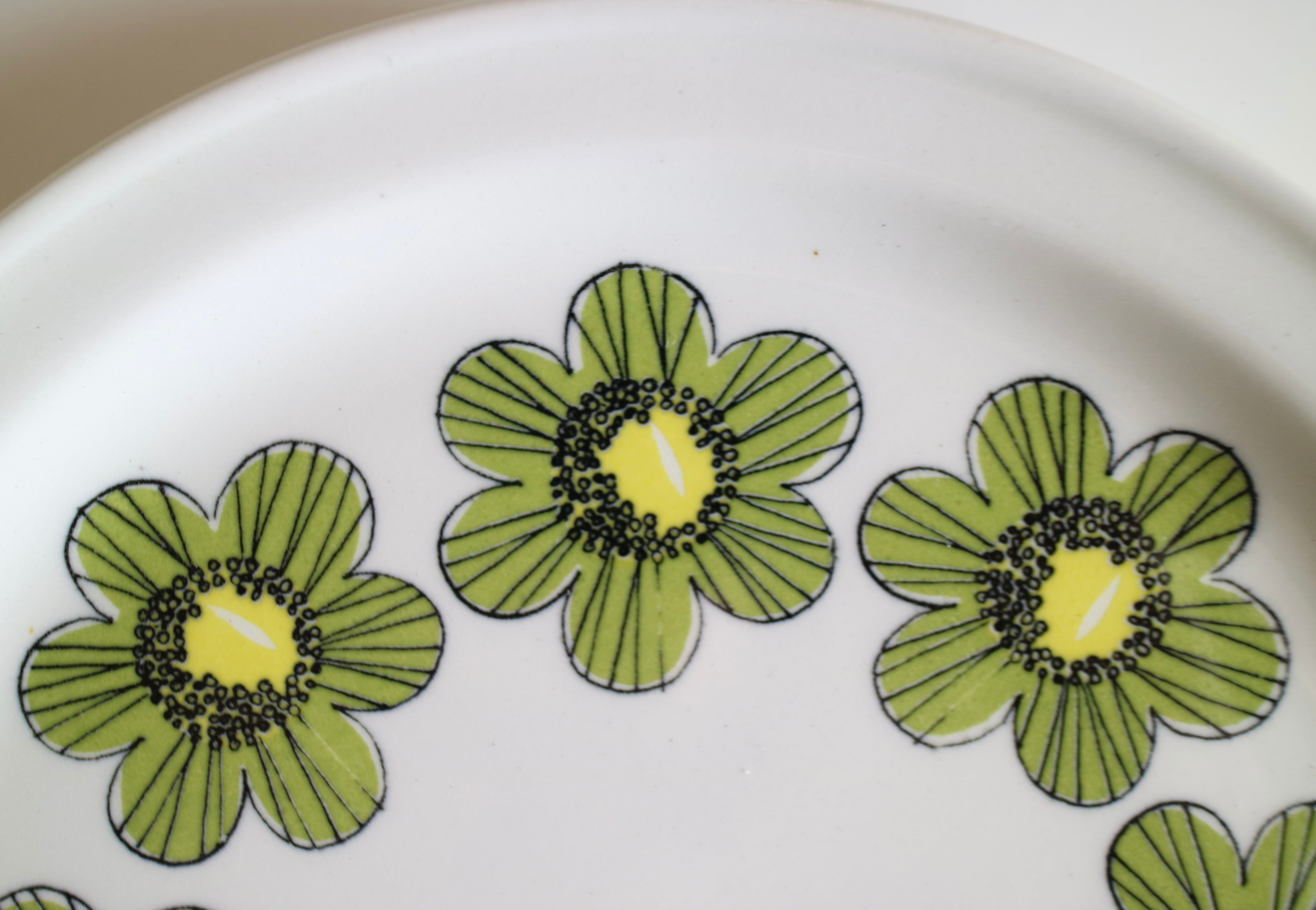 ARABIA社、Primavera (プリマヴェーラ) シリーズのケーキプレートです。Primavera はイタリア語で “春” を意味します。春らしいグリーンカラーの明るいお花がプレートにぐるりと描かれています。こちらは1969年~73年の5年間のみ製造された商品となり製造期間も短く、近年では非常に入手困難なお品となっております。