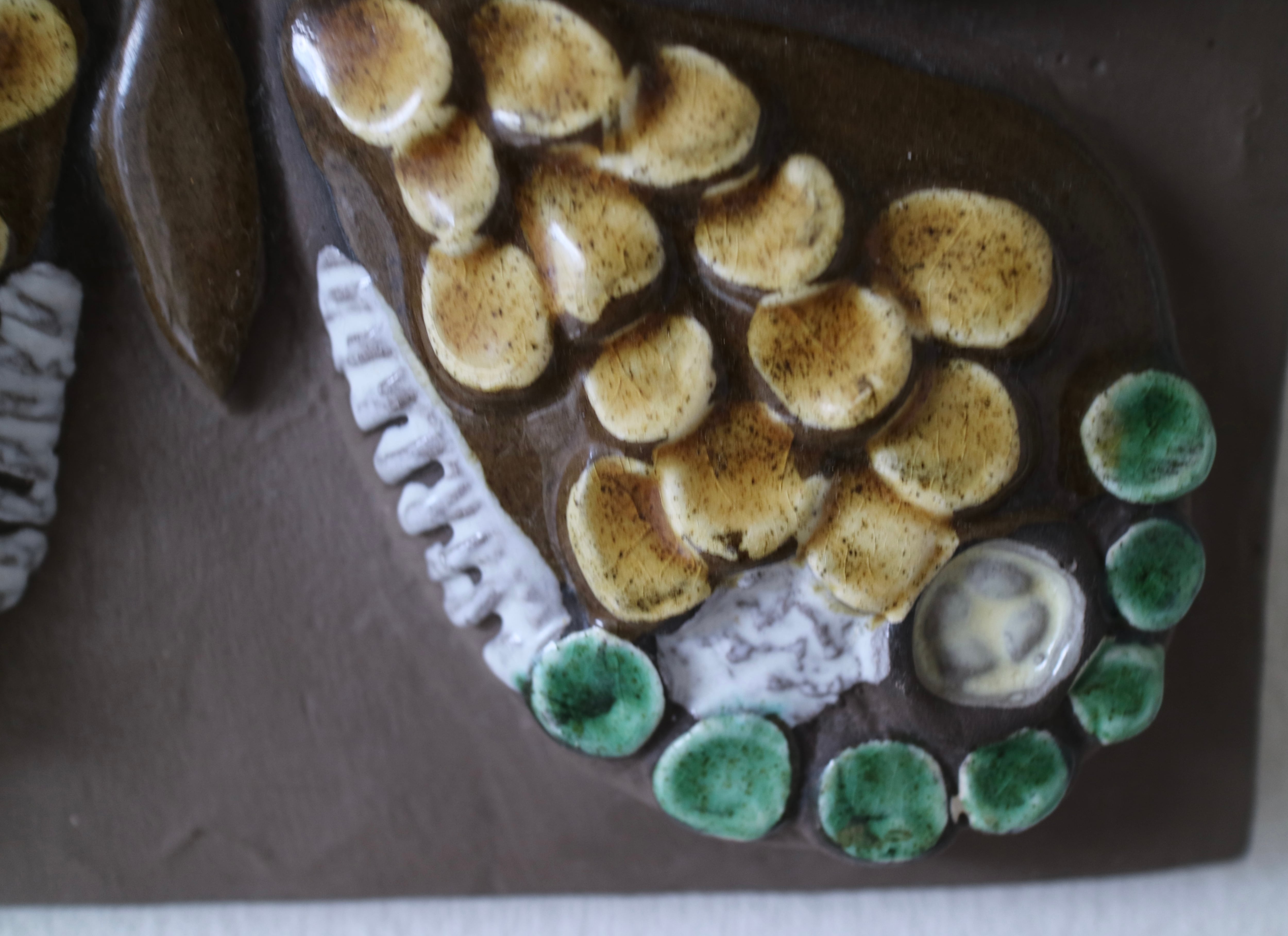 壁掛けタイプの陶板で大胆にデザインされた蝶はハンドメイドで作られており温もりを感じます。