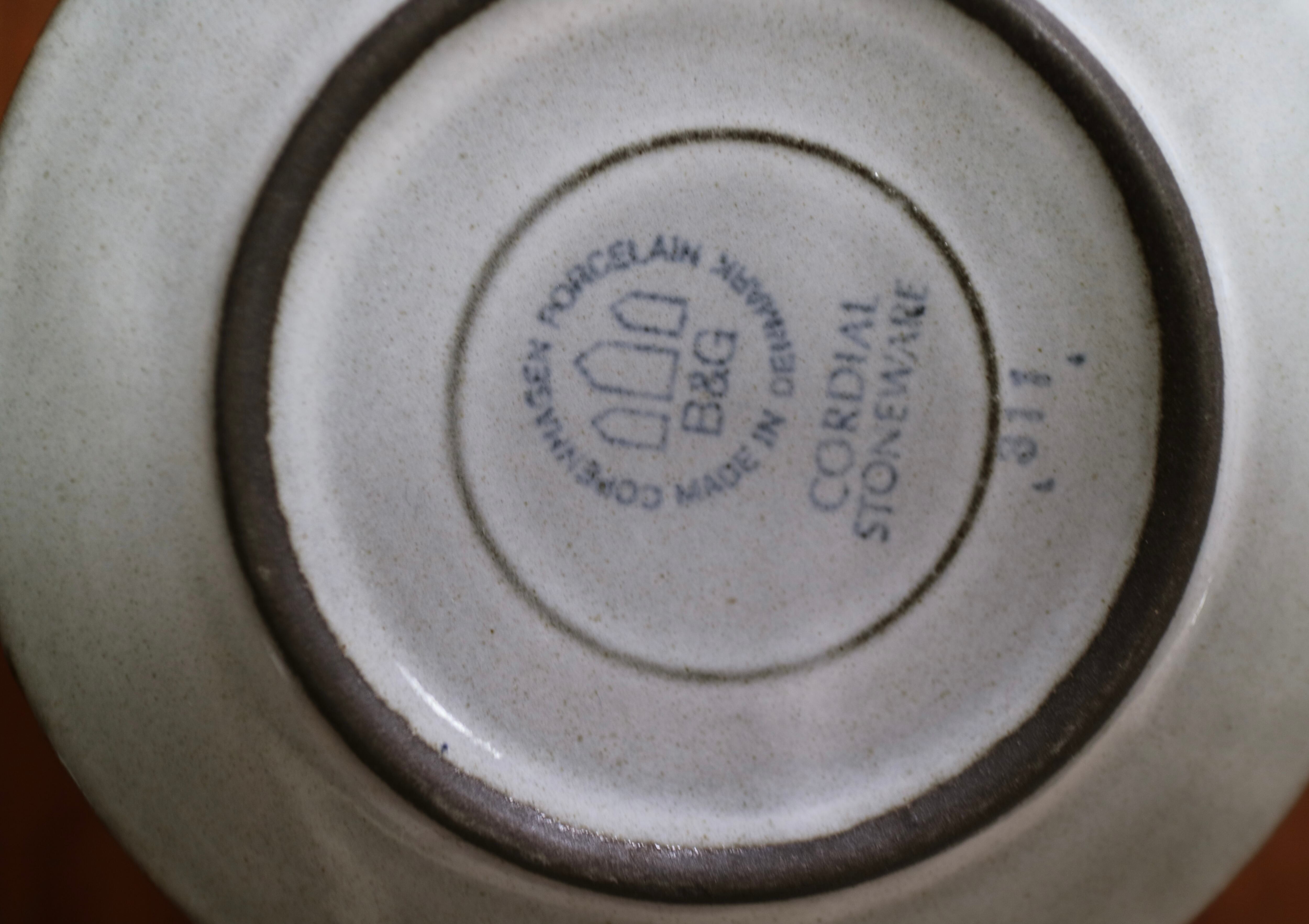 製造会社が3度変遷したため、製造された年代によって、刻印も様々です。初期の頃には刻印はなくシールが貼られていました。Kronjyden(クロニーデン1937〜)、Nissen(ニッセン1953〜)、Bing & Grondahl (ビング・オー・グレンダール1977〜)の3社のものがあります。こちらのお品はBing & Grondahl社製です。