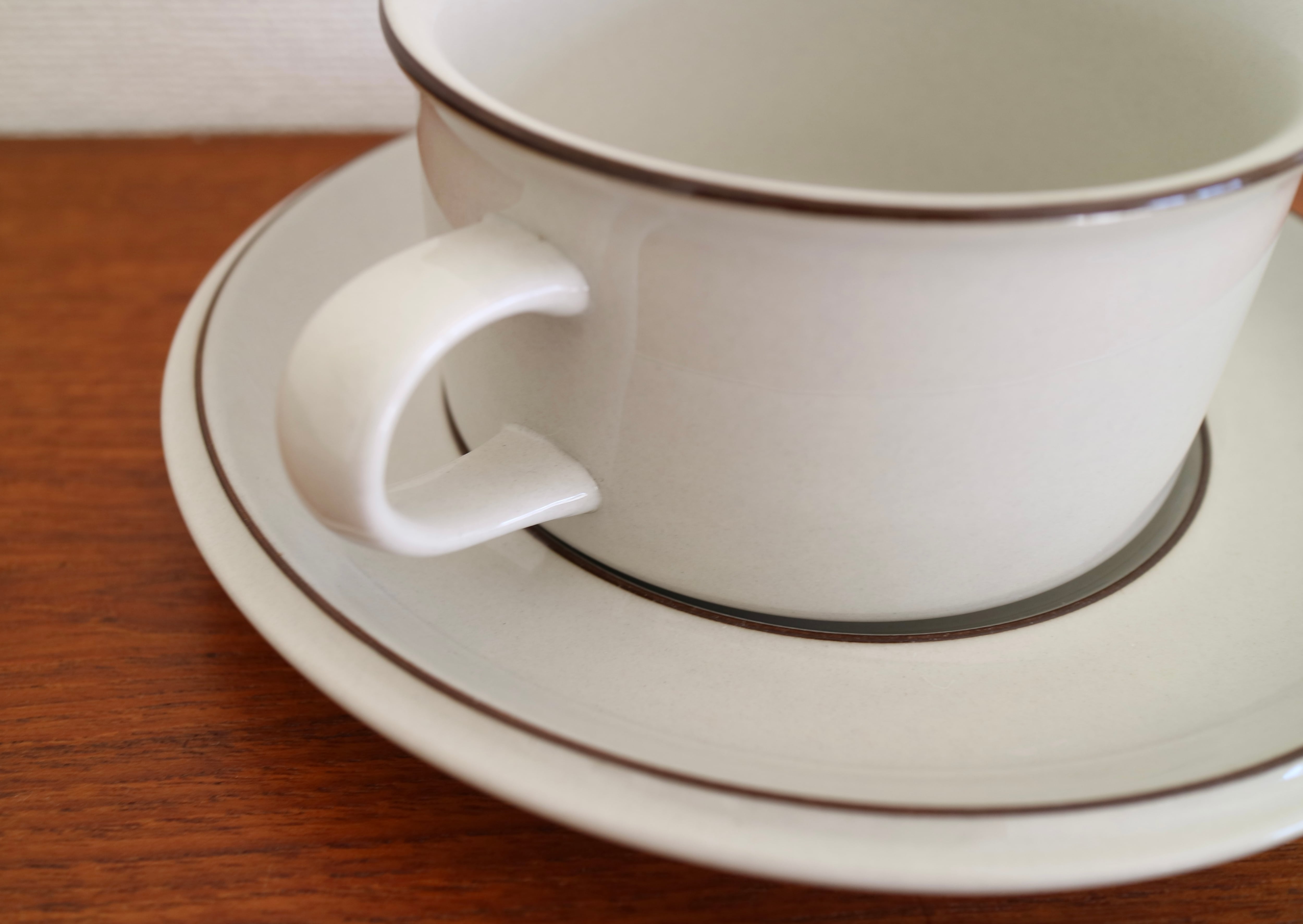 ARABIA社Fennica(フェニカ)シリーズのティーカップ&ソーサーです。薄いグレーの地にダークブラウンのラインが入っただけのシンプルなデザイン。飽きることなく長くご愛用いただけるデザインです。