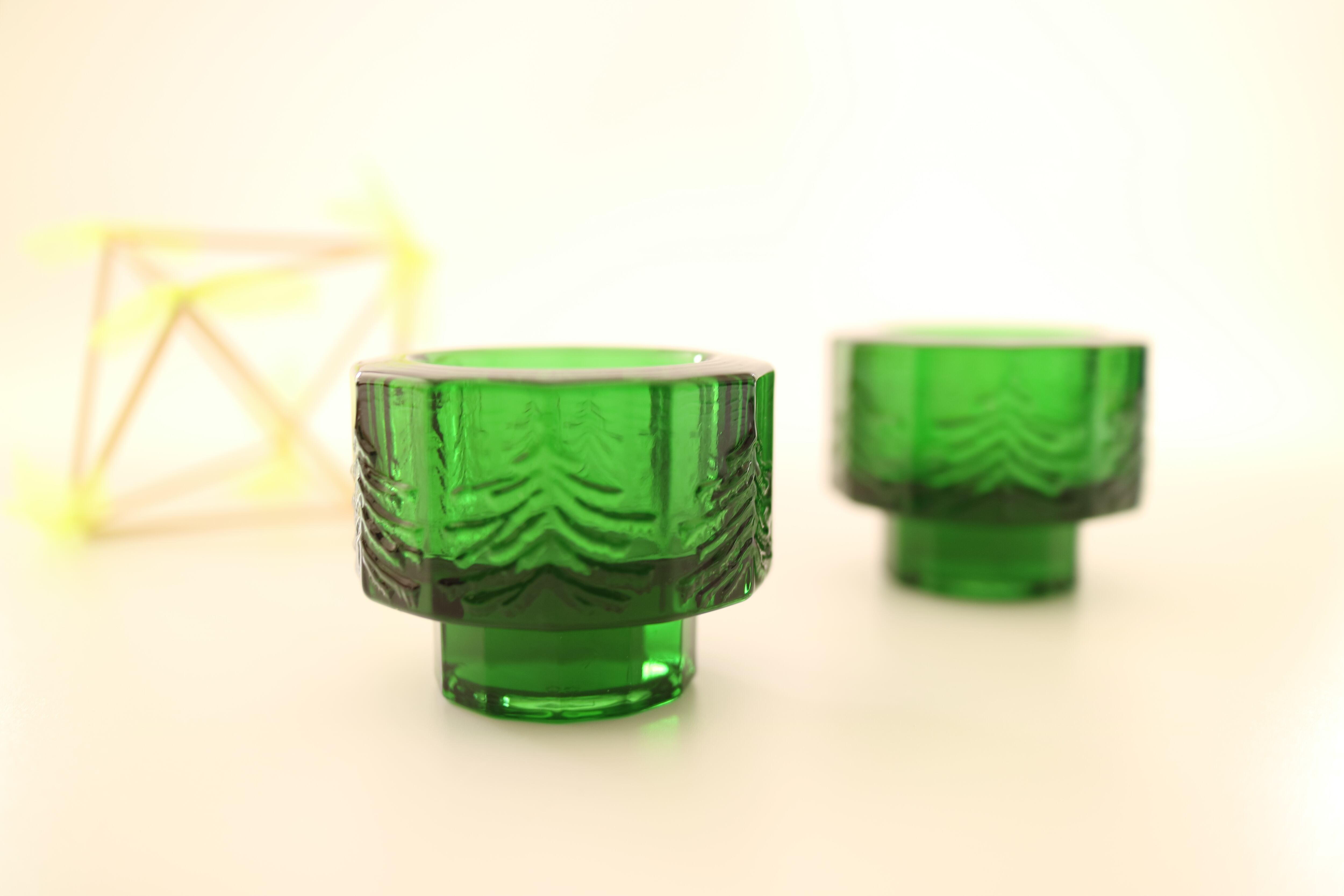 Jorma Vennola (ヨルマ・ヴェンノラ)がデザインした"KUUSI"シリーズのキャンドルホルダー(小サイズ)です。通常はクリアカラーですが、こちらは希少なグリーンカラーのキャンドルホルダーです。