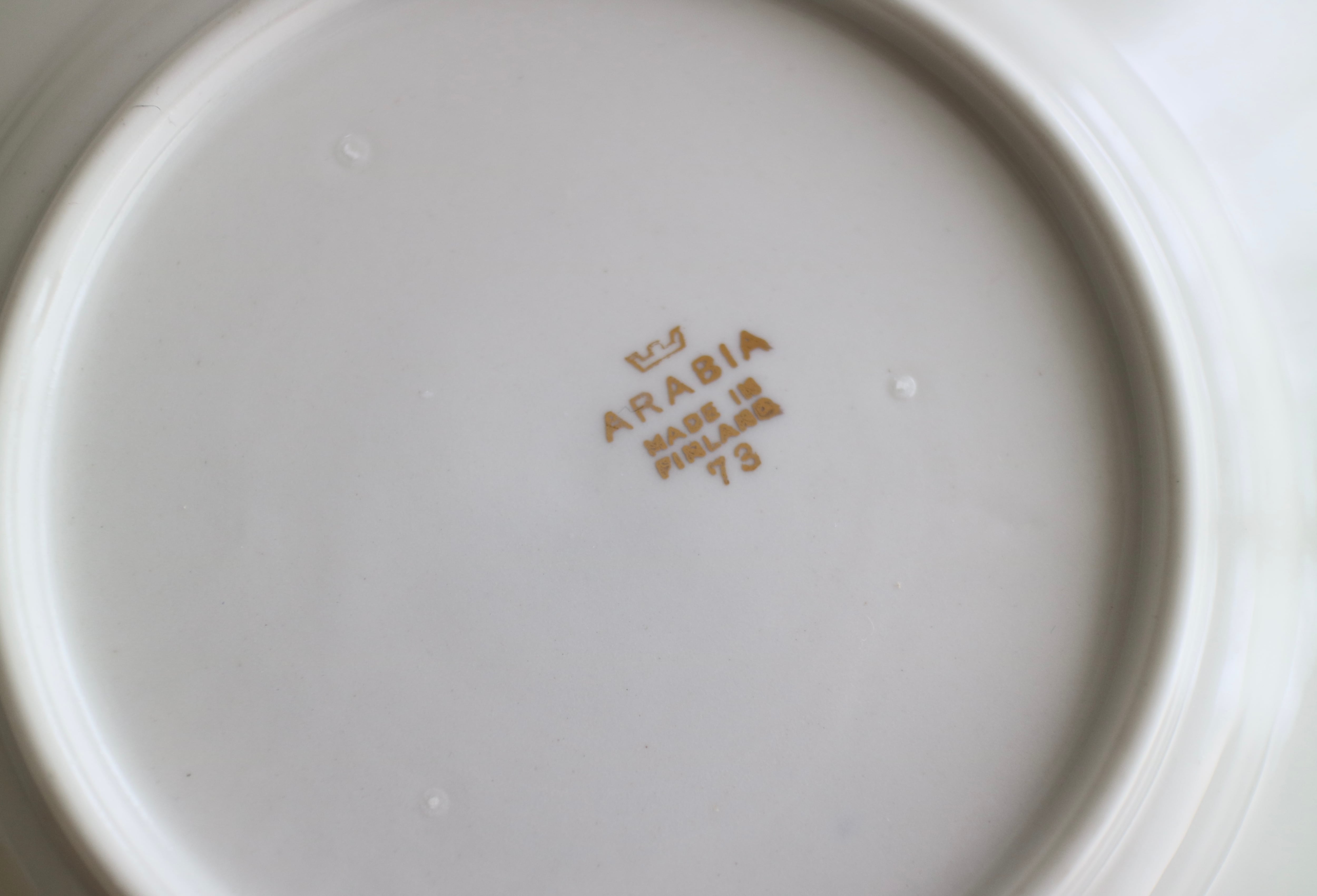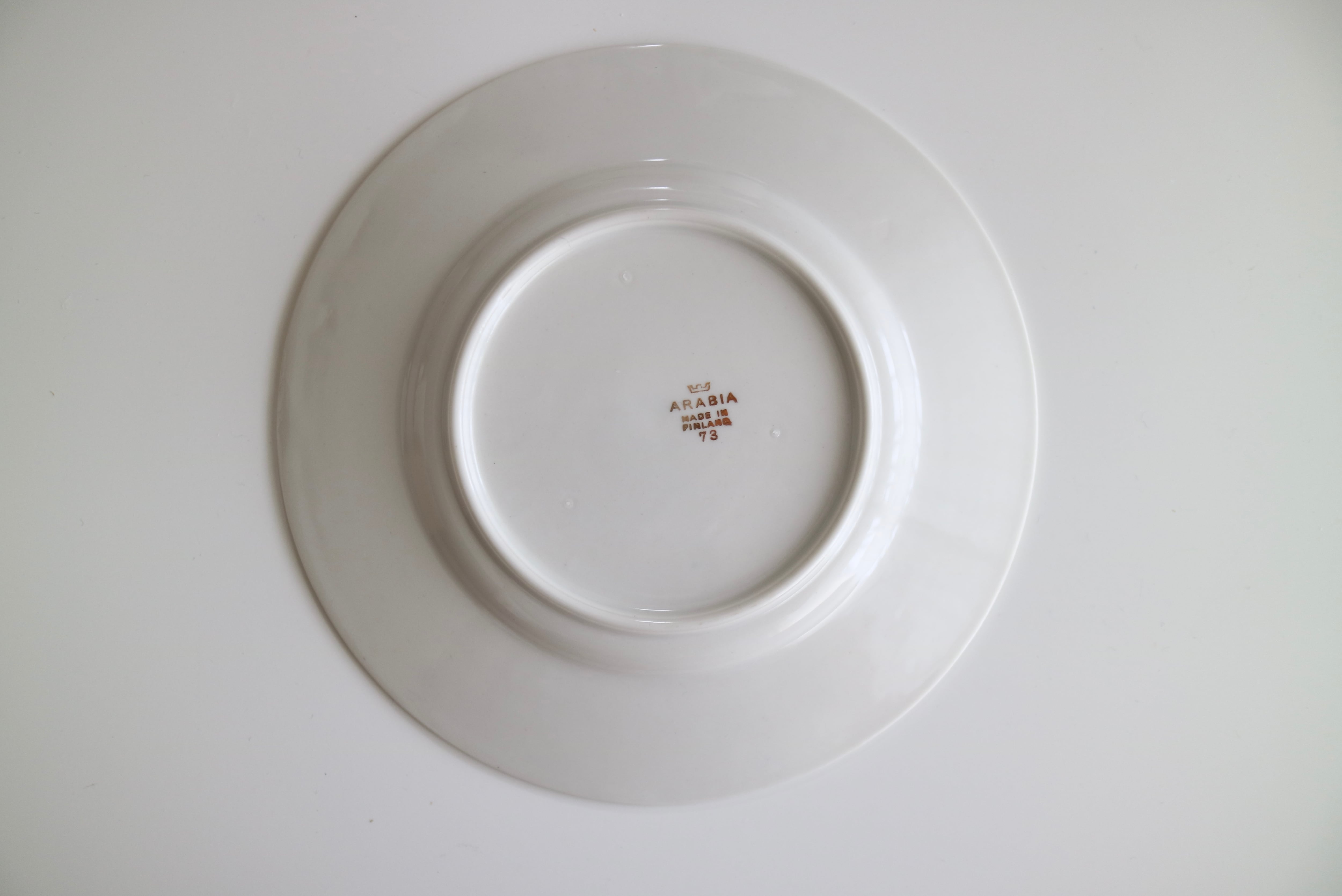 ARABIA社のピンクのお花が描かれたプレートです。お皿の真ん中に1つ、リムに4つ可愛らしい小さなお花が描かれています。